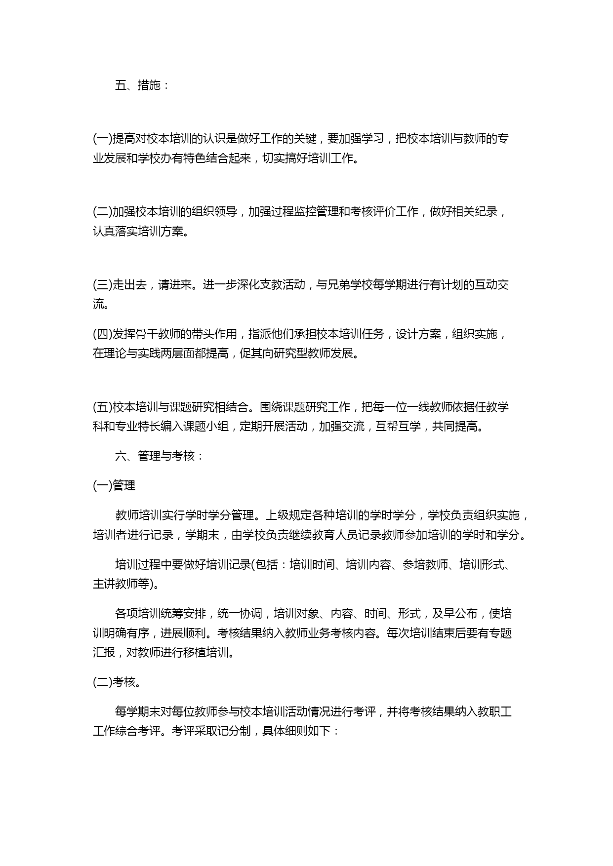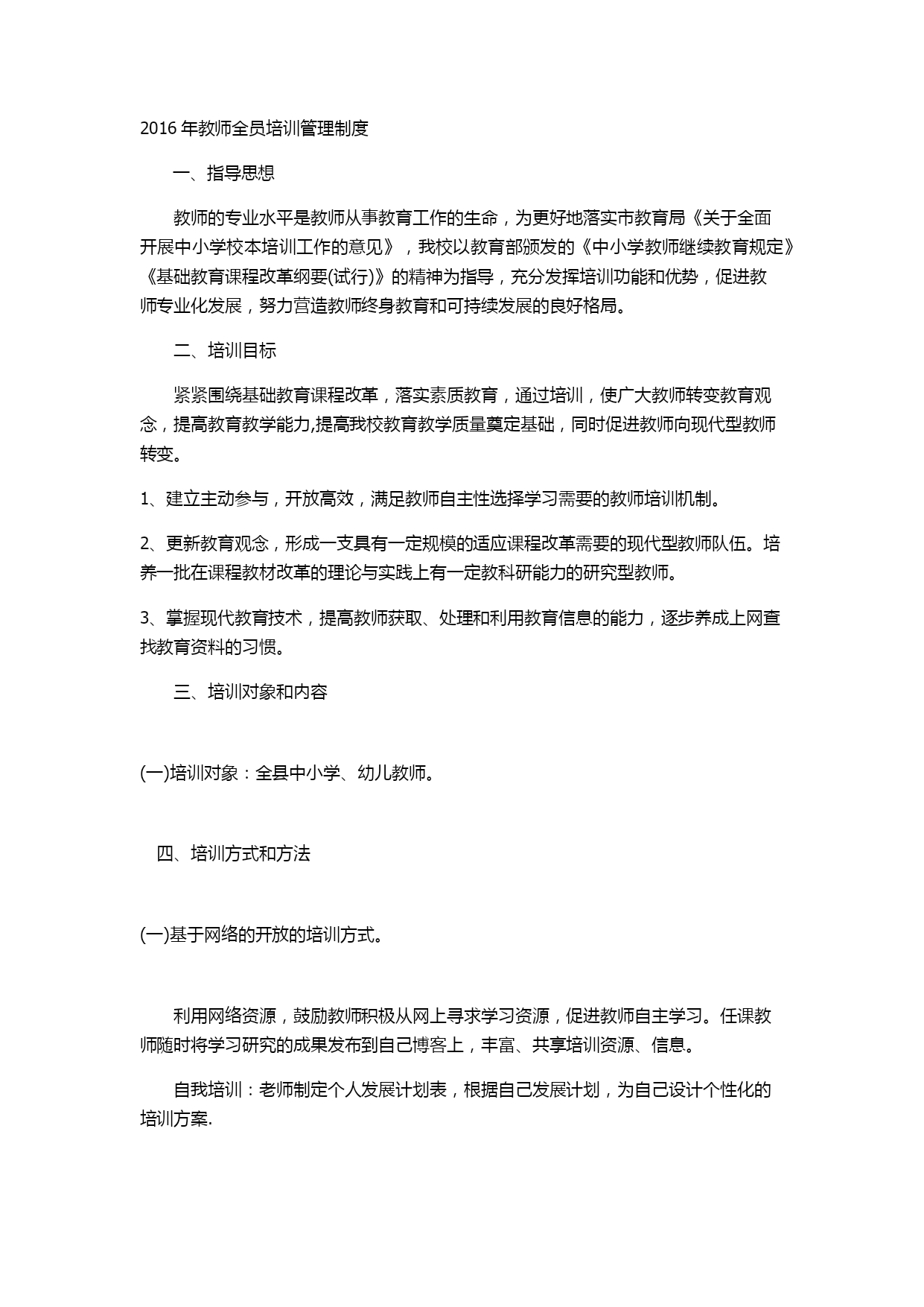 2016年教师全员培训管理制度 一、指导思想 教师的专业水平是教师从事教育工作的生命,为更好地落实市教育局《关于全面开展中小学校本培训工作的意见》,我校以教育部颁发的《中小学教师继续教育规定》《基础教育课程改革纲要(试行)》的精神为指导,充分发挥培训功能和优势,促进教师专业化发展,努力营造教师终身教育和可持续发展的良好格局。 二、培训目标 紧紧围绕基础教育课程改革,落实素质教育,通过培训,使广大教师转变教育观念,提高教育教学能力,提高我校教育教学质量奠定基础,同时促进教师向现代型教师转变。 1、建立主动参与,开放高效,满足教师自主性选择学习需要的教师培训机制。 2、更新教育观念,形成一支具有一定规模的适应课程改革需要的现代型教师队伍。培养一批在课程教材改革的理论与实践上有一定教科研能力的研究型教师。 3、掌握现代教育技术,提高教师获取、处理和利用教育信息的能力,逐步养成上网查找教育资料的习惯。 三、培训对象和内容 (一)培训对象:全县中小学、幼儿教师。 四、培训方式和方法 (一)基于网络的开放的培训方式。 利用网络资源,鼓励教师积极从网上寻求学习资源,促进教师自主学习。任课教师随时将学习研究的成果发布到自己博客上,丰富、共享培训资源、信息。 自我培训:老师制定个人发展计划表,根据自己发展计划,为自己设计个性化的培训方案. 五、措施: (一)提高对校本培训的认识是做好工作的关键,要加强学习,把校本培训与教师的专业发展和学校办有特色结合起来,切实搞好培训工作。 (二)加强校本培训的组织领导,加强过程监控管理和考核评价工作,做好相关纪录,认真落实培训方案。 (三)走出去,请进来。进一步深化支教活动,与兄弟学校每学期进行有计划的互动交流。 (四)发挥骨干教师的带头作用,指派他们承担校本培训任务,设计方案,组织实施,在理论与实践两层面都提高,促其向研究型教师发展。 (五)校本培训与课题研究相结合。围绕课题研究工作,把每一位一线教师依据任教学科和专业特长编入课题小组,定期开展活动,加强交流,互帮互学,共同提高。 六、管理与考核: (一)管理 教师培训实行学时学分管理。上级规定各种培训的学时学分,学校负责组织实施,培训者进行记录,学期末,由学校负责继续教育人员记录教师参加培训的学时和学分。 培训过程中要做好培训记录(包括:培训时间、培训内容、参培教师、培训形式、主讲教师等)。 各项培训统筹安排,统一协调,培训对象、内容、时间、形式,及早公布,使培训明确有序,进展顺利。考核结果纳入教师业务考核内容。每次培训结束后要有专题汇报,对教师进行移植培训。 (二)考核。 每学期末对每位教师参与校本培训活动情况进行考评,并将考核结果纳入教职工工作综合考评。考评采取记分制,具体细则如下: 1、按时参加每次校本培训活动记4分,缺席一次扣1分; 2、参加校外各级培训活动每次记3分; 3、按时上交各类材料,每份记1分; 七、组织领导 成立校本培训领导小组,了解学校教师教育教学水平实际现状;明确学校教师队伍建设发展目标;制订校本培训整体方案;落实校本培训具体活动;评估教师参加校本培训的实际效果。