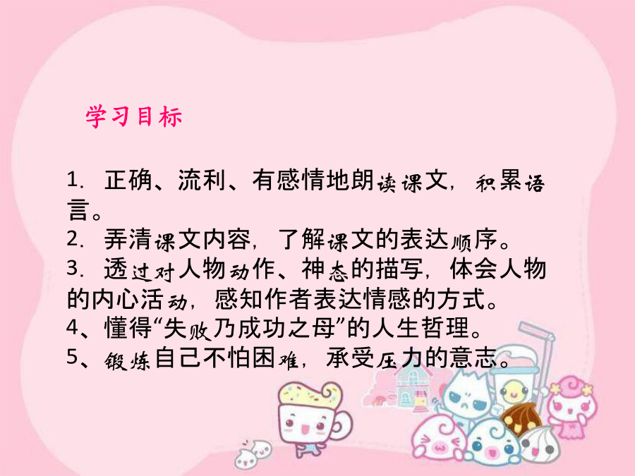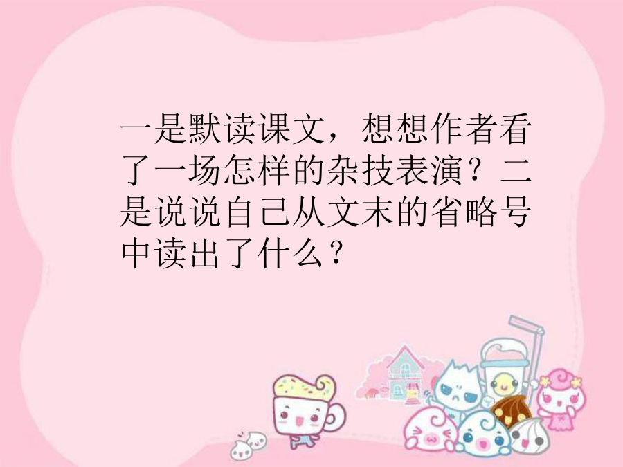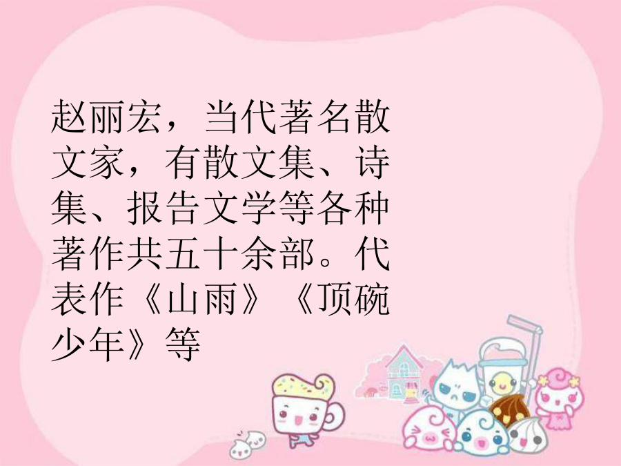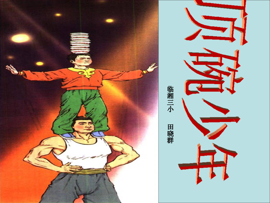 赵丽宏,当代著名散文家,有散文集、诗集、报告文学等各种著作共五十余部。代表作《山雨》《顶碗少年》等学习目标疚胛颓理解词语解释下列词语:默读课文想一想,文章主要讲了 什么事?分了几部分进行描写的?文章描写了一场扣人心弦的杂技表演。演杂技的顶碗少年第一次表演失败了,但他不失风度地向观众鞠了一躬,一切重新开始;第二次,碗又掉下来了,少年又镇定下来,手捧着新碗,又深深向观众鞠了一躬;第三次,终于把碗稳住了,全场响起了暴风雨般的掌声。多少年后,作者每每想起,总会产生一阵微微的激动…… 全文可分为几部分。第一部分(1) 第二部分(2-7) 第二部分(8)朗读第一部分(1)自由读第二部分(2—7)。③台上,顶碗少年呆呆地站着,脸上全是汗珠,他有些不知所措了。 找出顶碗少年第三次顶碗的动作,少年的神态 变化以及场内观众情绪的变化的语句,加以体会。 1.顶碗少年是怎样不怕失败最终获得成功的?他为 什么能这样做?(是谁给了他信心,“他”可能对 他说了些什么呢?顶碗少年听了之后又是怎么想的? 然后把自己想到的写下来。) 2.结合观众们的表现,你能想像他当时的心理活动 吗?⑤这真是一场惊心动魄的拼搏! 这是作者看了表演发出的感叹,也是文章的题眼所在。表达了作者对顶碗少年不畏艰难、不怕挫折、承受压力、敢于拼搏的赞叹。读读课文的最后一段,在读了全文后, 你对这课文的最后一句有怎样的理解,能结 合课文内容谈谈吗?把握主题1.读完这篇文章后,能够给你留下深刻印象的都 有什么? 2.“一叠金边红花白瓷碗”在课文中出现了几次? 有没有让你有重复的感觉呢?为什么?你还能 在课文中找出类似的例子吗?