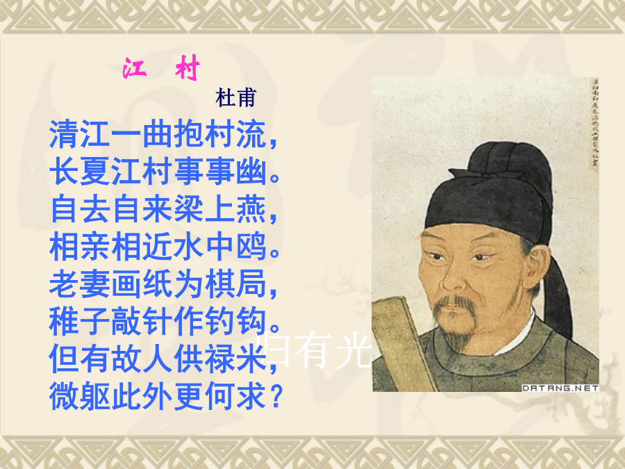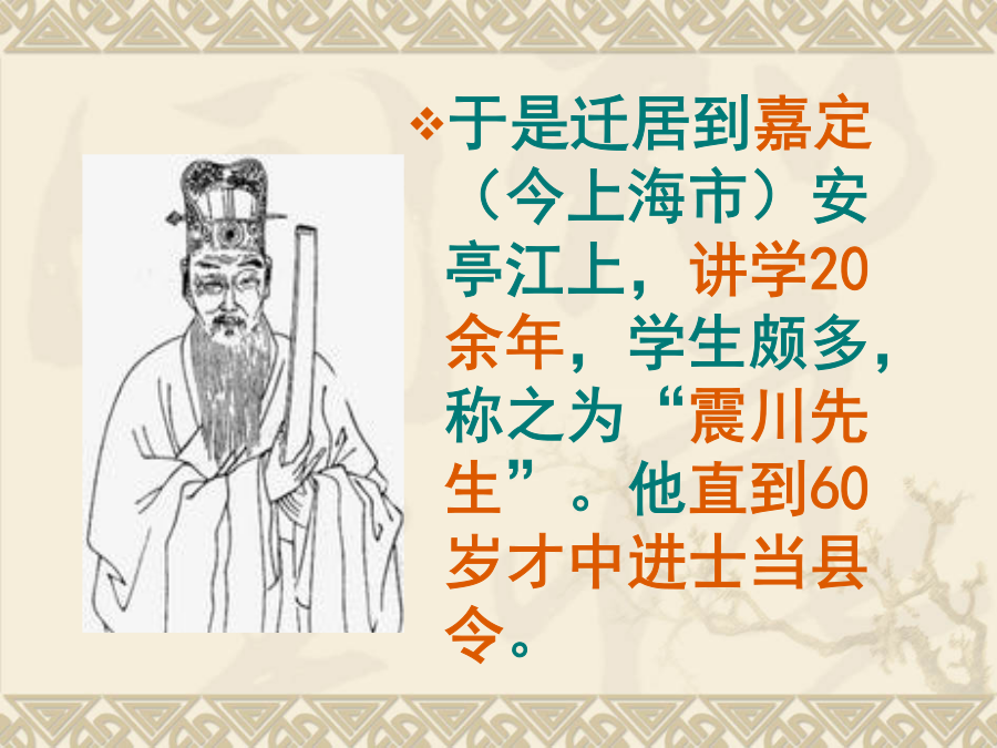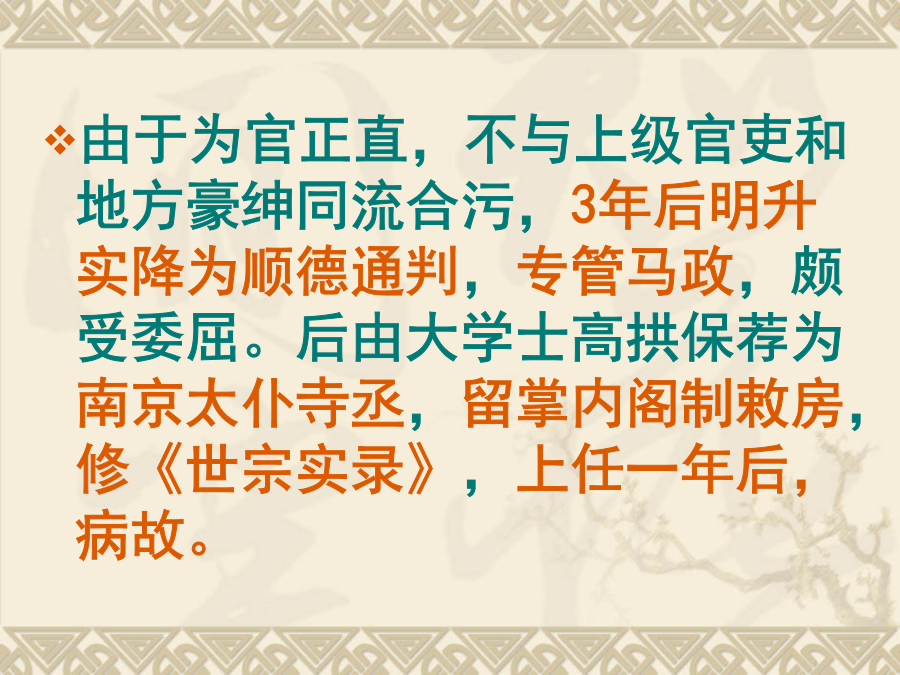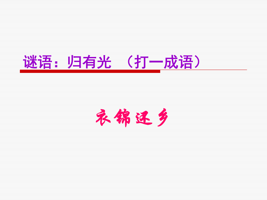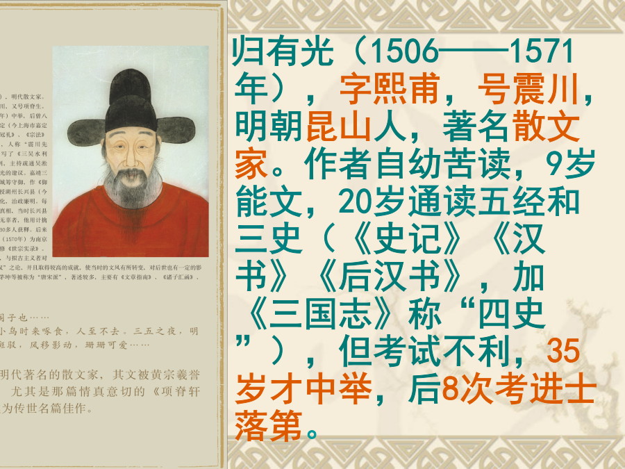 归有光谜语:归有光(打一成语)归有光(1506——1571年),字熙甫,号震川,明朝昆山人,著名散文家。作者自幼苦读,9岁能文,20岁通读五经和三史(《史记》《汉书》《后汉书》,加《三国志》称“四史”),但考试不利,35岁才中举,后8次考进士落第。于是迁居到嘉定(今上海市)安亭江上,讲学20余年,学生颇多,称之为“震川先生”。他直到60岁才中进士当县令。 由于为官正直,不与上级官吏和地方豪绅同流合污,3年后明升实降为顺德通判,专管马政,颇受委屈。后由大学士高拱保荐为南京太仆寺丞,留掌内阁制敕房,修《世宗实录》,上任一年后,病故。1506年1岁)生于江苏昆山 1510年5岁)开始读书 1513年8岁)丧母 1528年23岁)娶妻魏氏 1533年28岁)丧妻 1540年35岁)中举人徙居嘉定读书、讲学 1565年60岁)中进士任湖州府长兴县令 1568年63岁)任顺德府通判管粮运、水利 1570年65岁)任南京太仆寺丞管皇家车马 1571年66岁)病逝在文学上,他博览群书,散文创作上造诣很深,是明代杰出散文家。 他的散文源出《史记》,取法于唐宋八大家,风格朴实,感情真挚,被誉为“明文第一”,当时人称他为“今之欧阳修”。一反当时“文必秦汉”的理论和只求貌似的形式主义风尚。归有光与王慎中、唐顺之、茅坤并称为“唐宋派”。他的散文朴素简洁,自然真挚,善以家庭琐事寄托真情。《项脊轩》《先妣事略》《寒花葬志》为代表。 他的作品对清代桐城派散文影响很大,桐城派的姚鼐评价他:“是架设在唐宋八大家与桐城派之间的一座桥梁”。 近代林纾更尊他为“五百年来归震川一人而已”。 《震川文集》书景明万历二十七年刊本解题:注音读音:1、归有光23岁结婚,请由此推算本文正文与附记写作时间大约相隔多久? 2、这满架的书真是借来的吗? 3、归有光出身于一个怎样的家庭中?这能否从文中找出? 4、这样一个大家庭,后来发生了怎样的变故?文中哪些语句最能渲染衰败的景象? 5、好端端一个家庭,弄得四分五裂,面对这样的变故,作者满含怎样的感情?能否用文中的一个字概括? 他的悲哀仅仅是由于家道中落吗? 6、作者回忆母亲、祖母时选取了日常生活中一些平淡的事,通过典型的细节和场面来表现他深挚的感情。(自由朗读“家有老妪”,┉“令人长号不自禁”)这些细节描写,你最欣赏哪一处? 7、作者在回忆亡妻时,有没有直接表露自己的悲痛呢?(朗读第四节) 8、请你们设想一下“时至轩中,从余问古事,或凭几学书。”是一幅怎样的场景?如果拍电视,请你设想一个最佳镜头9、诸小妹为何提阁子之事? 10、这样一位好妻子、好伴侣,现在离我而去了,作者的心情自然是无限悲凉。你们能否从这两节中找出这样的细节证明作者的心情呢? 11、课文后几节,作者极力渲染这种悲情,可是文中第一段却极力描写项脊轩生活的怡然自乐,这是否会冲淡悲情? 12、这篇文章对我们写作有何启示?对比描写,写景为主,景中含情书中省略的一段内容:项脊生曰①:“蜀清守丹穴,利甲天下,其后秦皇帝筑女怀清台②。刘玄德与曹操争天下,诸葛孔明起陇中③。方二人之昧昧于一隅也,世何足以知之④?余区区处败屋之中,方扬眉瞬目⑤,谓有奇景,人知之者,其谓与坎井之蛙何异⑥?这一段是作者的议论,这里既有自我解嘲,又将自己与历史伟人相比较,表明自己不甘于永远处在“败屋之中”的志愿。