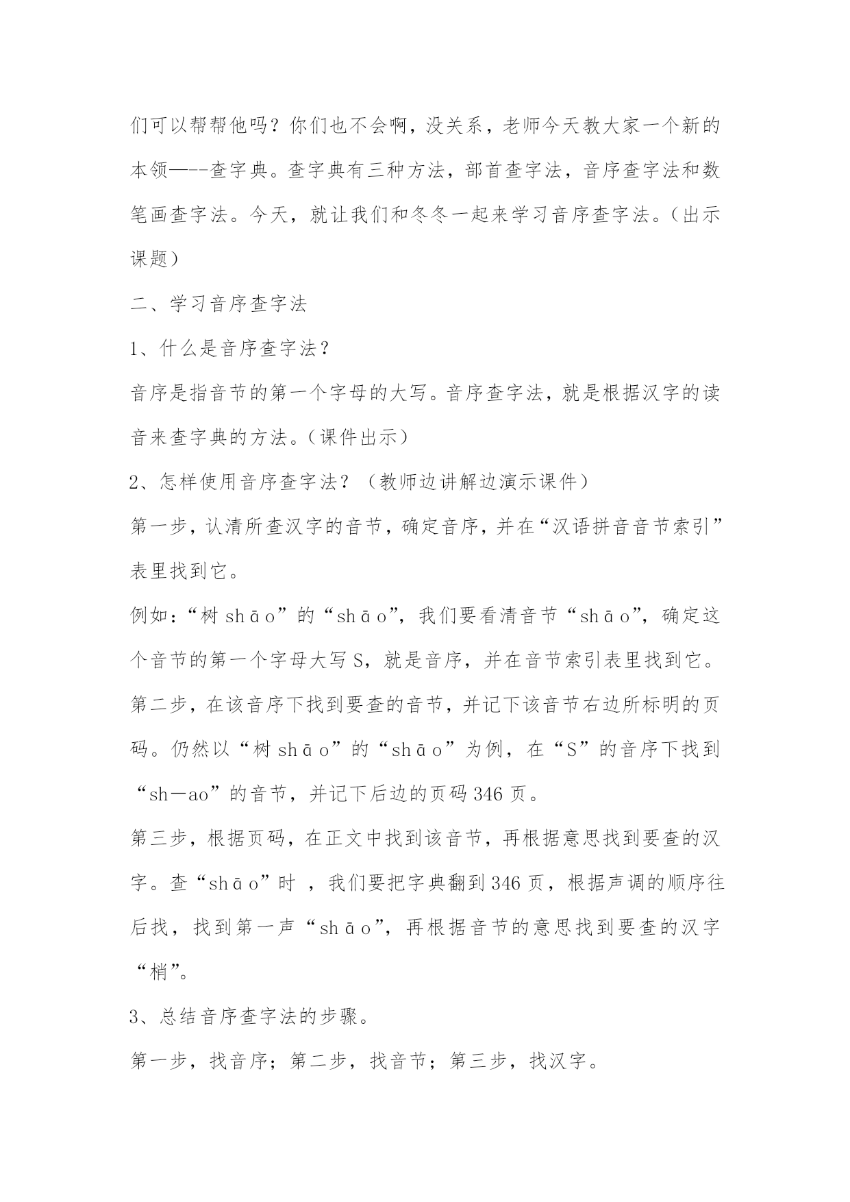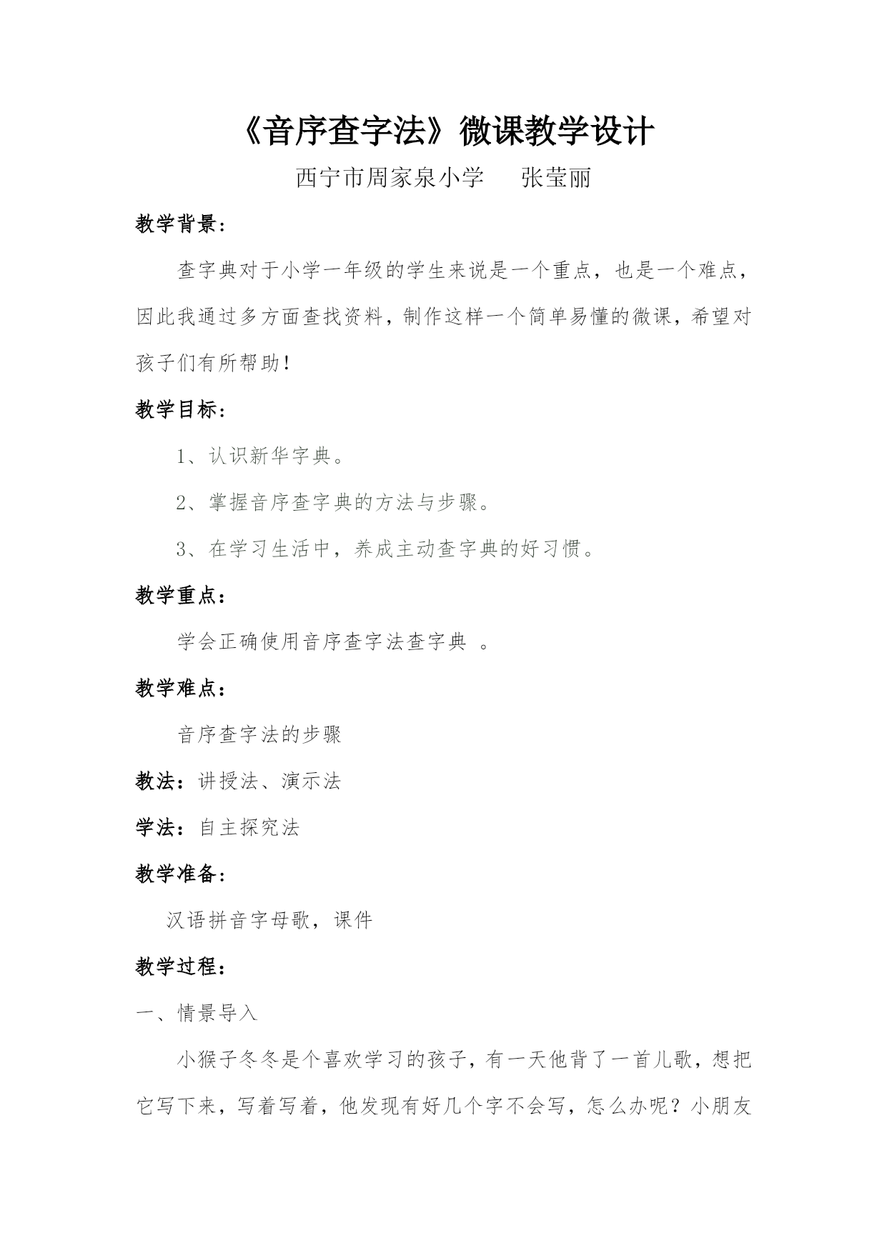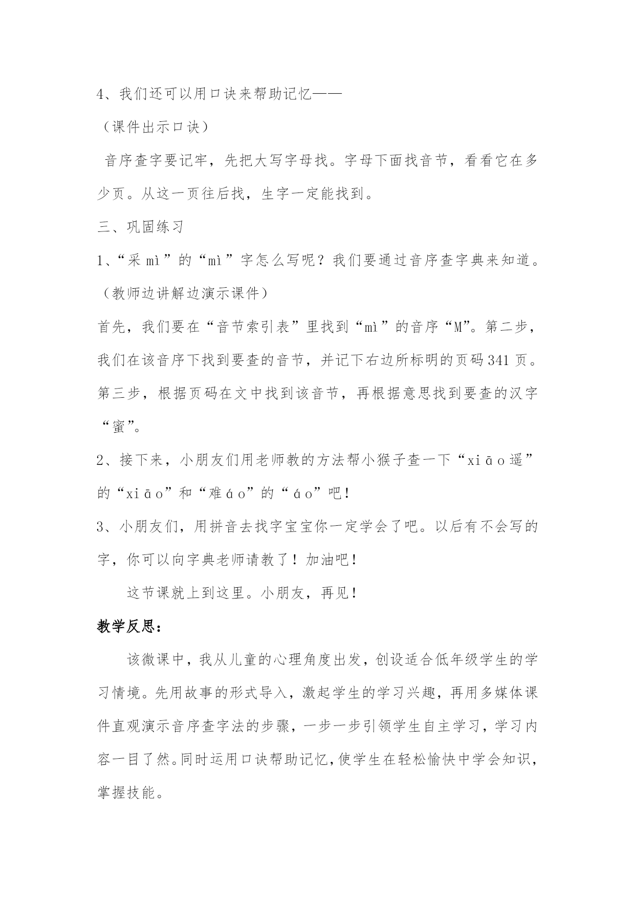 人教版小学语文一年级下册 《音序查字法》微课教学设计 工作坊名称:城东区小学语文一坊 学校:周家泉小学 教师姓名:张莹丽 《音序查字法》微课教学设计 西宁市周家泉小学张莹丽 教学背景: 查字典对于小学一年级的学生来说是一个重点,也是一个难点,因此我通过多方面查找资料,制作这样一个简单易懂的微课,希望对孩子们有所帮助! 教学目标: 1、认识新华字典。 2、掌握音序查字典的方法与步骤。 3、在学习生活中,养成主动查字典的好习惯。 教学重点: 学会正确使用音序查字法查字典。 教学难点: 音序查字法的步骤 教法:讲授法、演示法 学法:自主探究法 教学准备: 汉语拼音字母歌,课件 教学过程: 一、情景导入 小猴子冬冬是个喜欢学习的孩子,有一天他背了一首儿歌,想把它写下来,写着写着,他发现有好几个字不会写,怎么办呢?小朋友们可以帮帮他吗?你们也不会啊,没关系,老师今天教大家一个新的本领—--查字典。查字典有三种方法,部首查字法,音序查字法和数笔画查字法。今天,就让我们和冬冬一起来学习音序查字法。(出示课题) 二、学习音序查字法 1、什么是音序查字法? 音序是指音节的第一个字母的大写。音序查字法,就是根据汉字的读音来查字典的方法。(课件出示) 2、怎样使用音序查字法?(教师边讲解边演示课件) 第一步,认清所查汉字的音节,确定音序,并在“汉语拼音音节索引”表里找到它。 例如:“树shāo”的“shāo”,我们要看清音节“shāo”,确定这个音节的第一个字母大写S,就是音序,并在音节索引表里找到它。 第二步,在该音序下找到要查的音节,并记下该音节右边所标明的页码。仍然以“树shāo”的“shāo”为例,在“S”的音序下找到“sh-ao”的音节,并记下后边的页码346页。 第三步,根据页码,在正文中找到该音节,再根据意思找到要查的汉字。查“shāo”时,我们要把字典翻到346页,根据声调的顺序往后找,找到第一声“shāo”,再根据音节的意思找到要查的汉字“梢”。 3、总结音序查字法的步骤。 第一步,找音序;第二步,找音节;第三步,找汉字。 4、我们还可以用口诀来帮助记忆—— (课件出示口诀) 音序查字要记牢,先把大写字母找。字母下面找音节,看看它在多少页。从这一页往后找,生字一定能找到。 三、巩固练习 1、“采mì”的“mì”字怎么写呢?我们要通过音序查字典来知道。(教师边讲解边演示课件) 首先,我们要在“音节索引表”里找到“mì”的音序“M”。第二步,我们在该音序下找到要查的音节,并记下右边所标明的页码341页。第三步,根据页码在文中找到该音节,再根据意思找到要查的汉字“蜜”。 2、接下来,小朋友们用老师教的方法帮小猴子查一下“xiāo遥”的“xiāo”和“难áo”的“áo”吧! 3、小朋友们,用拼音去找字宝宝你一定学会了吧。以后有不会写的字,你可以向字典老师请教了!加油吧! 这节课就上到这里。小朋友,再见! 教学反思: 该微课中,我从儿童的心理角度出发,创设适合低年级学生的学习情境。先用故事的形式导入,激起学生的学习兴趣,再用多媒体课件直观演示音序查字法的步骤,一步一步引领学生自主学习,学习内容一目了然。同时运用口诀帮助记忆,使学生在轻松愉快中学会知识,掌握技能。