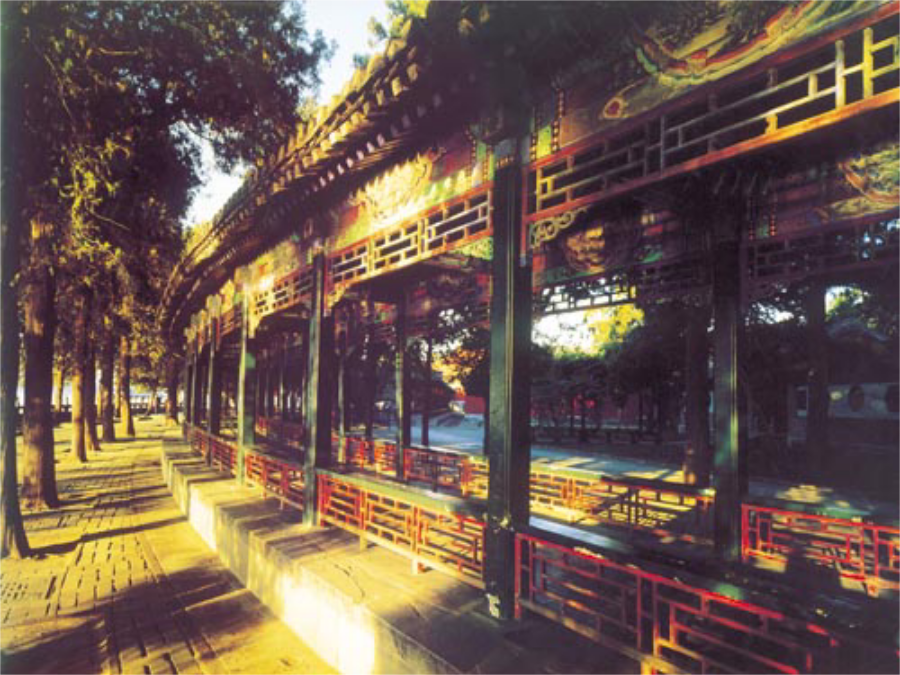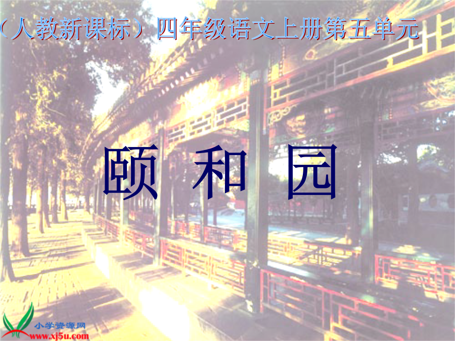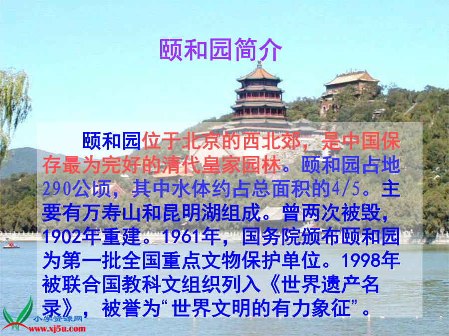 颐和园颐和园简介宫殿 长廊万寿山佛香阁 排云殿昆明湖十七孔桥 金碧辉煌姿态不一式样不同 闪闪发光隐隐约约湖光山色 神清气爽闪闪发光亭台楼阁 绿漆葱郁朱红碧玉葱绿北京的颐和园是个美丽的大公园。默读课文,把课文第二至第五自然段开头的第一个句子画下来,边读边想:作者是按什么顺序介绍颐和园的?进了颐和园的大门,绕过大殿,就来到有名的长廊。颐和园导游示意图进了颐和园的大门,绕过大殿,就来到有名的长廊。绿漆的柱子,红漆的栏杆,一眼望不到头。这条长廊有七百多米长,分成273间。每一间的横槛上都有五彩的画,画着人物、花草、风景,几千幅画没有哪两幅是相同的。长廊两旁栽满了花木,这一种花还没谢,那一种又开了。微风从左边的昆明湖上吹来,使人神清气爽。学习第二自然段: 1.读一读,想一想长廊有什么特点? 2.找出你觉得写得好的句子划一划。 3.说一说长廊。 进了颐和园的大门,绕过大殿,就来到有名的长廊。绿漆的柱子,红漆的栏杆,一眼望不到头。这条长廊有七百多米长,分成273间。每一间的横槛上都有五彩的画,画着人物、花草、风景,几千幅画没有哪两幅是相同的。长廊两旁栽满了花木,这一种花还没谢,那一种又开了。微风从左边的昆明湖上吹来,使人神清气爽。长横槛横槛返回登上万寿山,站在佛香阁的前面向下望,颐和园的景色大半收在眼底。葱郁的树丛,掩映着黄的绿的琉璃瓦屋顶和朱红的宫墙。正前面,昆明湖静得像一面镜子,绿得像一块碧玉。游船、画舫在湖面慢慢地滑过,几乎不留一点儿痕迹。向东远眺,隐隐约约可以望见几座古老的城楼和城里的白塔。 这两段课文描写了登上万寿山向下望,所看到的景物。作者先描写了___、_______和______;再写正前面的_____、_____和_____;最后写向东远眺时所看见的______、____。 从万寿山下来,就是昆明湖。昆明湖围着长长的堤岸,堤上有好几座式样不同的石桥,两岸栽着数不清的垂柳。湖中心有个小岛,远远望去,岛上一片葱绿,树丛中露出宫殿的一角。游人走过长长的石桥,就可以去小岛上玩。这座石桥有十七个桥洞,叫十七孔桥;桥栏杆上有上百根石柱,柱子上都雕刻着小狮子。这么多的狮子,姿态不一,没有哪两只是相同的。昆明湖欣赏读句子,发挥想象写一写。 桥栏杆上有上百根石柱,柱子上都是雕刻着小狮子。这么多的狮子,姿态不一,没有哪两只是相同的。 这些小狮子姿态不一,它们有的______,有的____,有的_____,有的_____,有的_____,真是_____。颐和园到处有美丽的景色,说也说不尽,希望你有机会去细细游赏。颐和园美景欣赏返回小练笔: 学习《颐和园》移步换景的写法,记一次游览活动。