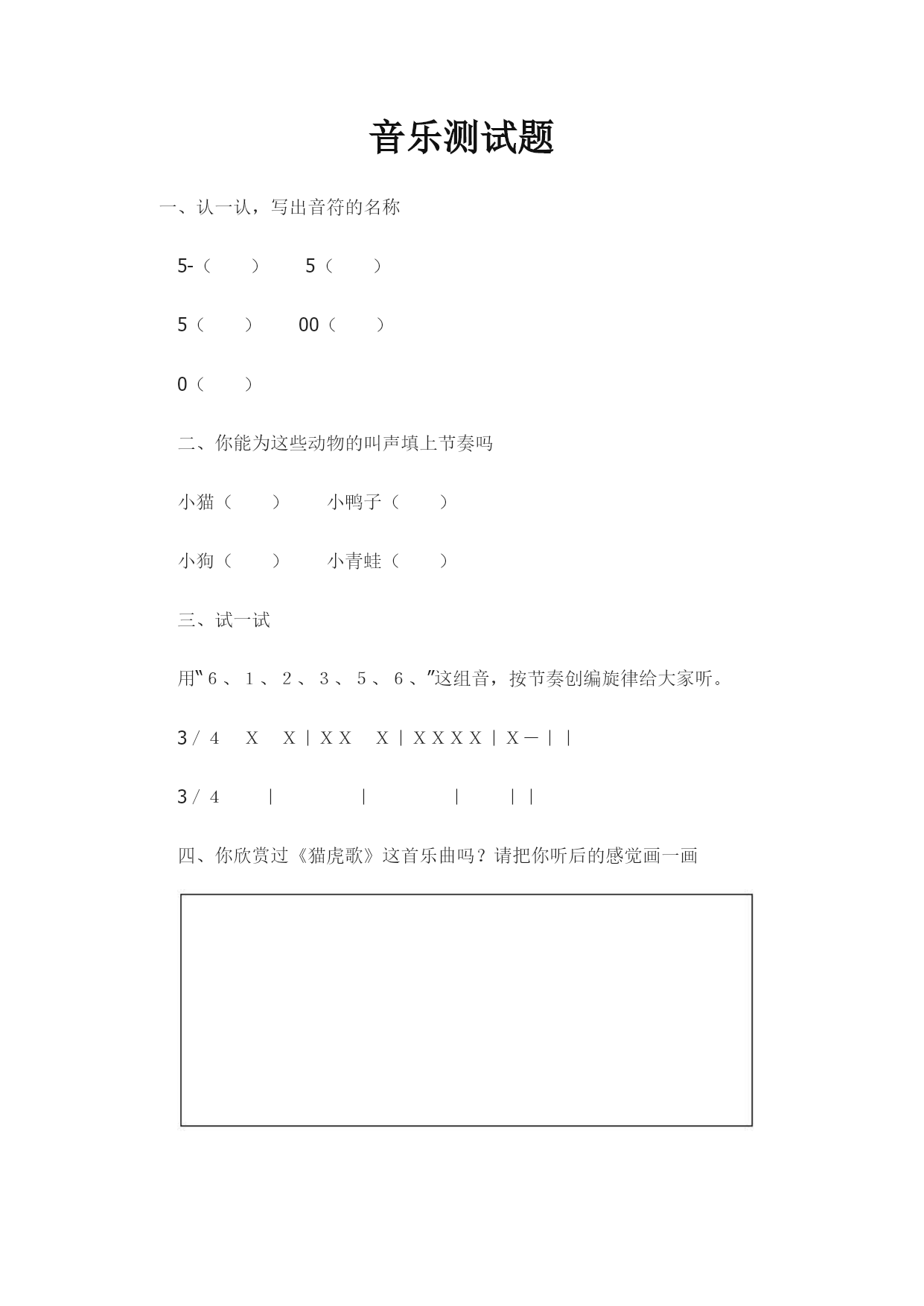 音乐测试题 一、认一认,写出音符的名称 5-()5() 5()00() 0() 二、你能为这些动物的叫声填上节奏吗 小猫()小鸭子() 小狗()小青蛙() 三、试一试 用“6、1、2、3、5、6、”这组音,按节奏创编旋律给大家听。 3/4XX|XXX|XXXX|X-|| 3/4||||| 四、你欣赏过《猫虎歌》这首乐曲吗?请把你听后的感觉画一画