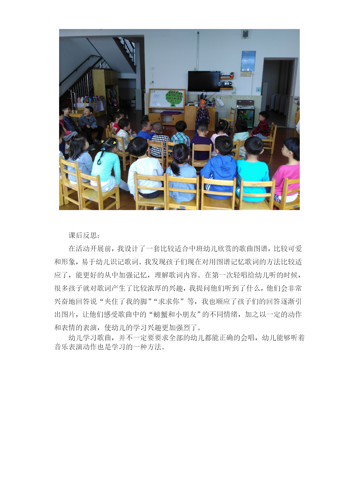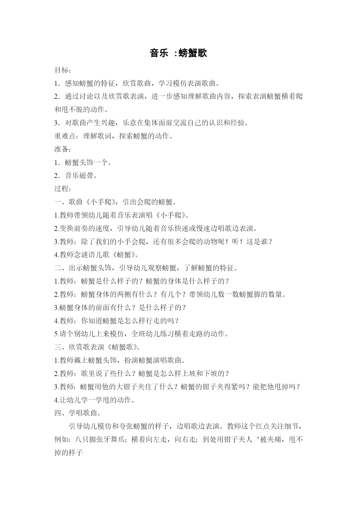 音乐:螃蟹歌 目标: 1.感知螃蟹的特征,欣赏歌曲,学习模仿表演歌曲。 2.通过讨论以及欣赏歌表演,进一步感知理解歌曲内容,探索表演螃蟹横着爬和甩不脱的动作。 3.对歌曲产生兴趣,乐意在集体面前交流自己的认识和经验。 重难点:理解歌词,探索螃蟹的动作。 准备: 1.螃蟹头饰一个。 2.音乐磁带。 过程: 一、歌曲《小手爬》,引出会爬的螃蟹。 1.教师带领幼儿随着音乐表演唱《小手爬》。 2.变换前奏的速度,引导幼儿随着音乐快速或慢速边唱歌边表演。 3.教师:除了我们的小手会爬,还有很多会爬的动物呢!听!这是谁? 4.教师念谜语儿歌《螃蟹》。 二、出示螃蟹头饰,引导幼儿观察螃蟹,了解螃蟹的特征。 1.教师:螃蟹是什么样子的?螃蟹的身体是什么样子的? 2.教师:螃蟹身体的两侧有什么?有几个?带领幼儿数一数螃蟹脚的数量。 3.螃蟹身体的前面有什么?是什么样子的? 4.教师:你知道螃蟹是怎么样行走的吗? 5.请个别幼儿上来模仿,全班幼儿练习横着走路的动作。 三、欣赏歌表演《螃蟹歌》。 1.教师戴上螃蟹头饰,扮演螃蟹演唱歌曲。 2.教师:歌里说了些什么?螃蟹是怎么样上坡和下坡的? 3.教师:螃蟹用他的大钳子夹住了什么?螃蟹的钳子夹得紧吗?能把他甩掉吗? 4.让幼儿学一学甩的动作。 四、学唱歌曲。 引导幼儿模仿和夸张螃蟹的样子,边唱歌边表演。教师这个红点关注细节,例如:八只脚张牙舞爪;横着向左走,向右走;到处用钳子夹人‘被夹痛,甩不掉的样子 课后反思: 在活动开展前,我设计了一套比较适合中班幼儿欣赏的歌曲图谱,比较可爱和形象,易于幼儿识记歌词。我发现孩子们现在对用图谱记忆歌词的方法比较适应了,能更好的从中加强记忆,理解歌词内容。在第一次轻唱给幼儿听的时候,很多孩子就对歌词产生了比较浓厚的兴趣,我提问他们听到了什么,他们会非常兴奋地回答说“夹住了我的脚”“求求你”等,我也顺应了孩子们的回答逐渐引出图片,让他们感受歌曲中的“螃蟹和小朋友”的不同情绪,加之以一定的动作和表情的表演,使幼儿的学习兴趣更加强烈了。 幼儿学习歌曲,并不一定要要求全部的幼儿都能正确的会唱,幼儿能够听着音乐表演动作也是学习的一种方法。