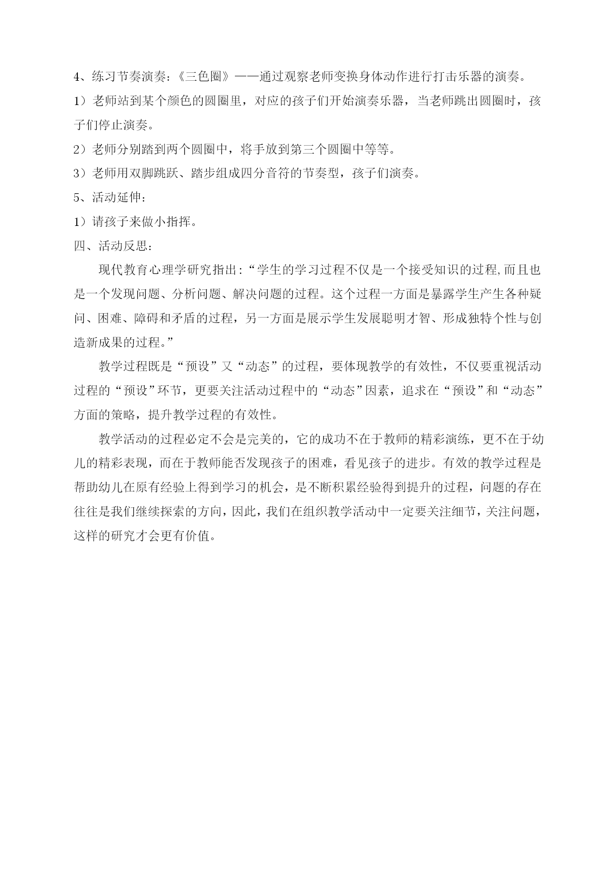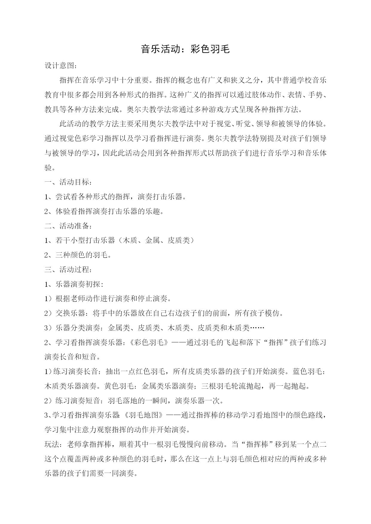 音乐活动:彩色羽毛 设计意图: 指挥在音乐学习中十分重要。指挥的概念也有广义和狭义之分,其中普通学校音乐教育中很多都会用到各种形式的指挥。这种广义的指挥可以通过肢体动作、表情、手势、教具等各种方法来完成。奥尔夫教学法常通过多种游戏方式呈现各种指挥方法。 此活动的教学方法主要采用奥尔夫教学法中对于视觉、听觉、领导和被领导的体验。通过视觉色彩学习指挥以及学习看指挥进行演奏。奥尔夫教学法特别提及对孩子们领导与被领导的学习,因此此活动会用到各种指挥形式以帮助孩子们进行音乐学习和音乐体验。 一、活动目标: 1、尝试看各种形式的指挥,演奏打击乐器。 2、体验看指挥演奏打击乐器的乐趣。 二、活动准备: 1、若干小型打击乐器(木质、金属、皮质类) 2、三种颜色的羽毛。 三、活动过程: 1、乐器演奏初探: 1)根据老师动作进行演奏和停止演奏。 2)交换乐器:将手中的乐器放在自己右边孩子们的前面,所有孩子模仿。 3)乐器分类演奏:金属类、皮质类、木质类、皮质类和木质类…… 2、学习看指挥演奏乐器:《彩色羽毛》——通过羽毛的飞起和落下“指挥”孩子们练习演奏长音和短音。 1)练习演奏长音:抽出一点红色羽毛,所有皮质类乐器的孩子们开始演奏。蓝色羽毛:木质类乐器演奏。黄色羽毛:金属类乐器演奏;三根羽毛轮流抛起,再一起抛起。 2)练习演奏短音:羽毛落地的一瞬间,演奏乐器一次。 3、学习看指挥演奏乐器:《羽毛地图》——通过指挥棒的移动学习看地图中的颜色路线,学习集中注意力观察指挥的动作并开始演奏。 玩法:老师拿指挥棒,顺着其中一根羽毛慢慢向前移动。当“指挥棒”移到某一个点二这个点覆盖两种或多种颜色的羽毛时,那么在这一点上与羽毛颜色相对应的两种或多种乐器的孩子们需要一同演奏。 4、练习节奏演奏:《三色圈》——通过观察老师变换身体动作进行打击乐器的演奏。 1)老师站到某个颜色的圆圈里,对应的孩子们开始演奏乐器,当老师跳出圆圈时,孩子们停止演奏。 2)老师分别踏到两个圆圈中,将手放到第三个圆圈中等等。 3)老师用双脚跳跃、踏步组成四分音符的节奏型,孩子们演奏。 5、活动延伸: 1)请孩子来做小指挥。 四、活动反思: 现代教育心理学研究指出:“学生的学习过程不仅是一个接受知识的过程,而且也是一个发现问题、分析问题、解决问题的过程。这个过程一方面是暴露学生产生各种疑问、困难、障碍和矛盾的过程,另一方面是展示学生发展聪明才智、形成独特个性与创造新成果的过程。” 教学过程既是“预设”又“动态”的过程,要体现教学的有效性,不仅要重视活动过程的“预设”环节,更要关注活动过程中的“动态”因素,追求在“预设”和“动态”方面的策略,提升教学过程的有效性。 教学活动的过程必定不会是完美的,它的成功不在于教师的精彩演练,更不在于幼儿的精彩表现,而在于教师能否发现孩子的困难,看见孩子的进步。有效的教学过程是帮助幼儿在原有经验上得到学习的机会,是不断积累经验得到提升的过程,问题的存在往往是我们继续探索的方向,因此,我们在组织教学活动中一定要关注细节,关注问题,这样的研究才会更有价值。