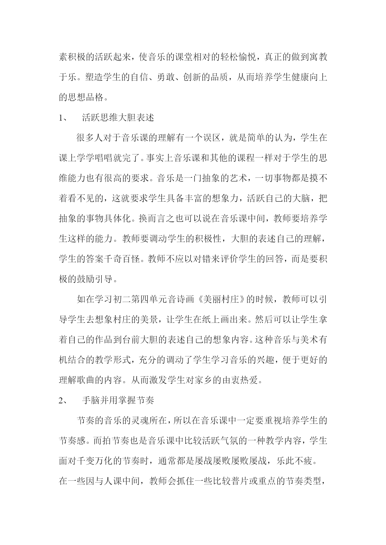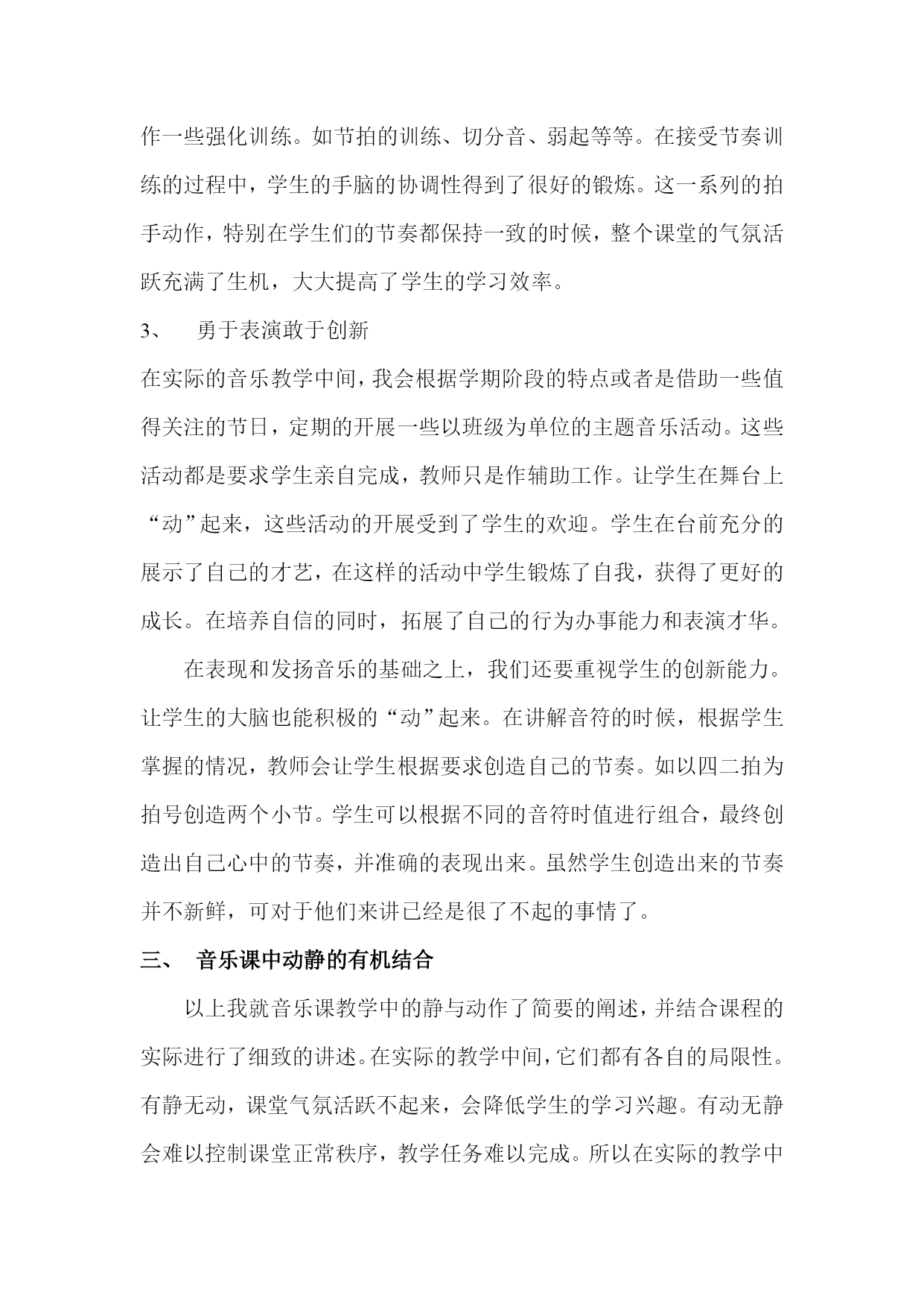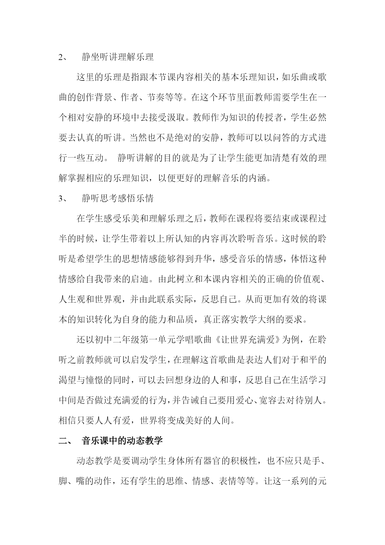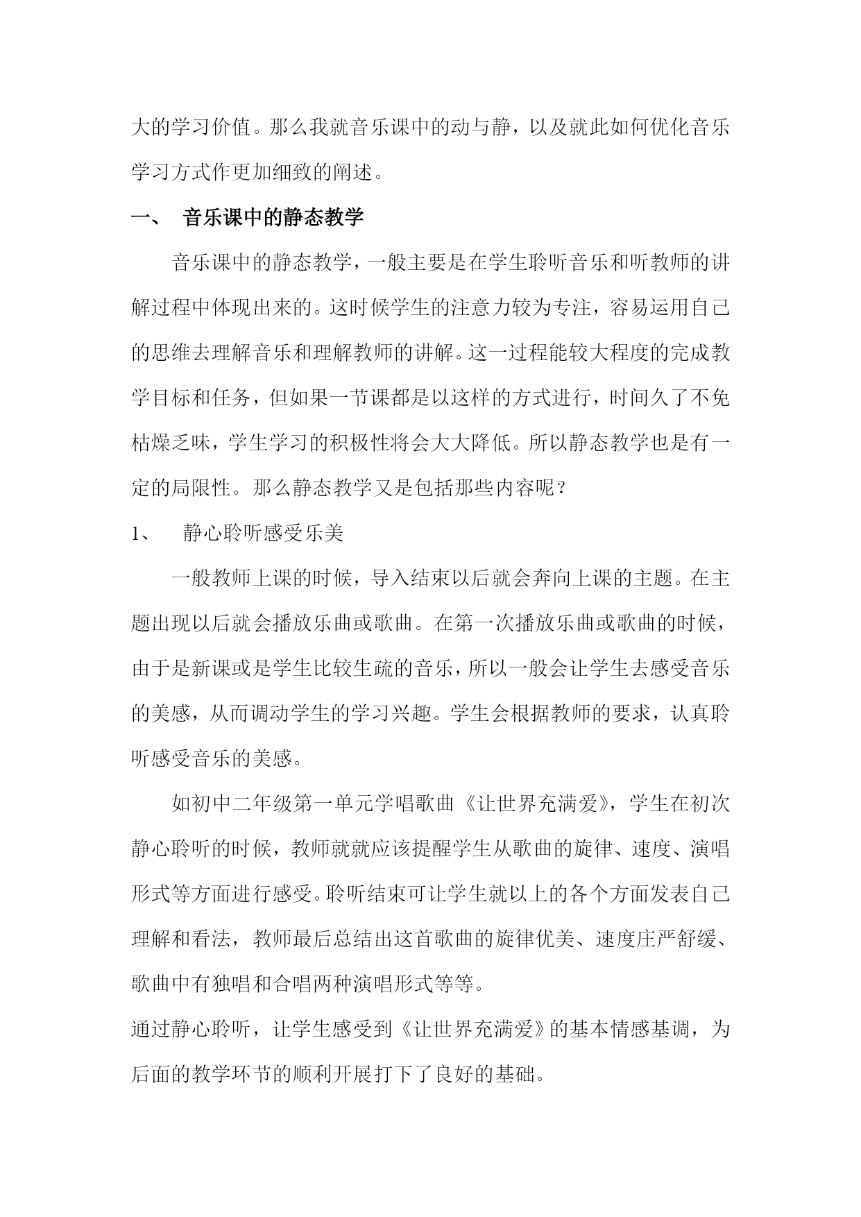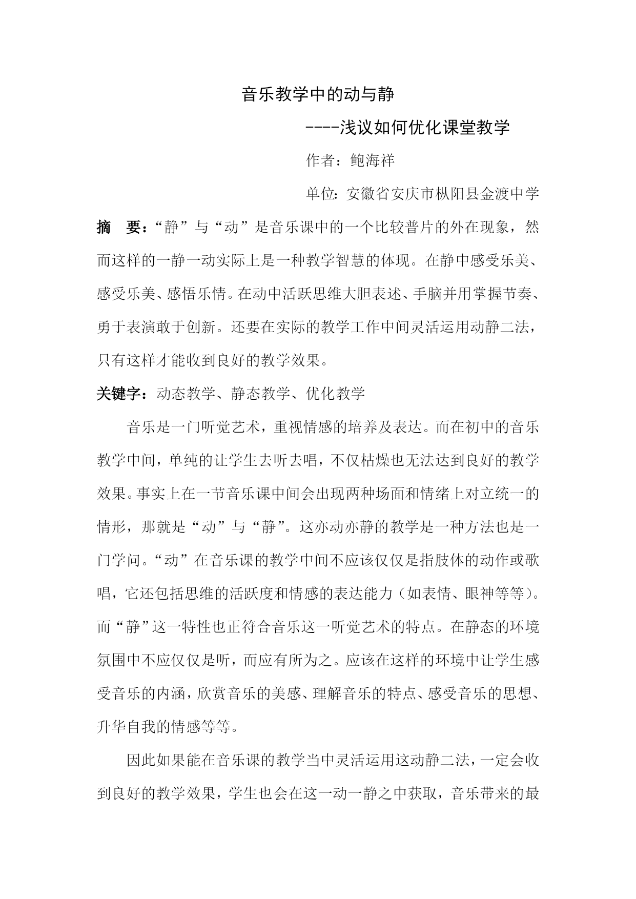 音乐教学中的动与静 ----浅议如何优化课堂教学 作者:鲍海祥 单位:安徽省安庆市枞阳县金渡中学 摘要:“静”与“动”是音乐课中的一个比较普片的外在现象,然而这样的一静一动实际上是一种教学智慧的体现。在静中感受乐美、感受乐美、感悟乐情。在动中活跃思维大胆表述、手脑并用掌握节奏、勇于表演敢于创新。还要在实际的教学工作中间灵活运用动静二法,只有这样才能收到良好的教学效果。 关键字:动态教学、静态教学、优化教学 音乐是一门听觉艺术,重视情感的培养及表达。而在初中的音乐教学中间,单纯的让学生去听去唱,不仅枯燥也无法达到良好的教学效果。事实上在一节音乐课中间会出现两种场面和情绪上对立统一的情形,那就是“动”与“静”。这亦动亦静的教学是一种方法也是一门学问。“动”在音乐课的教学中间不应该仅仅是指肢体的动作或歌唱,它还包括思维的活跃度和情感的表达能力(如表情、眼神等等)。而“静”这一特性也正符合音乐这一听觉艺术的特点。在静态的环境氛围中不应仅仅是听,而应有所为之。应该在这样的环境中让学生感受音乐的内涵,欣赏音乐的美感、理解音乐的特点、感受音乐的思想、升华自我的情感等等。 因此如果能在音乐课的教学当中灵活运用这动静二法,一定会收到良好的教学效果,学生也会在这一动一静之中获取,音乐带来的最大的学习价值。那么我就音乐课中的动与静,以及就此如何优化音乐学习方式作更加细致的阐述。 音乐课中的静态教学 音乐课中的静态教学,一般主要是在学生聆听音乐和听教师的讲解过程中体现出来的。这时候学生的注意力较为专注,容易运用自己的思维去理解音乐和理解教师的讲解。这一过程能较大程度的完成教学目标和任务,但如果一节课都是以这样的方式进行,时间久了不免枯燥乏味,学生学习的积极性将会大大降低。所以静态教学也是有一定的局限性。那么静态教学又是包括那些内容呢? 静心聆听感受乐美 一般教师上课的时候,导入结束以后就会奔向上课的主题。在主题出现以后就会播放乐曲或歌曲。在第一次播放乐曲或歌曲的时候,由于是新课或是学生比较生疏的音乐,所以一般会让学生去感受音乐的美感,从而调动学生的学习兴趣。学生会根据教师的要求,认真聆听感受音乐的美感。 如初中二年级第一单元学唱歌曲《让世界充满爱》,学生在初次静心聆听的时候,教师就就应该提醒学生从歌曲的旋律、速度、演唱形式等方面进行感受。聆听结束可让学生就以上的各个方面发表自己理解和看法,教师最后总结出这首歌曲的旋律优美、速度庄严舒缓、歌曲中有独唱和合唱两种演唱形式等等。 通过静心聆听,让学生感受到《让世界充满爱》的基本情感基调,为后面的教学环节的顺利开展打下了良好的基础。 静坐听讲理解乐理 这里的乐理是指跟本节课内容相关的基本乐理知识,如乐曲或歌曲的创作背景、作者、节奏等等。在这个环节里面教师需要学生在一个相对安静的环境中去接受汲取。教师作为知识的传授者,学生必然要去认真的听讲。当然也不是绝对的安静,教师可以以问答的方式进行一些互动。静听讲解的目的就是为了让学生能更加清楚有效的理解掌握相应的乐理知识,以便更好的理解音乐的内涵。 静听思考感悟乐情 在学生感受乐美和理解乐理之后,教师在课程将要结束或课程过半的时候,让学生带着以上所认知的内容再次聆听音乐。这时候的聆听是希望学生的思想情感能够得到升华,感受音乐的情感,体悟这种情感给自我带来的启迪。由此树立和本课内容相关的正确的价值观、人生观和世界观,并由此联系实际,反思自己。从而更加有效的将课本的知识转化为自身的能力和品质,真正落实教学大纲的要求。 还以初中二年级第一单元学唱歌曲《让世界充满爱》为例,在聆听之前教师就可以启发学生,在理解这首歌曲是表达人们对于和平的渴望与憧憬的同时,可以去回想身边的人和事,反思自己在生活学习中间是否做过充满爱的行为,并告诫自己要用爱心、宽容去对待别人。相信只要人人有爱,世界将变成美好的人间。 音乐课中的动态教学 动态教学是要调动学生身体所有器官的积极性,也不应只是手、脚、嘴的动作,还有学生的思维、情感、表情等等。让这一系列的元素积极的活跃起来,使音乐的课堂相对的轻松愉悦,真正的做到寓教于乐。塑造学生的自信、勇敢、创新的品质,从而培养学生健康向上的思想品格。 活跃思维大胆表述 很多人对于音乐课的理解有一个误区,就是简单的认为,学生在课上学学唱唱就完了。事实上音乐课和其他的课程一样对于学生的思维能力也有很高的要求。音乐是一门抽象的艺术,一切事物都是摸不着看不见的,这就要求学生具备丰富的想象力,活跃自己的大脑,把抽象的事物具体化。换而言之也可以说在音乐课中间,教师要培养学生这样的能力。教师要调动学生的积极性,大胆的表述自己的理解,学生的答案千奇百怪。教师不应以对错来评价学生的回答,而是要积极的鼓励引导。 如在学习初二第四单元音诗画《美丽村庄》的时候,教师可以引导学生去想象