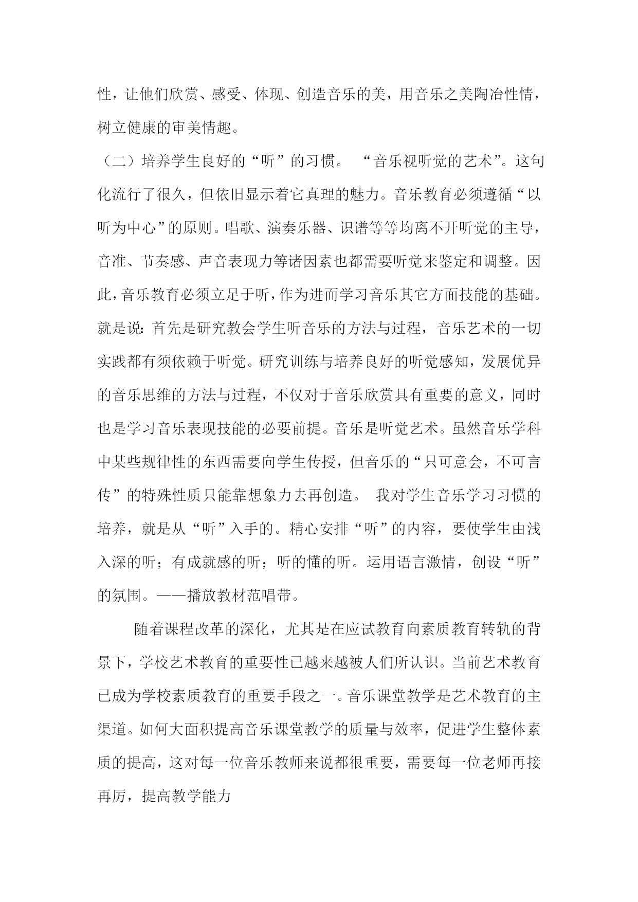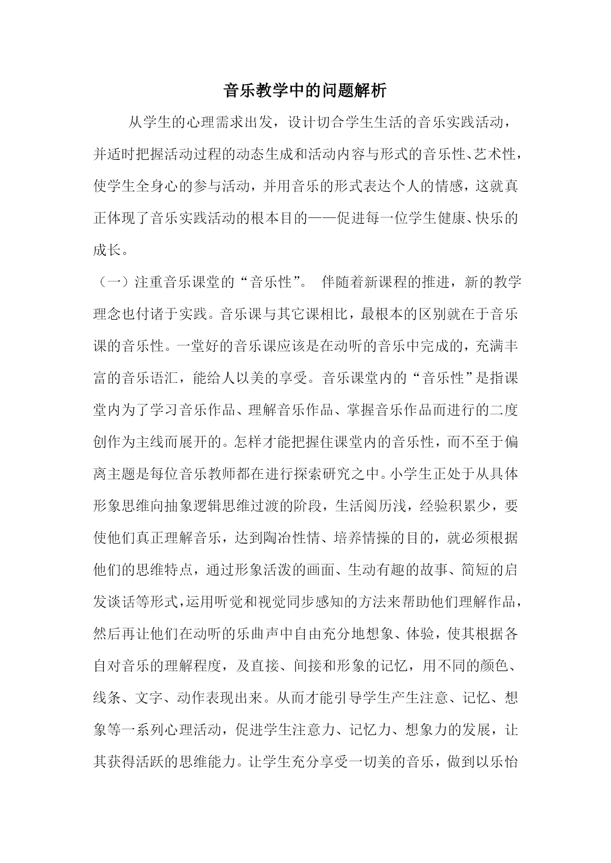 音乐教学中的问题解析 从学生的心理需求出发,设计切合学生生活的音乐实践活动,并适时把握活动过程的动态生成和活动内容与形式的音乐性、艺术性,使学生全身心的参与活动,并用音乐的形式表达个人的情感,这就真正体现了音乐实践活动的根本目的——促进每一位学生健康、快乐的成长。(一)注重音乐课堂的“音乐性”。伴随着新课程的推进,新的教学理念也付诸于实践。音乐课与其它课相比,最根本的区别就在于音乐课的音乐性。一堂好的音乐课应该是在动听的音乐中完成的,充满丰富的音乐语汇,能给人以美的享受。音乐课堂内的“音乐性”是指课堂内为了学习音乐作品、理解音乐作品、掌握音乐作品而进行的二度创作为主线而展开的。怎样才能把握住课堂内的音乐性,而不至于偏离主题是每位音乐教师都在进行探索研究之中。小学生正处于从具体形象思维向抽象逻辑思维过渡的阶段,生活阅历浅,经验积累少,要使他们真正理解音乐,达到陶冶性情、培养情操的目的,就必须根据他们的思维特点,通过形象活泼的画面、生动有趣的故事、简短的启发谈话等形式,运用听觉和视觉同步感知的方法来帮助他们理解作品,然后再让他们在动听的乐曲声中自由充分地想象、体验,使其根据各自对音乐的理解程度,及直接、间接和形象的记忆,用不同的颜色、线条、文字、动作表现出来。从而才能引导学生产生注意、记忆、想象等一系列心理活动,促进学生注意力、记忆力、想象力的发展,让其获得活跃的思维能力。让学生充分享受一切美的音乐,做到以乐怡性,让他们欣赏、感受、体现、创造音乐的美,用音乐之美陶冶性情,树立健康的审美情趣。(二)培养学生良好的“听”的习惯。“音乐视听觉的艺术”。这句化流行了很久,但依旧显示着它真理的魅力。音乐教育必须遵循“以听为中心”的原则。唱歌、演奏乐器、识谱等等均离不开听觉的主导,音准、节奏感、声音表现力等诸因素也都需要听觉来鉴定和调整。因此,音乐教育必须立足于听,作为进而学习音乐其它方面技能的基础。就是说:首先是研究教会学生听音乐的方法与过程,音乐艺术的一切实践都有须依赖于听觉。研究训练与培养良好的听觉感知,发展优异的音乐思维的方法与过程,不仅对于音乐欣赏具有重要的意义,同时也是学习音乐表现技能的必要前提。音乐是听觉艺术。虽然音乐学科中某些规律性的东西需要向学生传授,但音乐的“只可意会,不可言传”的特殊性质只能靠想象力去再创造。我对学生音乐学习习惯的培养,就是从“听”入手的。精心安排“听”的内容,要使学生由浅入深的听;有成就感的听;听的懂的听。运用语言激情,创设“听”的氛围。——播放教材范唱带。 随着课程改革的深化,尤其是在应试教育向素质教育转轨的背景下,学校艺术教育的重要性已越来越被人们所认识。当前艺术教育已成为学校素质教育的重要手段之一。音乐课堂教学是艺术教育的主渠道。如何大面积提高音乐课堂教学的质量与效率,促进学生整体素质的提高,这对每一位音乐教师来说都很重要,需要每一位老师再接再厉,提高教学能力