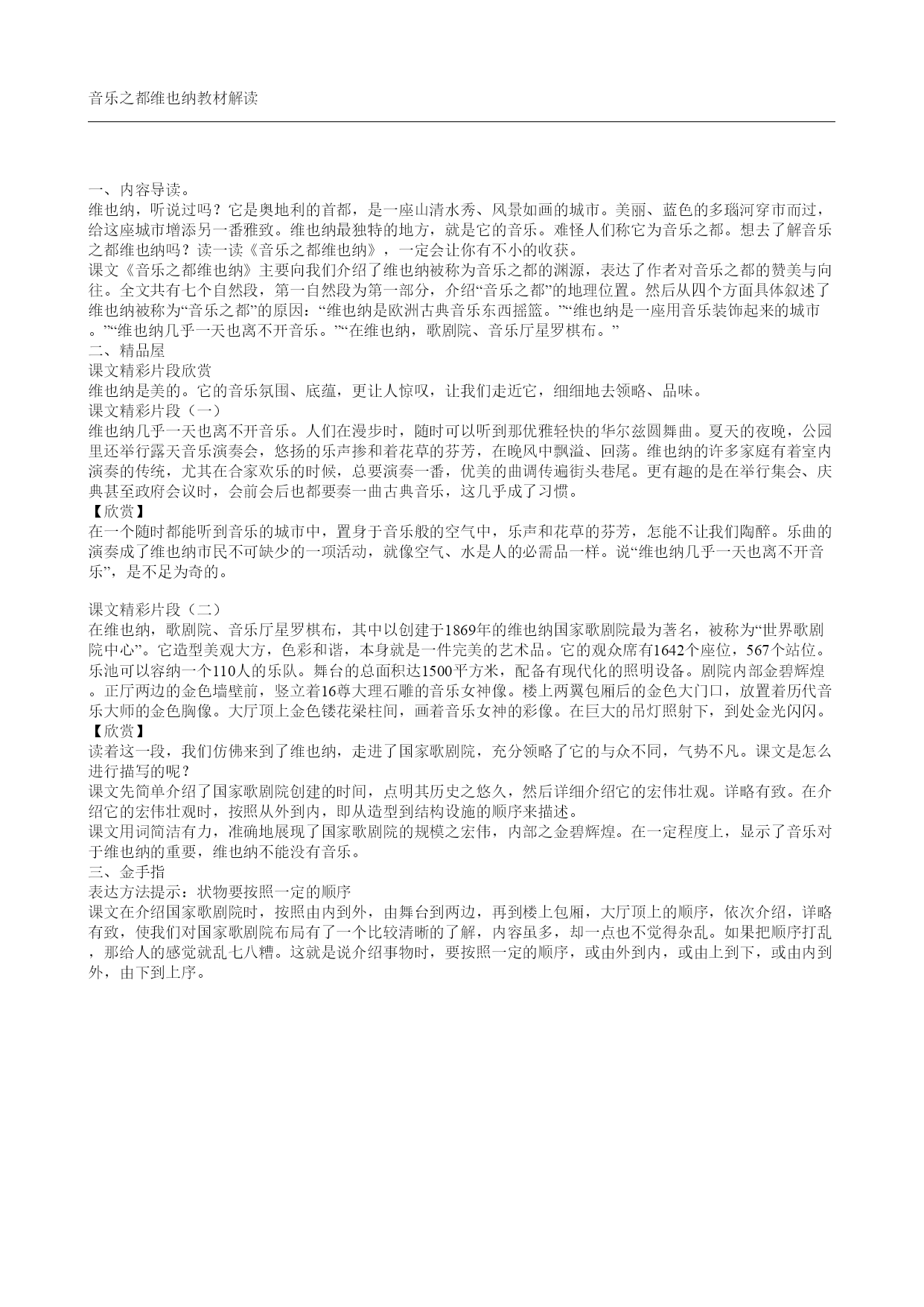 音乐之都维也纳教材解读 一、内容导读。 维也纳,听说过吗?它是奥地利的首都,是一座山清水秀、风景如画的城市。美丽、蓝色的多瑙河穿市而过,给这座城市增添另一番雅致。维也纳最独特的地方,就是它的音乐。难怪人们称它为音乐之都。想去了解音乐之都维也纳吗?读一读《音乐之都维也纳》,一定会让你有不小的收获。 课文《音乐之都维也纳》主要向我们介绍了维也纳被称为音乐之都的渊源,表达了作者对音乐之都的赞美与向往。全文共有七个自然段,第一自然段为第一部分,介绍“音乐之都”的地理位置。然后从四个方面具体叙述了维也纳被称为“音乐之都”的原因:“维也纳是欧洲古典音乐东西摇篮。”“维也纳是一座用音乐装饰起来的城市。”“维也纳几乎一天也离不开音乐。”“在维也纳,歌剧院、音乐厅星罗棋布。” 二、精品屋 课文精彩片段欣赏 维也纳是美的。它的音乐氛围、底蕴,更让人惊叹,让我们走近它,细细地去领略、品味。 课文精彩片段(一) 维也纳几乎一天也离不开音乐。人们在漫步时,随时可以听到那优雅轻快的华尔兹圆舞曲。夏天的夜晚,公园里还举行露天音乐演奏会,悠扬的乐声掺和着花草的芬芳,在晚风中飘溢、回荡。维也纳的许多家庭有着室内演奏的传统,尤其在合家欢乐的时候,总要演奏一番,优美的曲调传遍街头巷尾。更有趣的是在举行集会、庆典甚至政府会议时,会前会后也都要奏一曲古典音乐,这几乎成了习惯。 【欣赏】 在一个随时都能听到音乐的城市中,置身于音乐般的空气中,乐声和花草的芬芳,怎能不让我们陶醉。乐曲的演奏成了维也纳市民不可缺少的一项活动,就像空气、水是人的必需品一样。说“维也纳几乎一天也离不开音乐”,是不足为奇的。 课文精彩片段(二) 在维也纳,歌剧院、音乐厅星罗棋布,其中以创建于1869年的维也纳国家歌剧院最为著名,被称为“世界歌剧院中心”。它造型美观大方,色彩和谐,本身就是一件完美的艺术品。它的观众席有1642个座位,567个站位。乐池可以容纳一个110人的乐队。舞台的总面积达1500平方米,配备有现代化的照明设备。剧院内部金碧辉煌。正厅两边的金色墙壁前,竖立着16尊大理石雕的音乐女神像。楼上两翼包厢后的金色大门口,放置着历代音乐大师的金色胸像。大厅顶上金色镂花梁柱间,画着音乐女神的彩像。在巨大的吊灯照射下,到处金光闪闪。 【欣赏】 读着这一段,我们仿佛来到了维也纳,走进了国家歌剧院,充分领略了它的与众不同,气势不凡。课文是怎么进行描写的呢? 课文先简单介绍了国家歌剧院创建的时间,点明其历史之悠久,然后详细介绍它的宏伟壮观。详略有致。在介绍它的宏伟壮观时,按照从外到内,即从造型到结构设施的顺序来描述。 课文用词简洁有力,准确地展现了国家歌剧院的规模之宏伟,内部之金碧辉煌。在一定程度上,显示了音乐对于维也纳的重要,维也纳不能没有音乐。 三、金手指 表达方法提示:状物要按照一定的顺序 课文在介绍国家歌剧院时,按照由内到外,由舞台到两边,再到楼上包厢,大厅顶上的顺序,依次介绍,详略有致,使我们对国家歌剧院布局有了一个比较清晰的了解,内容虽多,却一点也不觉得杂乱。如果把顺序打乱,那给人的感觉就乱七八糟。这就是说介绍事物时,要按照一定的顺序,或由外到内,或由上到下,或由内到外,由下到上序。