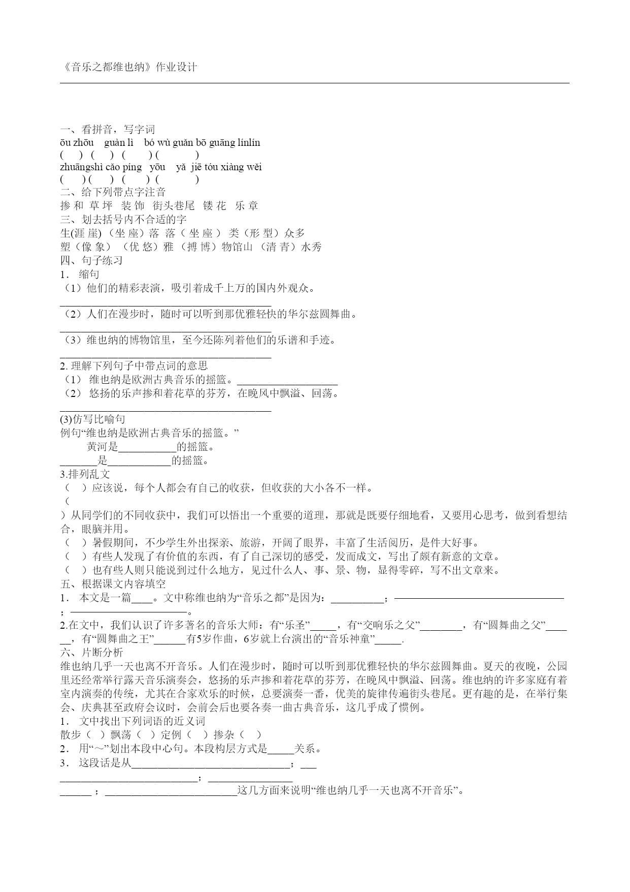 《音乐之都维也纳》作业设计 一、看拼音,写字词ōuzhōuguànlìbówùguǎnbōguānglínlín()()()()zhuāngshìcǎopíngyōuyǎjiētóuxiàngwěi()()()()二、给下列带点字注音掺和草坪装饰街头巷尾镂花乐章三、划去括号内不合适的字生(涯崖)(坐座)落落(坐座)类(形型)众多塑(像象)(优悠)雅(搏博)物馆山(清青)水秀四、句子练习1.缩句(1)他们的精彩表演,吸引着成千上万的国内外观众。________________________________________(2)人们在漫步时,随时可以听到那优雅轻快的华尔兹圆舞曲。________________________________________(3)维也纳的博物馆里,至今还陈列着他们的乐谱和手迹。________________________________________2.理解下列句子中带点词的意思(1)维也纳是欧洲古典音乐的摇篮。___________________(2)悠扬的乐声掺和着花草的芬芳,在晚风中飘溢、回荡。________________________________________(3)仿写比喻句例句“维也纳是欧洲古典音乐的摇篮。”黄河是___________的摇篮。_______是____________的摇篮。3.排列乱文()应该说,每个人都会有自己的收获,但收获的大小各不一样。()从同学们的不同收获中,我们可以悟出一个重要的道理,那就是既要仔细地看,又要用心思考,做到看想结合,眼脑并用。()暑假期间,不少学生外出探亲、旅游,开阔了眼界,丰富了生活阅历,是件大好事。()有些人发现了有价值的东西,有了自己深切的感受,发而成文,写出了颇有新意的文章。()也有些人则只能说到过什么地方,见过什么人、事、景、物,显得零碎,写不出文章来。五、根据课文内容填空1.本文是一篇____。文中称维也纳为“音乐之都”是因为:__________;————————————————;———————————。2.在文中,我们认识了许多著名的音乐大师:有“乐圣”_____,有“交响乐之父”________,有“圆舞曲之父”______,有“圆舞曲之王”______有5岁作曲,6岁就上台演出的“音乐神童”_____.六、片断分析维也纳几乎一天也离不开音乐。人们在漫步时,随时可以听到那优雅轻快的华尔兹圆舞曲。夏天的夜晚,公园里还经常举行露天音乐演奏会,悠扬的乐声掺和着花草的芬芳,在晚风中飘溢、回荡。维也纳的许多家庭有着室内演奏的传统,尤其在合家欢乐的时候,总要演奏一番,优美的旋律传遍街头巷尾。更有趣的是,在举行集会、庆典甚至政府会议时,会前会后也要各奏一曲古典音乐,这几乎成了惯例。1.文中找出下列词语的近义词散步()飘荡()定例()掺杂()2.用“~”划出本段中心句。本段构层方式是_____关系。3.这段话是从______________________________;_____________________________;______________________;_________________________这几方面来说明“维也纳几乎一天也离不开音乐”。