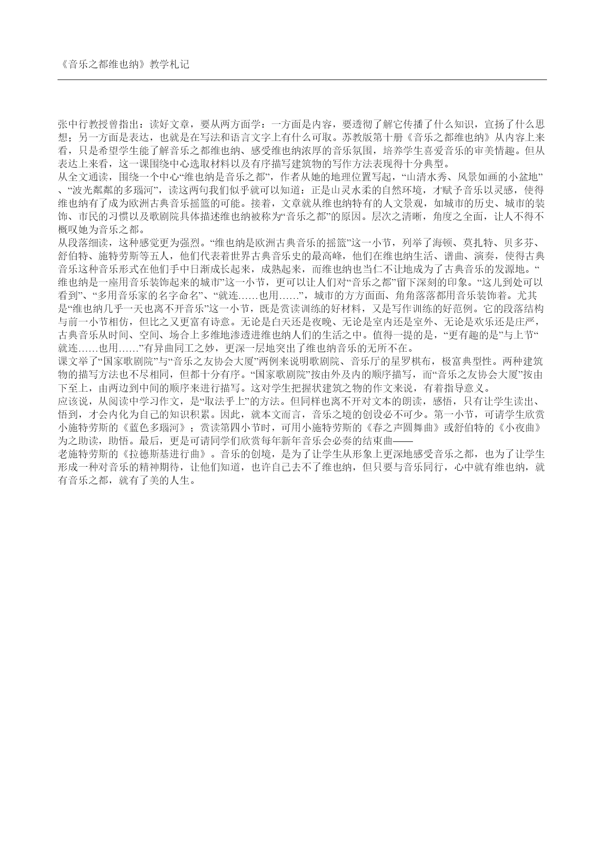 《音乐之都维也纳》教学札记 张中行教授曾指出:读好文章,要从两方面学:一方面是内容,要透彻了解它传播了什么知识,宣扬了什么思想;另一方面是表达,也就是在写法和语言文字上有什么可取。苏教版第十册《音乐之都维也纳》从内容上来看,只是希望学生能了解音乐之都维也纳、感受维也纳浓厚的音乐氛围,培养学生喜爱音乐的审美情趣。但从表达上来看,这一课围绕中心选取材料以及有序描写建筑物的写作方法表现得十分典型。 从全文通读,围绕一个中心“维也纳是音乐之都”,作者从她的地理位置写起,“山清水秀、风景如画的小盆地”、“波光粼粼的多瑙河”,读这两句我们似乎就可以知道:正是山灵水柔的自然环境,才赋予音乐以灵感,使得维也纳有了成为欧洲古典音乐摇篮的可能。接着,文章就从维也纳特有的人文景观,如城市的历史、城市的装饰、市民的习惯以及歌剧院具体描述维也纳被称为“音乐之都”的原因。层次之清晰,角度之全面,让人不得不概叹她为音乐之都。 从段落细读,这种感觉更为强烈。“维也纳是欧洲古典音乐的摇篮”这一小节,列举了海顿、莫扎特、贝多芬、舒伯特、施特劳斯等五人,他们代表着世界古典音乐史的最高峰,他们在维也纳生活、谱曲、演奏,使得古典音乐这种音乐形式在他们手中日渐成长起来,成熟起来,而维也纳也当仁不让地成为了古典音乐的发源地。“维也纳是一座用音乐装饰起来的城市”这一小节,更可以让人们对“音乐之都”留下深刻的印象。“这儿到处可以看到”、“多用音乐家的名字命名”、“就连……也用……”,城市的方方面面、角角落落都用音乐装饰着。尤其是“维也纳几乎一天也离不开音乐”这一小节,既是赏读训练的好材料,又是写作训练的好范例。它的段落结构与前一小节相仿,但比之又更富有诗意。无论是白天还是夜晚、无论是室内还是室外、无论是欢乐还是庄严,古典音乐从时间、空间、场合上多维地渗透进维也纳人们的生活之中。值得一提的是,“更有趣的是”与上节“就连……也用……”有异曲同工之妙,更深一层地突出了维也纳音乐的无所不在。 课文举了“国家歌剧院”与“音乐之友协会大厦”两例来说明歌剧院、音乐厅的星罗棋布,极富典型性。两种建筑物的描写方法也不尽相同,但都十分有序。“国家歌剧院”按由外及内的顺序描写,而“音乐之友协会大厦”按由下至上,由两边到中间的顺序来进行描写。这对学生把握状建筑之物的作文来说,有着指导意义。 应该说,从阅读中学习作文,是“取法乎上”的方法。但同样也离不开对文本的朗读,感悟,只有让学生读出、悟到,才会内化为自己的知识积累。因此,就本文而言,音乐之境的创设必不可少。第一小节,可请学生欣赏小施特劳斯的《蓝色多瑙河》;赏读第四小节时,可用小施特劳斯的《春之声圆舞曲》或舒伯特的《小夜曲》为之助读,助悟。最后,更是可请同学们欣赏每年新年音乐会必奏的结束曲——老施特劳斯的《拉德斯基进行曲》。音乐的创境,是为了让学生从形象上更深地感受音乐之都,也为了让学生形成一种对音乐的精神期待,让他们知道,也许自己去不了维也纳,但只要与音乐同行,心中就有维也纳,就有音乐之都,就有了美的人生。