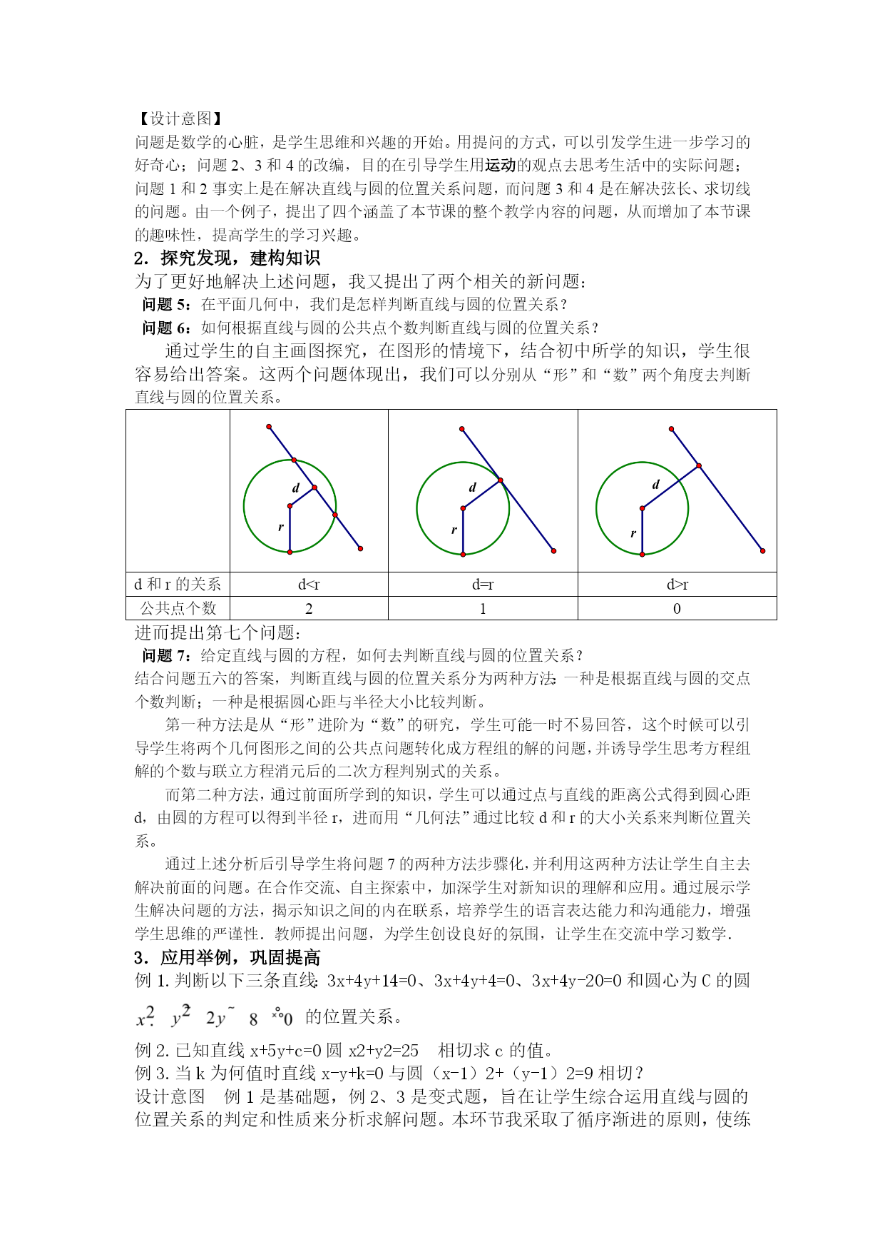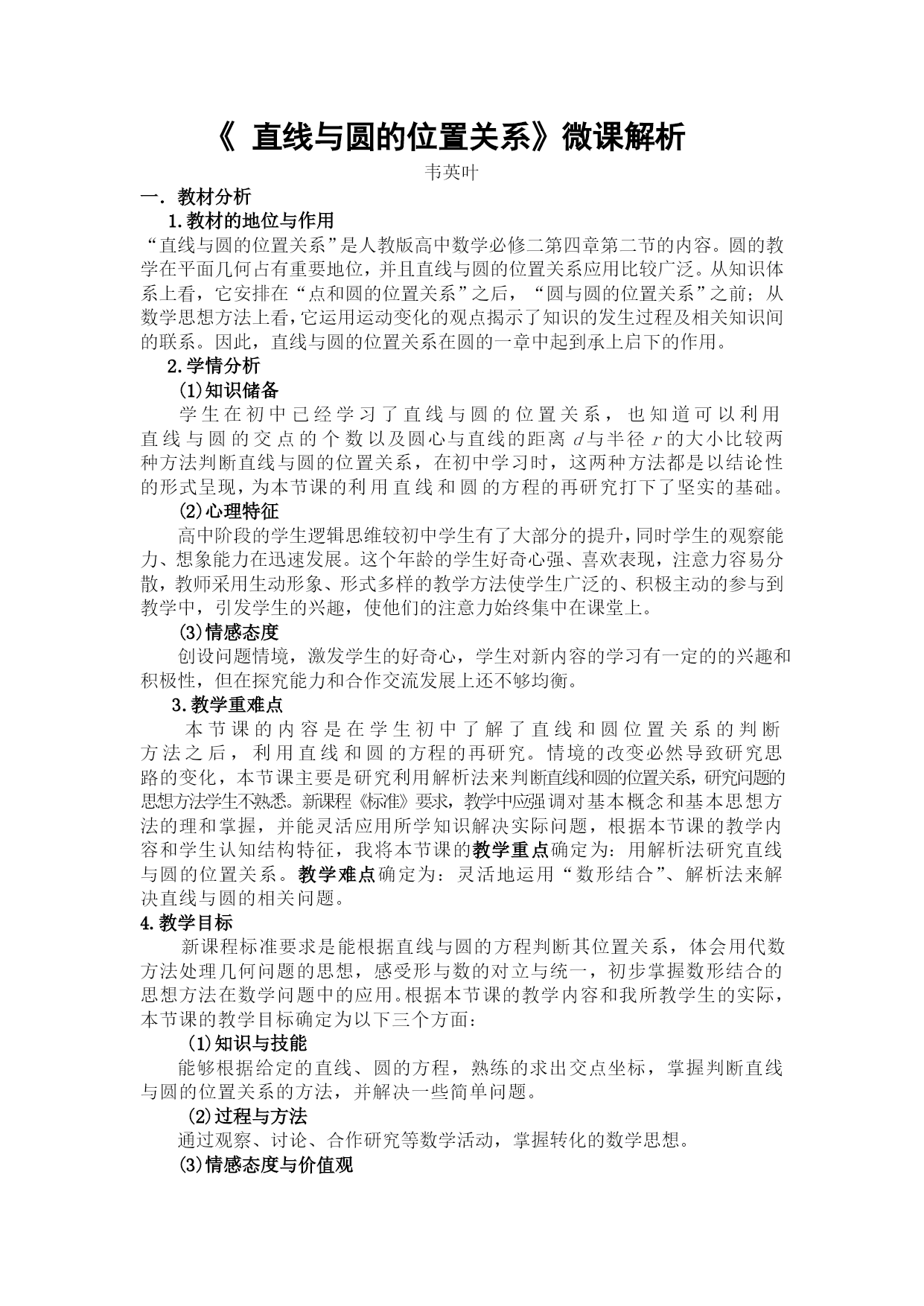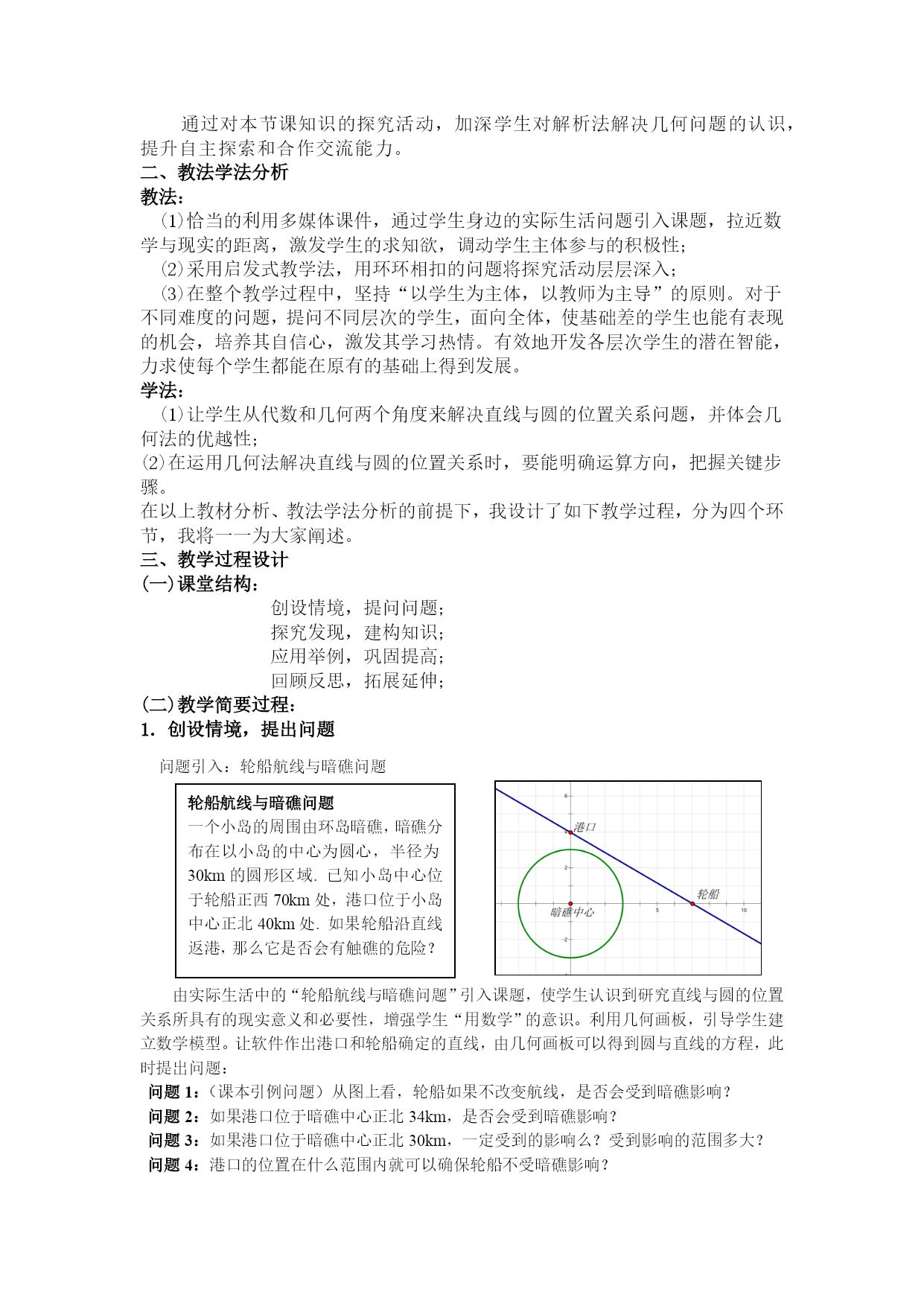 《直线与圆的位置关系》微课解析 韦英叶 一.教材分析 1.教材的地位与作用 “直线与圆的位置关系”是人教版高中数学必修二第四章第二节的内容。圆的教学在平面几何占有重要地位,并且直线与圆的位置关系应用比较广泛。从知识体系上看,它安排在“点和圆的位置关系”之后,“圆与圆的位置关系”之前;从数学思想方法上看,它运用运动变化的观点揭示了知识的发生过程及相关知识间的联系。因此,直线与圆的位置关系在圆的一章中起到承上启下的作用。 2.学情分析 (1)知识储备 学生在初中已经学习了直线与圆的位置关系,也知道可以利用直线与圆的交点的个数以及圆心与直线的距离d与半径r的大小比较两种方法判断直线与圆的位置关系,在初中学习时,这两种方法都是以结论性的形式呈现,为本节课的利用直线和圆的方程的再研究打下了坚实的基础。 (2)心理特征 高中阶段的学生逻辑思维较初中学生有了大部分的提升,同时学生的观察能力、想象能力在迅速发展。这个年龄的学生好奇心强、喜欢表现,注意力容易分散,教师采用生动形象、形式多样的教学方法使学生广泛的、积极主动的参与到教学中,引发学生的兴趣,使他们的注意力始终集中在课堂上。 (3)情感态度 创设问题情境,激发学生的好奇心,学生对新内容的学习有一定的的兴趣和积极性,但在探究能力和合作交流发展上还不够均衡。 教学重难点 本节课的内容是在学生初中了解了直线和圆位置关系的判断方法之后,利用直线和圆的方程的再研究。情境的改变必然导致研究思路的变化,本节课主要是研究利用解析法来判断直线和圆的位置关系,研究问题的思想方法学生不熟悉。新课程《标准》要求,教学中应强调对基本概念和基本思想方法的理和掌握,并能灵活应用所学知识解决实际问题,根据本节课的教学内容和学生认知结构特征,我将本节课的教学重点确定为:用解析法研究直线与圆的位置关系。教学难点确定为:灵活地运用“数形结合”、解析法来解决直线与圆的相关问题。 4.教学目标 新课程标准要求是能根据直线与圆的方程判断其位置关系,体会用代数方法处理几何问题的思想,感受形与数的对立与统一,初步掌握数形结合的思想方法在数学问题中的应用。根据本节课的教学内容和我所教学生的实际,本节课的教学目标确定为以下三个方面: (1)知识与技能 能够根据给定的直线、圆的方程,熟练的求出交点坐标,掌握判断直线与圆的位置关系的方法,并解决一些简单问题。 (2)过程与方法 通过观察、讨论、合作研究等数学活动,掌握转化的数学思想。 情感态度与价值观 通过对本节课知识的探究活动,加深学生对解析法解决几何问题的认识,提升自主探索和合作交流能力。 教法学法分析 教法: (1)恰当的利用多媒体课件,通过学生身边的实际生活问题引入课题,拉近数学与现实的距离,激发学生的求知欲,调动学生主体参与的积极性; (2)采用启发式教学法,用环环相扣的问题将探究活动层层深入; (3)在整个教学过程中,坚持“以学生为主体,以教师为主导”的原则。对于不同难度的问题,提问不同层次的学生,面向全体,使基础差的学生也能有表现的机会,培养其自信心,激发其学习热情。有效地开发各层次学生的潜在智能,力求使每个学生都能在原有的基础上得到发展。 学法: (1)让学生从代数和几何两个角度来解决直线与圆的位置关系问题,并体会几何法的优越性; 在运用几何法解决直线与圆的位置关系时,要能明确运算方向,把握关键步骤。 在以上教材分析、教法学法分析的前提下,我设计了如下教学过程,分为四个环节,我将一一为大家阐述。 教学过程设计 课堂结构: 创设情境,提问问题; 探究发现,建构知识; 应用举例,巩固提高; 回顾反思,拓展延伸; 教学简要过程: 1.创设情境,提出问题 轮船航线与暗礁问题 一个小岛的周围由环岛暗礁,暗礁分布在以小岛的中心为圆心,半径为30km的圆形区域.已知小岛中心位于轮船正西70km处,港口位于小岛中心正北40km处.如果轮船沿直线返港,那么它是否会有触礁的危险? 问题引入:轮船航线与暗礁问题 由实际生活中的“轮船航线与暗礁问题”引入课题,使学生认识到研究直线与圆的位置关系所具有的现实意义和必要性,增强学生“用数学”的意识。利用几何画板,引导学生建立数学模型。让软件作出港口和轮船确定的直线,由几何画板可以得到圆与直线的方程,此时提出问题: 问题1:(课本引例问题)从图上看,轮船如果不改变航线,是否会受到暗礁影响? 问题2:如果港口位于暗礁中心正北34km,是否会受到暗礁影响? 问题3:如果港口位于暗礁中心正北30km,一定受到的影响么?受到影响的范围多大? 问题4:港口的位置在什么范围内就可以确保轮船不受暗礁影响? 【设计意图】 问题是数学的心脏,是学生思维和兴趣的开始。用提问的方式,可以引发学生进一步学习的好奇心;问题2、3和4的改编,目的在引导学生用