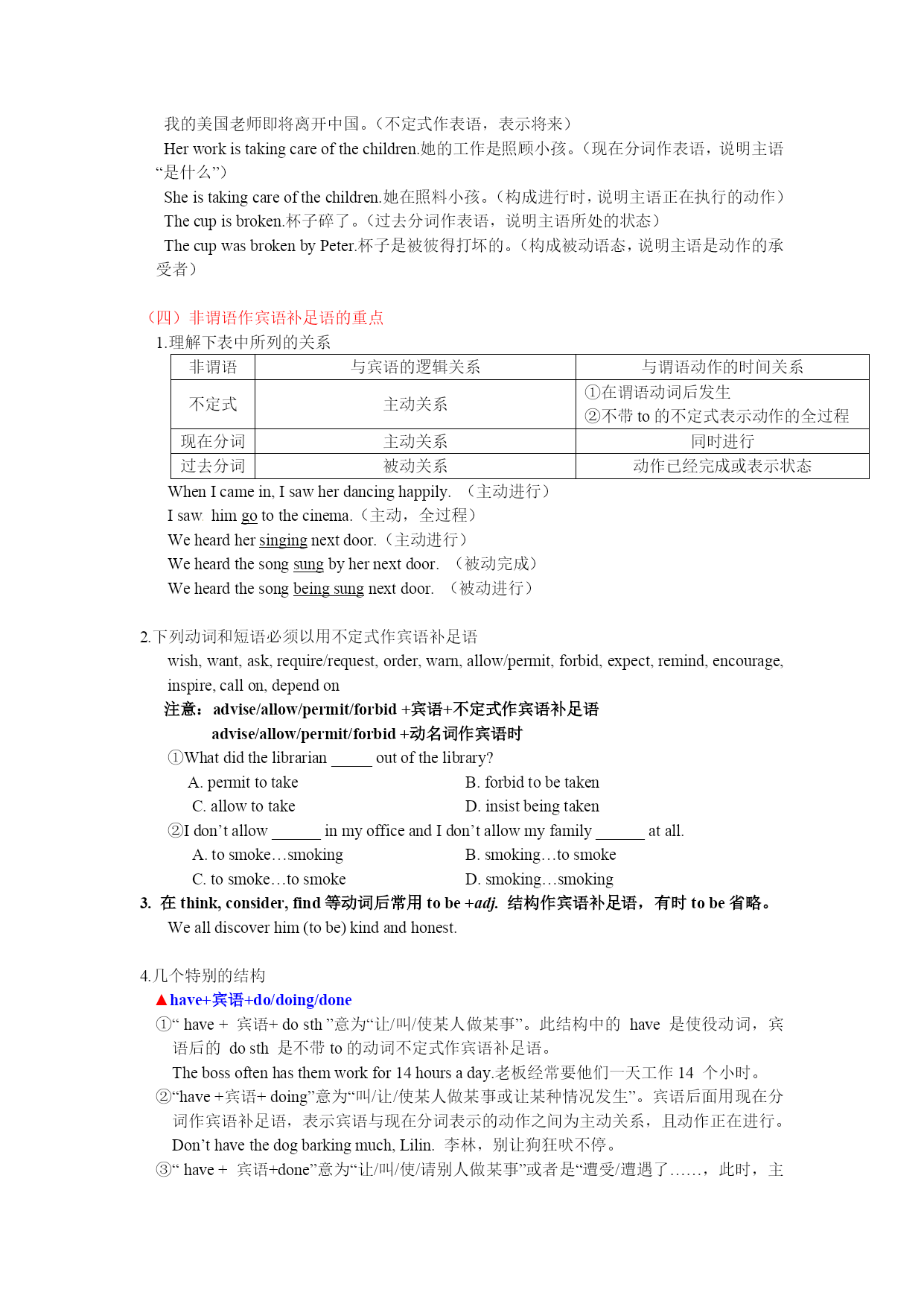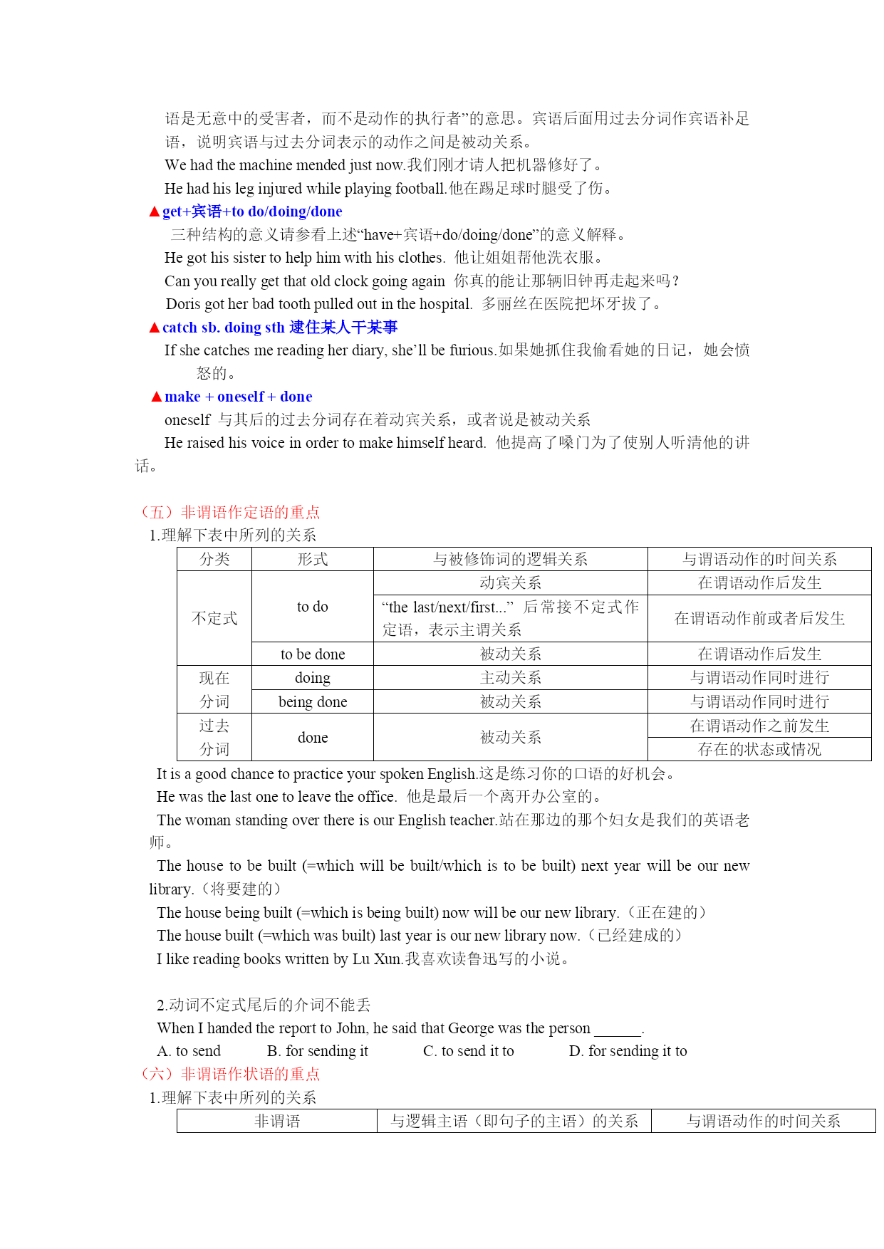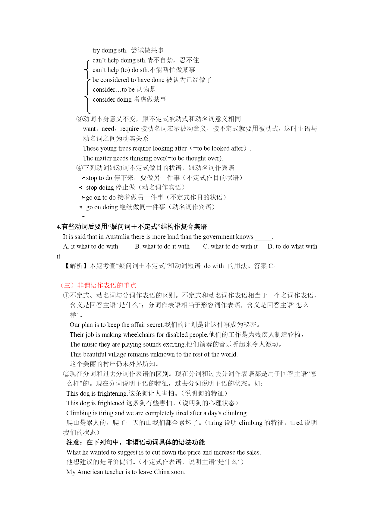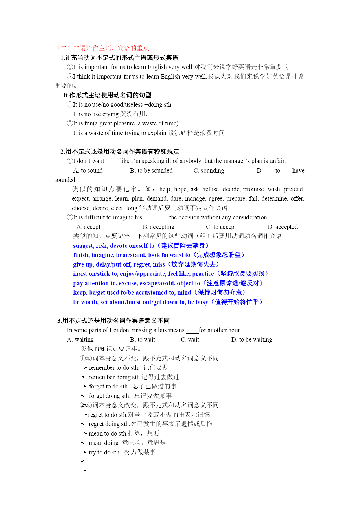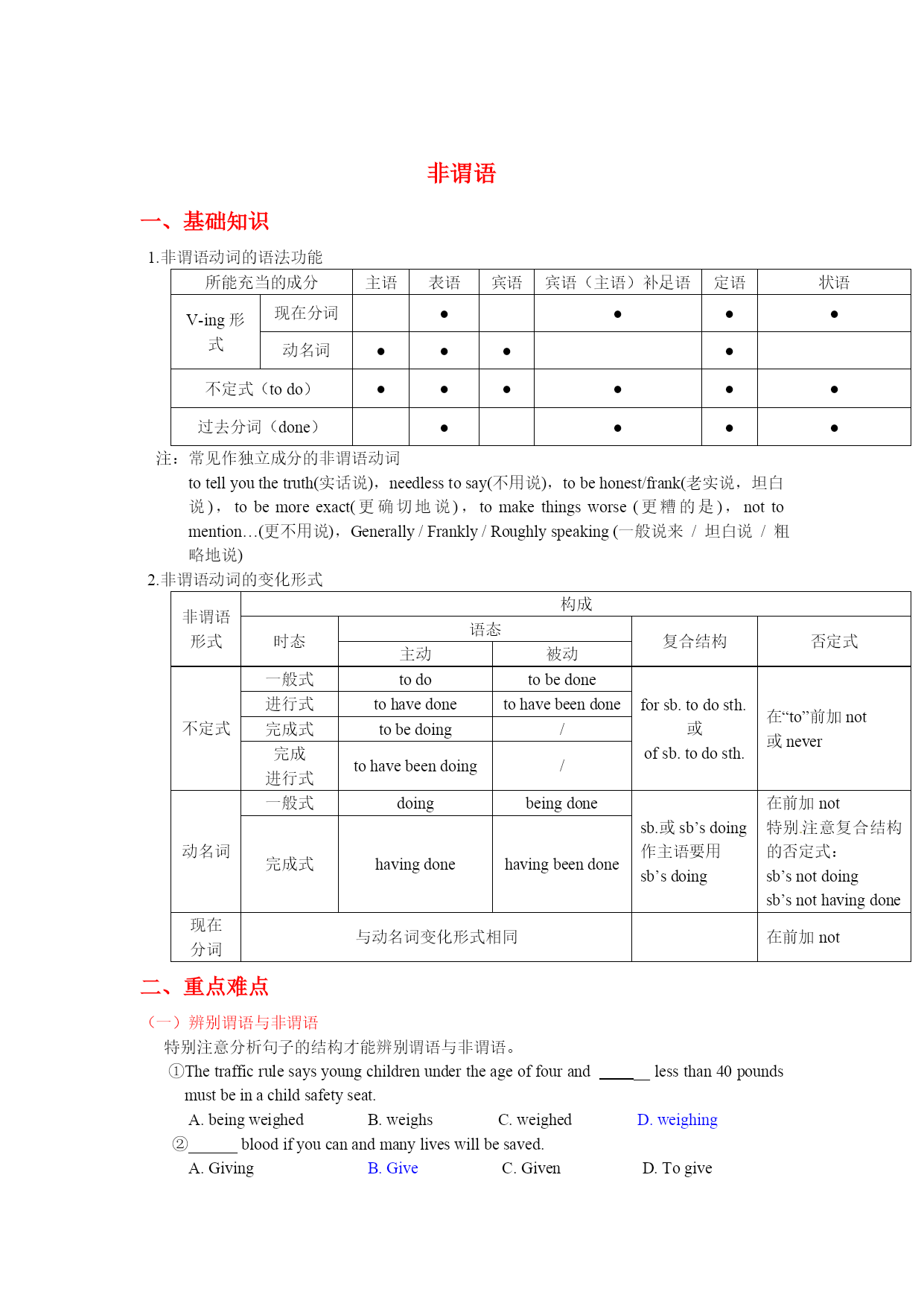 非谓语 一、基础知识 1.非谓语动词的语法功能 所能充当的成分主语表语宾语宾语(主语)补足语定语状语V-ing形式现在分词●●●●动名词●●●●不定式(todo)●●●●●●过去分词(done)●●●●注:常见作独立成分的非谓语动词 totellyouthetruth(实话说),needlesstosay(不用说),tobehonest/frank(老实说,坦白说),tobemoreexact(更确切地说),tomakethingsworse(更糟的是),nottomention…(更不用说),Generally/Frankly/Roughlyspeaking(一般说来/坦白说/粗略地说) 2.非谓语动词的变化形式 非谓语 形式构成时态语态复合结构否定式主动被动不定式一般式todotobedoneforsb.todosth. 或 ofsb.todosth.在“to”前加not 或never进行式tohavedonetohavebeendone完成式tobedoing/完成 进行式tohavebeendoing/动名词一般式doingbeingdonesb.或sb’sdoing 作主语要用 sb’sdoing在前加not 特别注意复合结构的否定式: sb’snotdoing sb’snothavingdone完成式havingdonehavingbeendone现在 分词与动名词变化形式相同在前加not二、重点难点 (一)辨别谓语与非谓语 特别注意分析句子的结构才能辨别谓语与非谓语。 ①Thetrafficrulesaysyoungchildrenundertheageoffourand__lessthan40poundsmustbeinachildsafetyseat. A.beingweighed B.weighsC.weighedD.weighing ②______bloodifyoucanandmanyliveswillbesaved. A.GivingB.Give C.GivenD.Togive (二)非谓语作主语、宾语的重点 1.it充当动词不定式的形式主语或形式宾语 ①ItisimportantforustolearnEnglishverywell.对我们来说学好英语是非常重要的。 ②IthinkitimportantforustolearnEnglishverywell.我认为对我们来说学好英语是非常重要的。 it作形式主语使用动名词的句型 ①Itisnouse/nogood/useless+doingsth. Itisnousecrying.哭没有用。 ②Itisfun(agreatpleasure,awasteoftime) Itisawasteoftimetryingtoexplain.设法解释是浪费时间。 2.用不定式还是用动名词作宾语有特殊规定 ①Idon’twant____likeI’mspeakingillofanybody,butthemanager’splanisunfair. A.tosound B.tobesounded C.sounding D.tohavesounded 类似的知识点要记牢。如:help,hope,ask,refuse,decide,promise,wish,pretend,expect,arrange,learn,plan,demand,dare,manage,agree,prepare,fail,determine,offer,choose,desire,elect,long等动词后要用动词不定式作宾语。 ②Itisdifficulttoimaginehis________thedecisionwithoutanyconsideration. A.accept B.acceptingC.toacceptD.accepted 类似的知识点要记牢。下列常见的这些动词(组)后要用动词动名词作宾语 suggest,risk,devoteoneselfto(建议冒险去献身) finish,imagine,bear/stand,lookforwardto(完成想象忍盼望) giveup,delay/putoff,regret,miss(放弃延期悔失去) insiston/stickto,enjoy/appreciate,feellike,practice(坚持欣赏要实践) payattentionto,excuse,escape/avoid,objectto(注意原谅逃/避反对) keep,be/getusedto/beaccustomedto,mind(保持习惯勿介意) beworth,setabout/burstout/getdownto,bebusy(值得开始