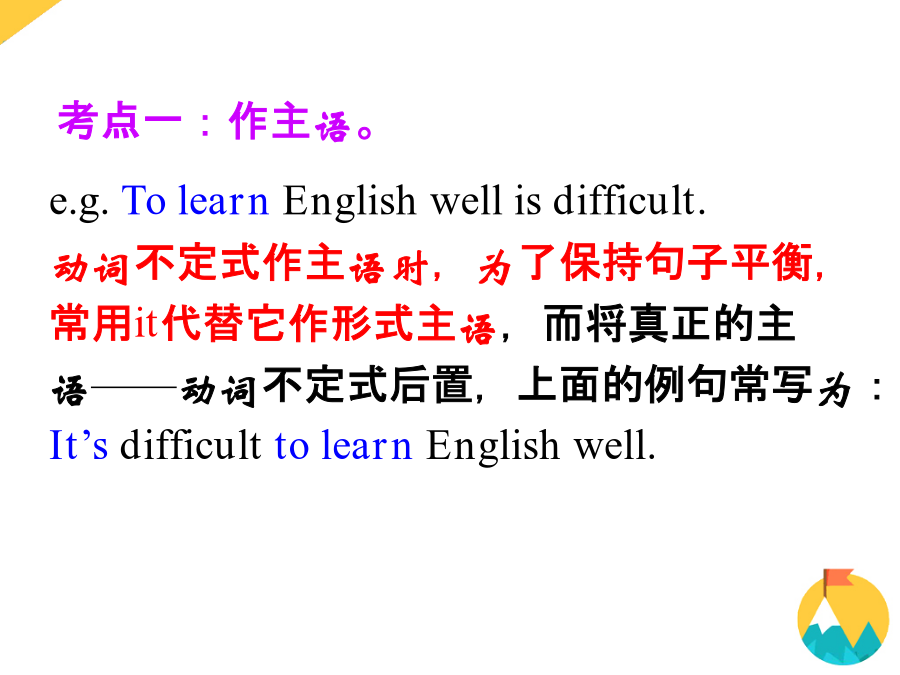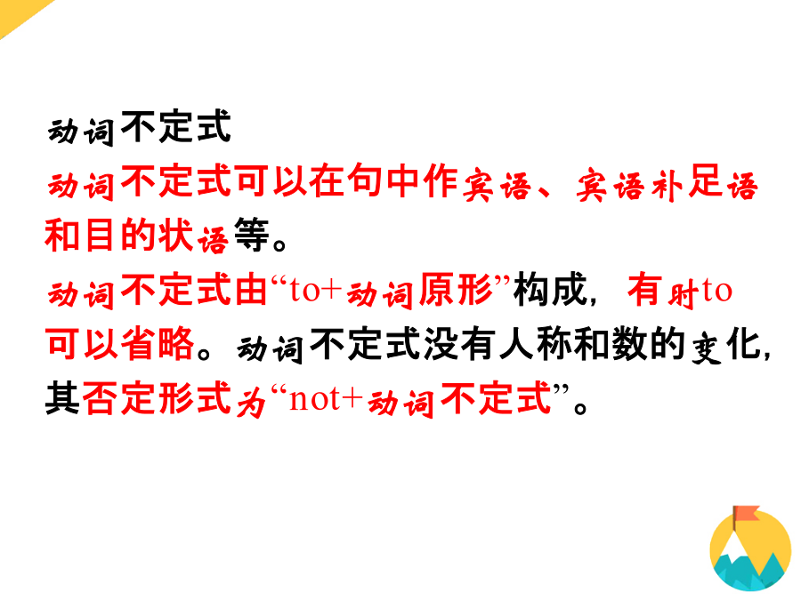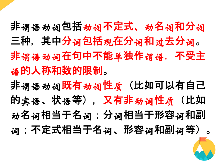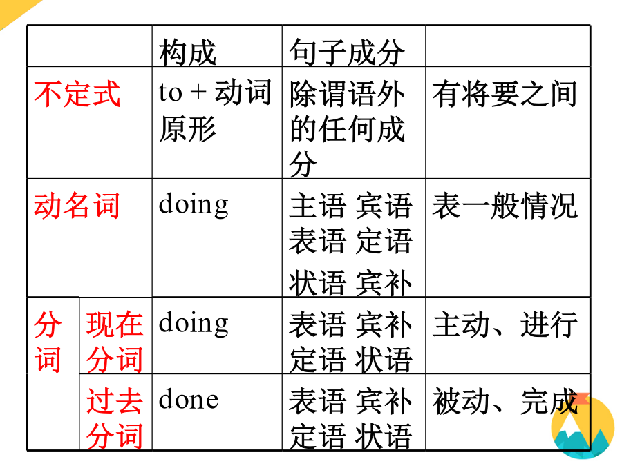 非谓语动词非谓语动词包括动词不定式、动名词和分词三种,其中分词包括现在分词和过去分词。非谓语动词在句中不能单独作谓语,不受主语的人称和数的限制。 非谓语动词既有动词性质(比如可以有自己的宾语、状语等),又有非动词性质(比如动名词相当于名词;分词相当于形容词和副词;不定式相当于名词、形容词和副词等)。动词不定式 动词不定式可以在句中作宾语、宾语补足语和目的状语等。 动词不定式由“to+动词原形”构成,有时to可以省略。动词不定式没有人称和数的变化,其否定形式为“not+动词不定式”。e.g.TolearnEnglishwellisdifficult. 动词不定式作主语时,为了保持句子平衡,常用it代替它作形式主语,而将真正的主语——动词不定式后置,上面的例句常写为:It’sdifficulttolearnEnglishwell.形式主语代替动词不定式的常用句型为: It’s+adj.+(of/forsb.)todosth.或 It’s+n.+(forsb.)todosth.。 e.g.It’sveryniceofyoutooffermeaseat. It’sverydangerousforchildrentocrossthebusystreet. Itwasgreatfuntohaveapicnicthere.考点二:作宾语。 常跟动词不定式作宾语的动词有agree,afford,decide,determine,expect,fail,hope,learn,offer,prepare,plan,promise,refuse,want等。 注意:在find,think等后跟动词不定式作宾语时,常用it作形式宾语,而将真正的宾语——动词不定式后置。 e.g.Ifindithardtogetalongwithhim.1.Theydecided_____abridgeovertheriver.(2015四川遂宁) A.buildB.tobuildC.building 2.IwantedtoseetheBeijingOpera,so Linglingoffered____metowatchan opera.(2016天津) A.tookB.takes C.totakeD.taking3.Shesaidshehoped______herdaughter. (2016湖南邵阳) A.toseeB.youtoseeC.seeing 4.Ican’ttellyouwhatshesaid.I’ve promised_____itasecret.(2016上海) A.keepB.tokeep C.keepingD.kept考点三:作宾语补足语。 1.一些动词后常跟动词不定式作宾语补足语,这类动词有allow,call,want,tell,advise,ask,warn,encourage,invite,order,teach等。 提示:help跟的宾语补足语既可以是带to 的动词不定式,也可以是不带to的动词不 定式。 e.g.Canyouhelpthegirl(to)movethe chair?2.使役动词(如make,let等)及感官动词(如see,feel,hear,watch,notice等)后跟动词不定式作宾语补足语时需省略to。 注意在变为被动语态时要加上to。 e.g.Isawayoungmanentertheroom. Shewasoftenheardtosingthissong.1.Ourteacheroftenadvisesus_____thehabitofmakingnoteswhilereading. (2016苏州) A.todevelopB.develop C.todevelopingD.developing 2.YoushouldaskBob___hisownclothes.Heistenyearsoldnow.(2016重庆A卷) A.washB.washesC.washingD.towash3.Weadviseparents______theirchildren athomealoneinordertokeepthem awayfromdanger.(2016黑龙江东) A.nottoleave B.notleave C.notleavingJoiningasummercampisagreatchance____freetimewithyourfriends. (2016吉林) A.spendB.spendingC.tospend1.—I’llhaveaten-dayholiday.ButIdon’t know______. —HowaboutParis?(2016成都) A.whattodoB.wheretogo