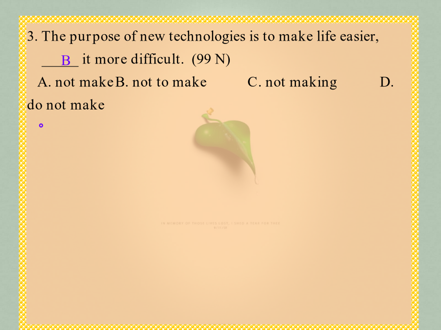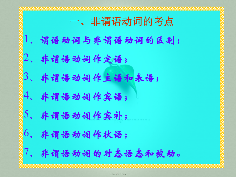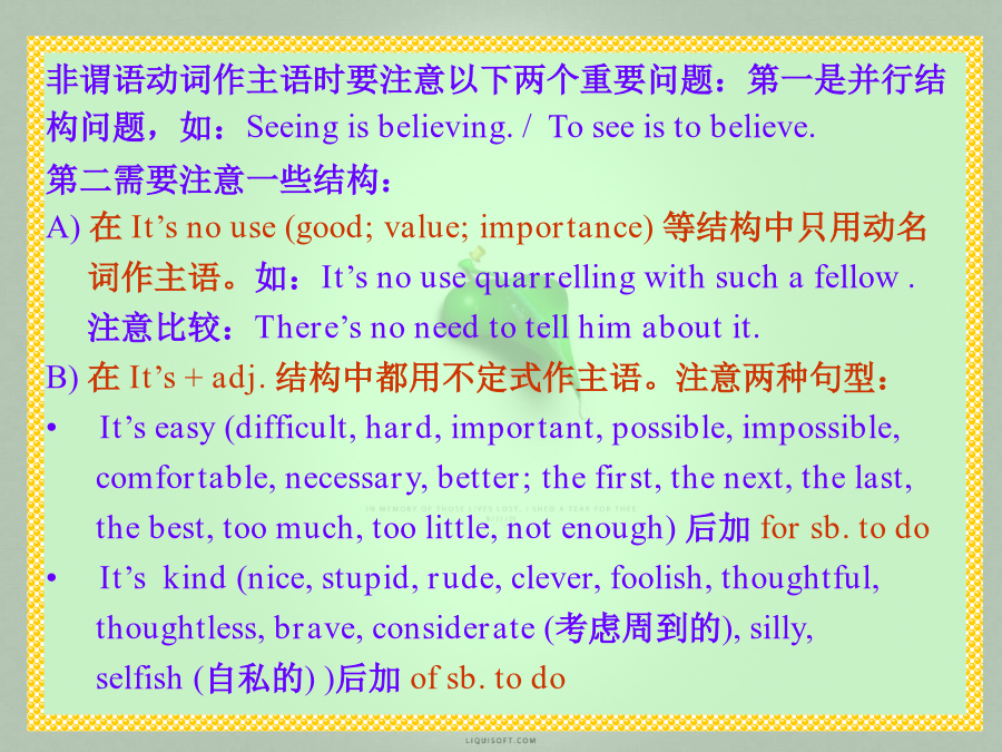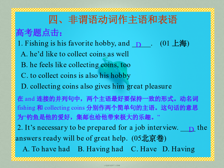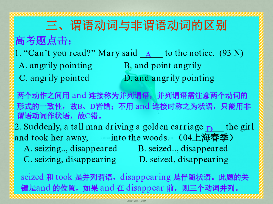 一、非谓语动词的考点 1、谓语动词与非谓语动词的区别; 2、非谓语动词作定语; 3、非谓语动词作主语和表语; 4、非谓语动词作宾语; 5、非谓语动词作宾补; 6、非谓语动词作状语; 7、非谓语动词的时态语态和被动。三、谓语动词与非谓语动词的区别 高考题点击: 1.“Can’tyouread?”Marysaid_____tothenotice.(93N) A.angrilypointing B.andpointangrily C.angrilypointed D.andangrilypointing 2.Suddenly,atallmandrivingagoldencarriage____thegirlandtookheraway,____intothewoods.(04上海春季) A.seizing..,disappearedB.seized..,disappeared C.seizing,disappearingD.seized,disappearing 四、非谓语动词作主语和表语 高考题点击: 1.Fishingishisfavoritehobby,and_____.(01上海) A.he’dliketocollectcoinsaswell B.hefeelslikecollectingcoins,too C.tocollectcoinsisalsohishobby D.collectingcoinsalsogiveshimgreatpleasure 2.It’snecessarytobepreparedforajobinterview.____theanswersreadywillbeofgreathelp.(05北京卷) A.TohavehadB.HavinghadC.HaveD.Having非谓语动词作主语时要注意以下两个重要问题:第一是并行结构问题,如:Seeingisbelieving./Toseeistobelieve. 第二需要注意一些结构: A)在It’snouse(good;value;importance)等结构中只用动名 词作主语。如:It’snousequarrellingwithsuchafellow. 注意比较:There’snoneedtotellhimaboutit. B)在It’s+adj.结构中都用不定式作主语。注意两种句型: It’seasy(difficult,hard,important,possible,impossible, comfortable,necessary,better;thefirst,thenext,thelast, thebest,toomuch,toolittle,notenough)后加forsb.todo It’skind(nice,stupid,rude,clever,foolish,thoughtful, thoughtless,brave,considerate(考虑周到的),silly, selfish(自私的))后加ofsb.todo3.Thepurposeofnewtechnologiesistomakelifeeasier, _____itmoredifficult.(99N) A.notmake B.nottomake C.notmaking D.donotmake 五、非谓语动词作定语 高考题点击: 1.Theflowers____sweetinthebotanicgardenattractthe visitorstothebeautyofnature.(04上海) A.tosmellB.smellingC.smelt D.tobesmelt 2.Amanisbeingquestionedinrelationtothe________murder lastnight.(04江苏) A.advisedB.attendedC.attemptedD.admitted 3.Thepicture_____onthewallispaintedbymynephew. (00北京春季) A.havinghungB.hangingC.hangs D.beinghung 4.Therearefivepairs_____,butI’matalosswhichtobuy. (99上海) A.tobechosen B.tochoosefrom C.tochoose D.forchoosing 非谓语动词作定语时要注意以下区别: 分词作定语时与其所修饰的名词有逻辑上的主谓关系; 动名词作定语时只表示用途、场所等意义; 不定式作定语时要注意以下一些固定结构: 在time,chance,right等名词后; 在