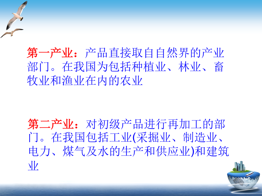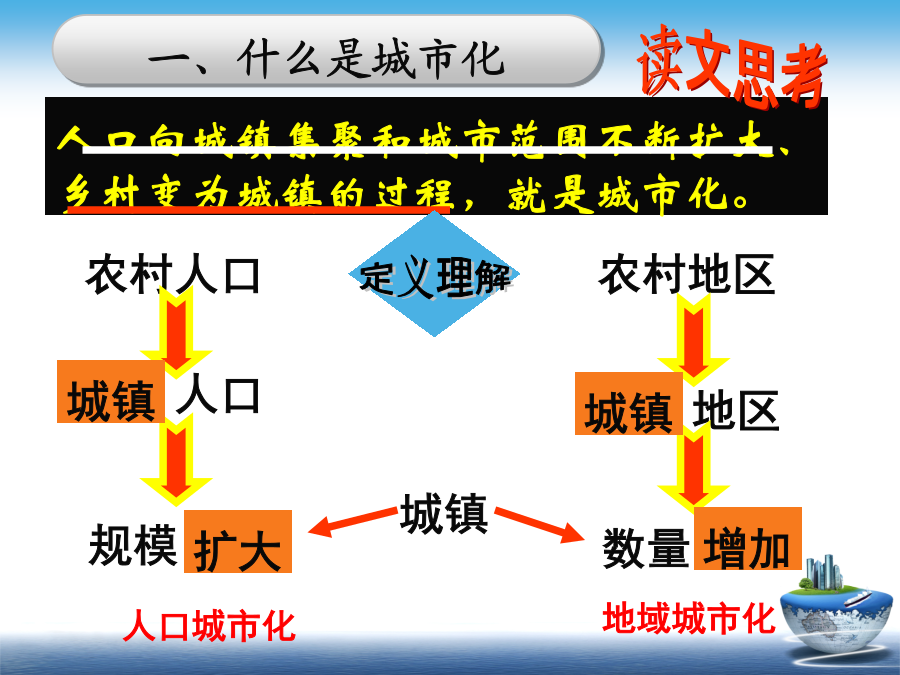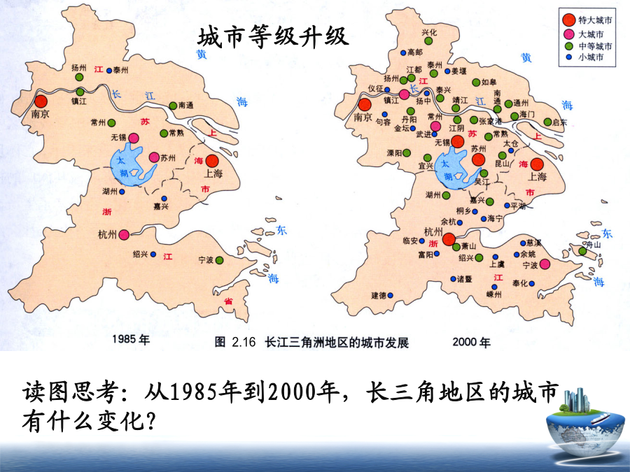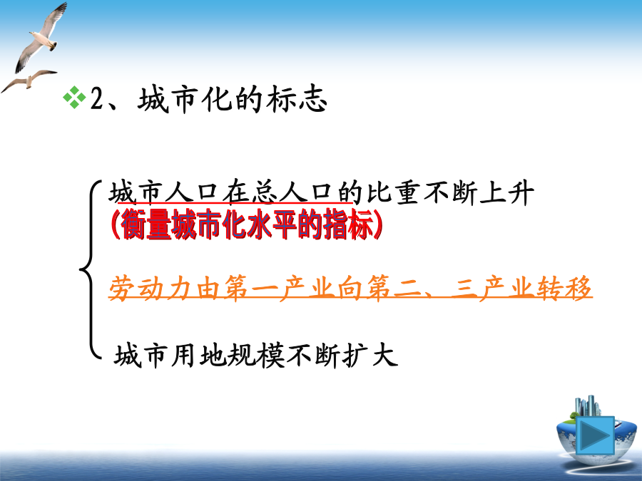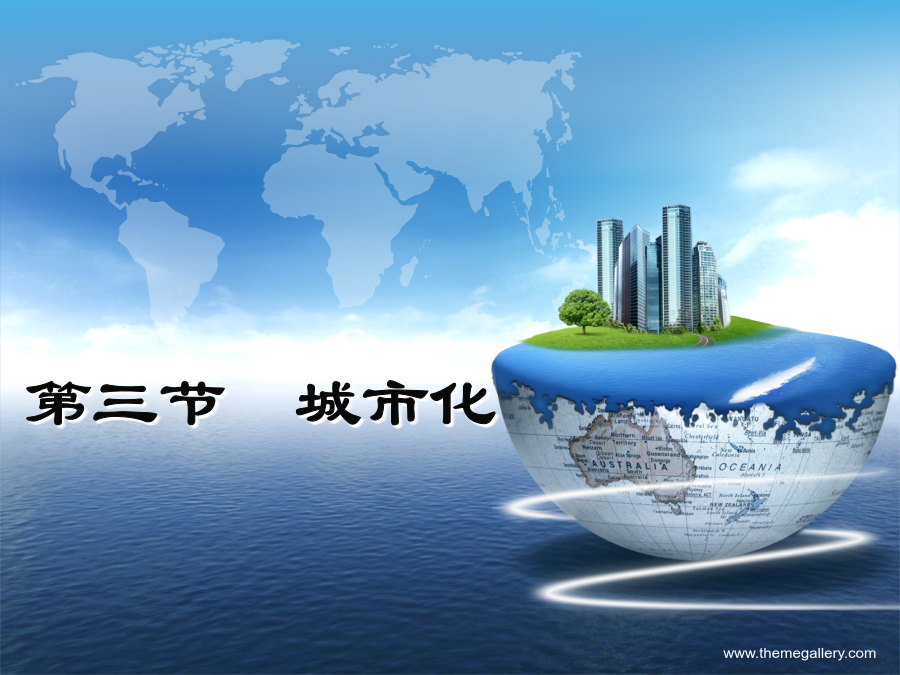 读图思考:从1985年到2000年,长三角地区的城市有什么变化?www.themegallery.com人口向城镇集聚和城市范围不断扩大、 乡村变为城镇的过程,就是城市化。2、城市化的标志第一产业:产品直接取自自然界的产业部门。在我国为包括种植业、林业、畜牧业和渔业在内的农业第三产业:在再生产过程中为生产和消费提供各种服务的部门。包括流通和服务两大部门,具体分为四个层次: 一是流通部门:交通运输业、邮电通讯业、商业饮食业、物资供销和仓储业; 二是为生产和生活服务的部门:金融业、保险业、地质普查业、房地产管理业、公用事业、居民服务业、旅游业、信息咨询服务业和各类技术服务业、制造业; 三是为提高科学文化水平和居民素质服务的部门:教育、文化、广播、电视、科学研究、卫生、体育和社会福利事业; 四是国家机关、政党机关、社会团体、警察、军队等,但在国内不计入第三产业产值和国民生产总值。由此可见,这种第三产业基本是一种服务性产业。C推动城市化发展的动力①、带动________________发展; ②、带来_____________的变化; ③、带来_____________、_____________、_____________ 等的巨大变化,它是一个地区_____________ 发展的必然结果,是_____________的表现。城市化进程示意图活动参与(1)1800-2000年,世界城市化水平有什么变化,城市化速度有什么变化?城市化的特点城市化特点 1、发达国家城市化时间早;发展中国家晚参照图2.18和2.19,分析图2.23,并回答下列问题。1、目前各国分别处于城市化的哪一个阶段? 请判断连线。中国的城市化进程下图是“某城市建设前后水量平衡示意图”,读图回答(1)~(2)题。3、下图表示一个地理事物由t1到t4的历史发展过程,读图后完成下列要求:1、按城市发展过程,下列四幅图的排序依次是 A.a—d—b—cB.a—c—d—b C.d—b—c—aD.c-d—b—a 2、该城市在此发展过程中出现的现象是 A.城市人口逐渐向市中心集聚B.出现逆城市化趋势 C.城市用地规模逐渐减小D.市区交通流量明显减小 3、b图距市中心8千米处最有可能分布的城市功能区是 A.商业区B.行政区C.工业区D.住宅区3、下列有关世界城市化进程的阐述正确的是 A.发达国家城市人口比重大、增长快 B.发达国家城市人口比重大、增长缓 C.发展中国家城市人口比重小、增长缓 D.发展中国家城市人口比重大、增长快5、发展中国家城市化的主要特点是 A.与发达国家相比,城市化的起步晚、发展慢 B.少数大城市过度膨胀,中小城市发展缓慢 C.发展中国家整体城市化水平远远高于发达国家 D.小城市迅速发展,明显出现逆城市化现象1.二次世界大战结束后,世界城市化的特点是()A.世界城市化的速度、规模、范围都达空前的程度B.中小城市发展快,大城市发展慢C.由于城市人口不断集中,城市用地规模不断缩小D.城市化开始加速发展,城市人口的比重达到13.3%3.二次大战后,发展中国家城市化特点的叙述,错误的是()A.发展超过了同时期的发达国家B.发展速度比发达国家以往的最高速度还快C.城市人口的比重还不足发达国家的一半D.大城市发展慢,中小城市发展迅速5.关于发达国家与发展中国家城市化特点的错误叙述是()A.发达国家起步早,发展中国家起步晚B.发达国家发展快,发展中国家发展慢C.发达国家水平高,发展中国家水平低D.发达国家出现逆城市化现象,发展中国家城市发展不合理8.今后我国城市化的方向应该是() 大城市的人口向西部转移 大城市的人口向中小城市转移 C.农村人口向大城市转移 D.农村人口向中小城市及小城镇转移 9.目前,在西方国家的大城市里出现逆城市化现象的原因是() A.环境污染比发展中国家城市更严重 B.城市基础设施老化,农村基础设施完善 C.人们对环境质量要求提高,乡村小城镇基础设施逐步完善 D.先在美国,后在其它发达国家出现 英国的城市化过程“再城市化”(第二次城市化)巧填数字