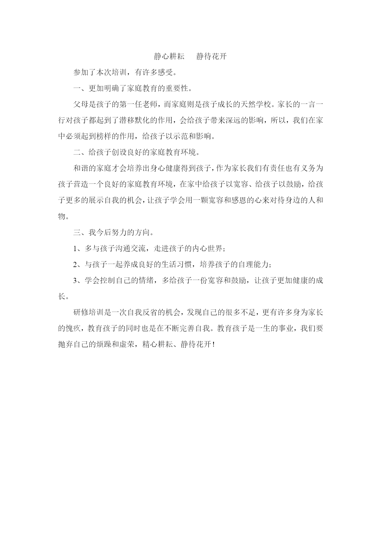静心耕耘静待花开 参加了本次培训,有许多感受。 一、更加明确了家庭教育的重要性。 父母是孩子的第一任老师,而家庭则是孩子成长的天然学校。家长的一言一行对孩子都起到了潜移默化的作用,会给孩子带来深远的影响,所以,我们在家中必须起到榜样的作用,给孩子以示范和影响。 二、给孩子创设良好的家庭教育环境。 和谐的家庭才会培养出身心健康得到孩子,作为家长我们有责任也有义务为孩子营造一个良好的家庭教育环境,在家中给孩子以宽容、给孩子以鼓励,给孩子更多的展示自我的机会,让孩子学会用一颗宽容和感恩的心来对待身边的人和物。 三、我今后努力的方向。 1、多与孩子沟通交流,走进孩子的内心世界; 2、与孩子一起养成良好的生活习惯,培养孩子的自理能力; 3、学会控制自己的情绪,多给孩子一份宽容和鼓励,让孩子更加健康的成长。 研修培训是一次自我反省的机会,发现自己的很多不足,更有许多身为家长的愧疚,教育孩子的同时也是在不断完善自我。教育孩子是一生的事业,我们要抛弃自己的烦躁和虚荣,精心耕耘、静待花开!