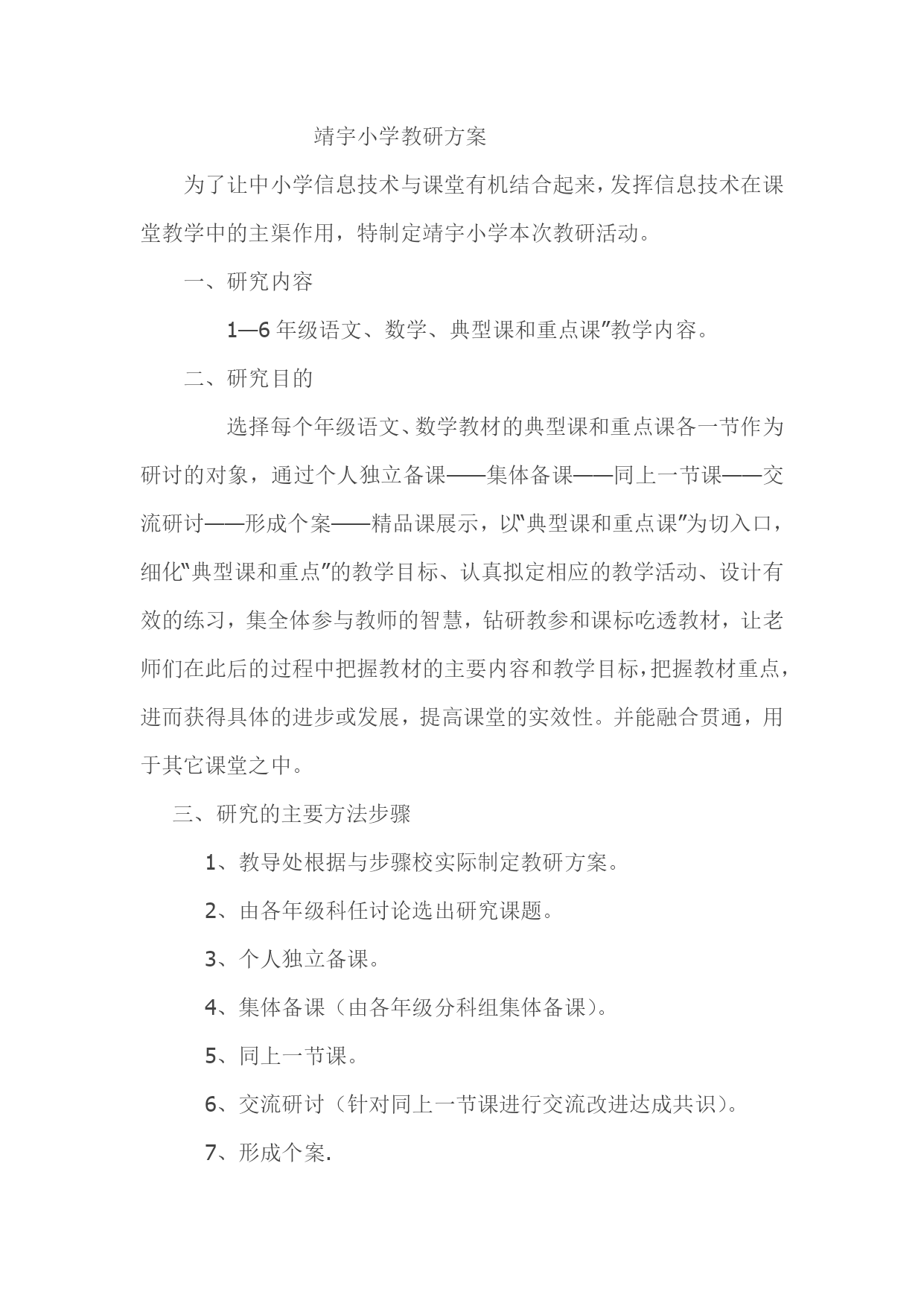 靖宇小学教研方案 为了让中小学信息技术与课堂有机结合起来,发挥信息技术在课堂教学中的主渠作用,特制定靖宇小学本次教研活动。 一、研究内容 1—6年级语文、数学、典型课和重点课”教学内容。 二、研究目的 选择每个年级语文、数学教材的典型课和重点课各一节作为研讨的对象,通过个人独立备课——集体备课——同上一节课——交流研讨——形成个案——精品课展示,以“典型课和重点课”为切入口,细化“典型课和重点”的教学目标、认真拟定相应的教学活动、设计有效的练习,集全体参与教师的智慧,钻研教参和课标吃透教材,让老师们在此后的过程中把握教材的主要内容和教学目标,把握教材重点,进而获得具体的进步或发展,提高课堂的实效性。并能融合贯通,用于其它课堂之中。 三、研究的主要方法步骤 1、教导处根据与步骤校实际制定教研方案。 2、由各年级科任讨论选出研究课题。 3、个人独立备课。 4、集体备课(由各年级分科组集体备课)。 5、同上一节课。 6、交流研讨(针对同上一节课进行交流改进达成共识)。 7、形成个案.
