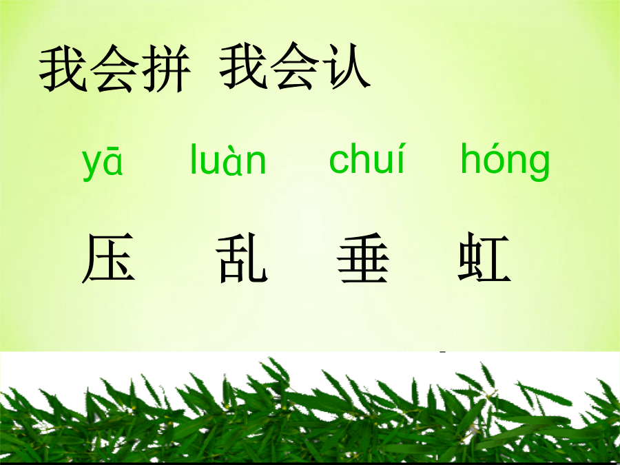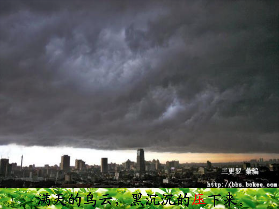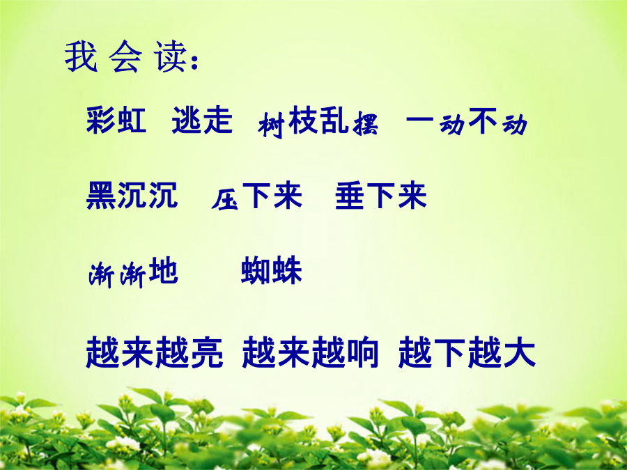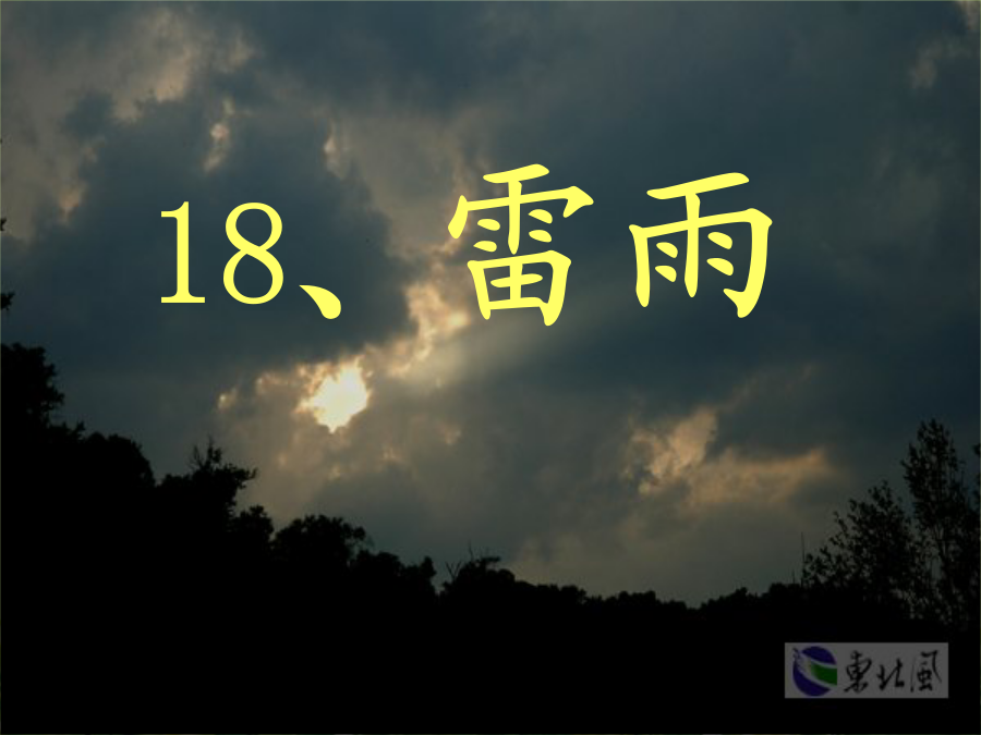 18、雷雨 满天的乌云,黑沉沉的压下来。彩虹逃走树枝乱摆一动不动 黑沉沉压下来垂下来 渐渐地蜘蛛 越来越亮越来越响越下越大我会拼雷雨前满天的乌云,黑沉沉地压下来。树上的叶子一动不动,蝉一声也不叫。 忽然一阵大风,吹得树枝乱摆。一只蜘蛛从网上垂下来,逃走了。 闪电越来越亮,雷声越来越响。一只蜘蛛从网上垂下来,逃走了。句子比较1乌云树叶蝉树枝 蜘蛛闪电雷声读准这些句子吧! 1.满天的乌云,黑沉沉地压下来。 2.忽然一阵大风,吹得树枝乱摆。3.一只蜘蛛从网上垂下来,逃走了。 4.一条彩虹挂在天空。一只蜘蛛从网上垂下来,逃走了。闪电越来越亮,雷声越来越响。2、闪电越(yuè)来越亮,雷声越来越响。句子比较2雷雨时从三个“哗”字中你想到什么呢? 为什么说树哇,房子啊,都看不清了呢?用了两个“渐渐地”,你读懂什么了?试试吧! 自由读7-8段,圈出7-8段描写雷雨后的哪些景物?我会比。天空气雨太阳彩虹 蝉蜘蛛池塘青蛙雷雨后雨后图片展播 模仿《雷雨》,写一则观察天气的小日记。哗,哗,哗,雨下起来了。 雨越下越大。往窗外望去,树哇,房子啊,都看不清了。 渐渐地,渐渐地,雷声小了,雨声也小了。照样子,说词语