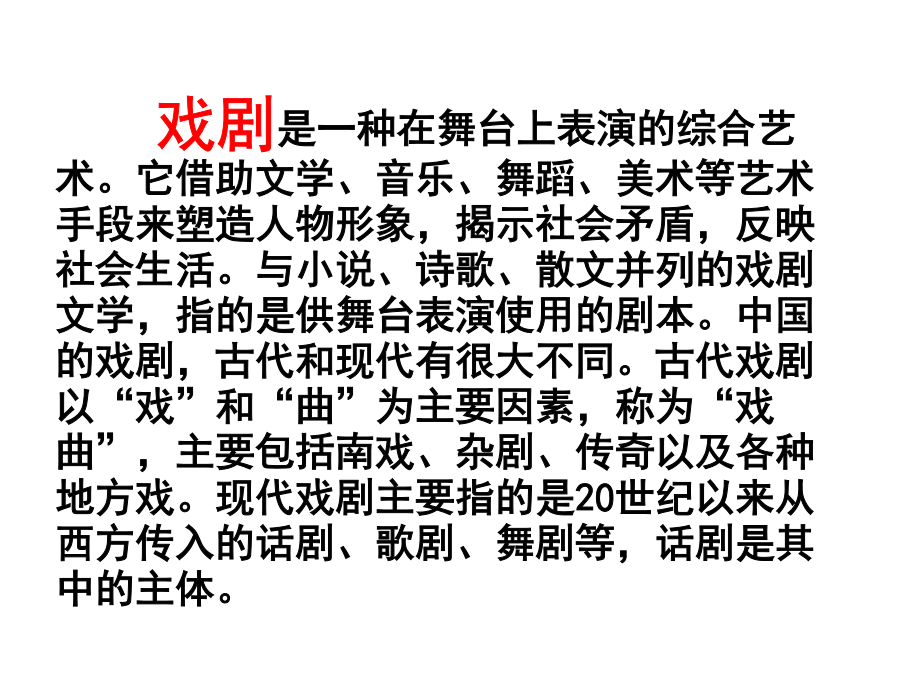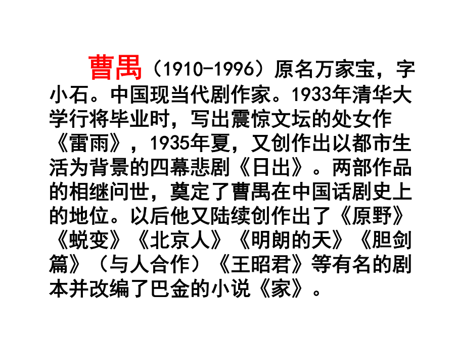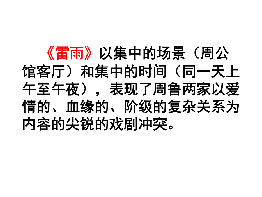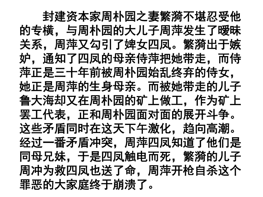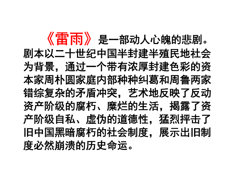 戏剧是一种在舞台上表演的综合艺术。它借助文学、音乐、舞蹈、美术等艺术手段来塑造人物形象,揭示社会矛盾,反映社会生活。与小说、诗歌、散文并列的戏剧文学,指的是供舞台表演使用的剧本。中国的戏剧,古代和现代有很大不同。古代戏剧以“戏”和“曲”为主要因素,称为“戏曲”,主要包括南戏、杂剧、传奇以及各种地方戏。现代戏剧主要指的是20世纪以来从西方传入的话剧、歌剧、舞剧等,话剧是其中的主体。曹禺(1910-1996)原名万家宝,字小石。中国现当代剧作家。1933年清华大学行将毕业时,写出震惊文坛的处女作《雷雨》,1935年夏,又创作出以都市生活为背景的四幕悲剧《日出》。两部作品的相继问世,奠定了曹禺在中国话剧史上的地位。以后他又陆续创作出了《原野》《蜕变》《北京人》《明朗的天》《胆剑篇》(与人合作)《王昭君》等有名的剧本并改编了巴金的小说《家》。《雷雨》是一部动人心魄的悲剧。剧本以二十世纪中国半封建半殖民地社会为背景,通过一个带有浓厚封建色彩的资本家周朴圆家庭内部种种纠葛和周鲁两家错综复杂的矛盾冲突,艺术地反映了反动资产阶级的腐朽、糜烂的生活,揭露了资产阶级自私、虚伪的道德性,猛烈抨击了旧中国黑暗腐朽的社会制度,展示出旧制度必然崩溃的历史命运。 封建资本家周朴园之妻繁漪不堪忍受他的专横,与周朴园的大儿子周萍发生了暧昧关系,周萍又勾引了婢女四凤。繁漪出于嫉妒,通知了四凤的母亲侍萍把她带走,而侍萍正是三十年前被周朴园始乱终弃的侍女,她正是周萍的生身母亲。而被她带走的儿子鲁大海却又在周朴园的矿上做工,作为矿上罢工代表,正和周朴园面对面的展开斗争。这些矛盾同时在这天下午激化,趋向高潮。经过一番矛盾冲突,周萍四凤知道了他们是同母兄妹,于是四凤触电而死,繁漪的儿子周冲为救四凤也送了命,周萍开枪自杀这个罪恶的大家庭终于崩溃了。《雷雨》以集中的场景(周公馆客厅)和集中的时间(同一天上午至午夜),表现了周鲁两家以爱情的、血缘的、阶级的复杂关系为内容的尖锐的戏剧冲突。课文结构