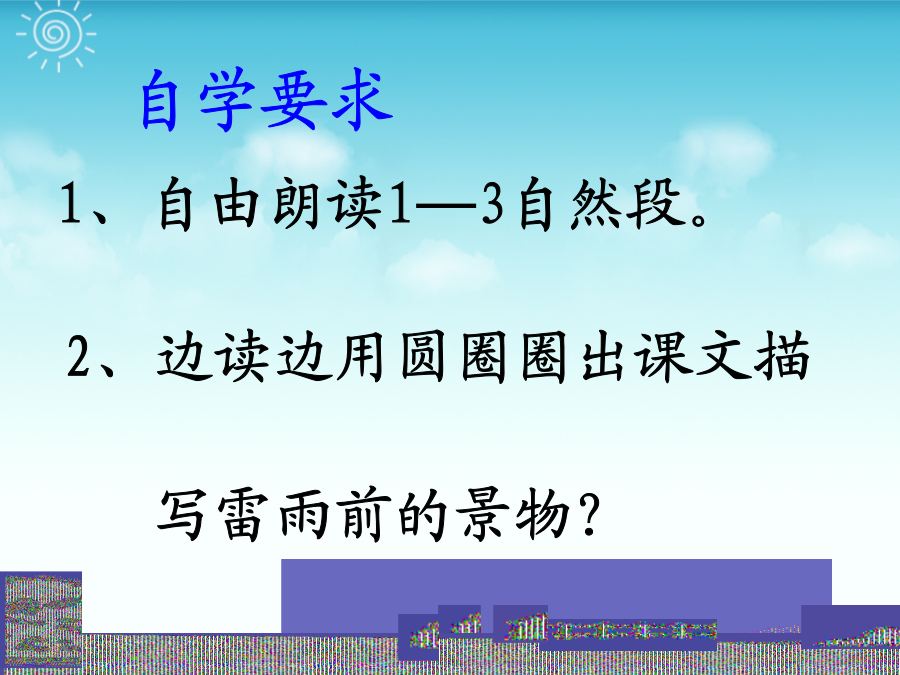 青蛙也叫起来了。雨停了。太阳出来了。一条彩虹挂在天空。蝉叫了。蜘蛛又坐在网上了。池塘里水满了,青蛙也叫了起来了。雨后的景象多美啊,还有谁也出来了?他在干什么?课后作业:
