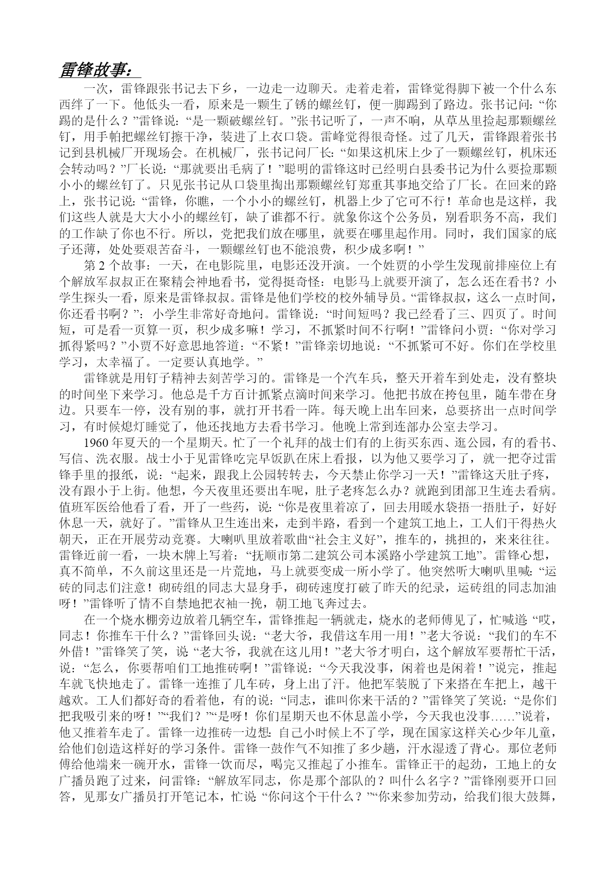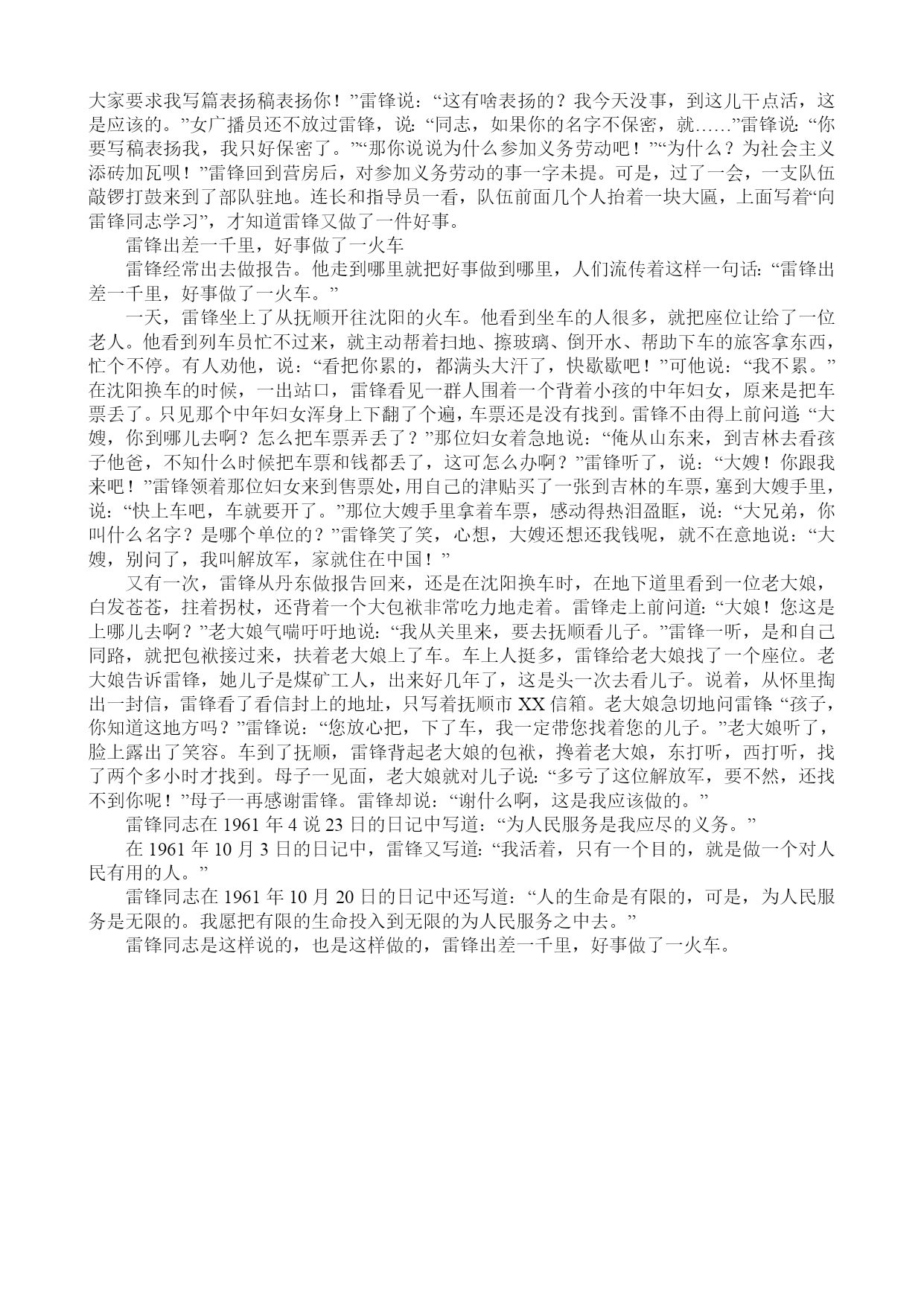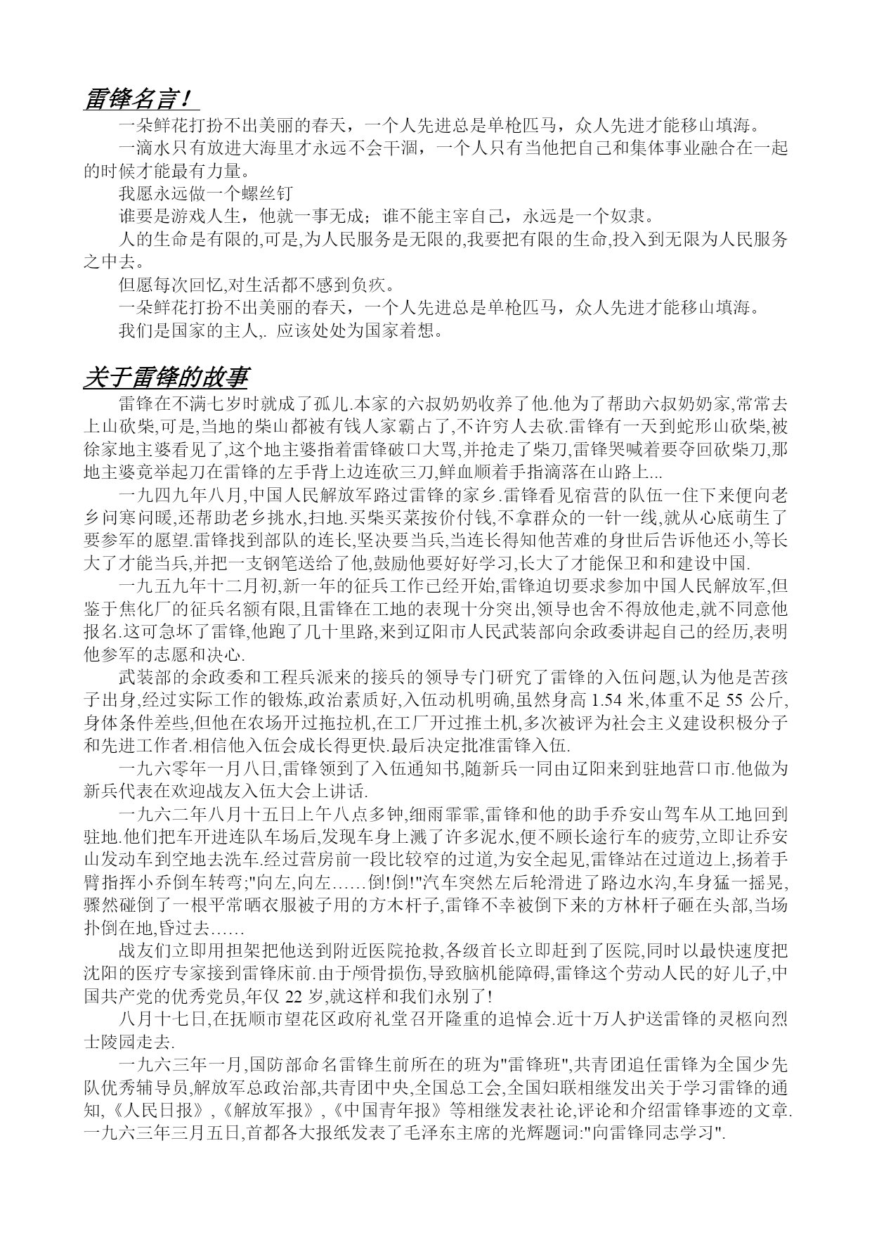 雷锋名言! 一朵鲜花打扮不出美丽的春天,一个人先进总是单枪匹马,众人先进才能移山填海。 一滴水只有放进大海里才永远不会干涸,一个人只有当他把自己和集体事业融合在一起的时候才能最有力量。 我愿永远做一个螺丝钉 谁要是游戏人生,他就一事无成;谁不能主宰自己,永远是一个奴隶。 人的生命是有限的,可是,为人民服务是无限的,我要把有限的生命,投入到无限为人民服务之中去。 但愿每次回忆,对生活都不感到负疚。 一朵鲜花打扮不出美丽的春天,一个人先进总是单枪匹马,众人先进才能移山填海。 我们是国家的主人,.应该处处为国家着想。 关于雷锋的故事 雷锋在不满七岁时就成了孤儿.本家的六叔奶奶收养了他.他为了帮助六叔奶奶家,常常去上山砍柴,可是,当地的柴山都被有钱人家霸占了,不许穷人去砍.雷锋有一天到蛇形山砍柴,被徐家地主婆看见了,这个地主婆指着雷锋破口大骂,并抢走了柴刀,雷锋哭喊着要夺回砍柴刀,那地主婆竟举起刀在雷锋的左手背上边连砍三刀,鲜血顺着手指滴落在山路上... 一九四九年八月,中国人民解放军路过雷锋的家乡.雷锋看见宿营的队伍一住下来便向老乡问寒问暖,还帮助老乡挑水,扫地.买柴买菜按价付钱,不拿群众的一针一线,就从心底萌生了要参军的愿望.雷锋找到部队的连长,坚决要当兵,当连长得知他苦难的身世后告诉他还小,等长大了才能当兵,并把一支钢笔送给了他,鼓励他要好好学习,长大了才能保卫和和建设中国. 一九五九年十二月初,新一年的征兵工作已经开始,雷锋迫切要求参加中国人民解放军,但鉴于焦化厂的征兵名额有限,且雷锋在工地的表现十分突出,领导也舍不得放他走,就不同意他报名.这可急坏了雷锋,他跑了几十里路,来到辽阳市人民武装部向余政委讲起自己的经历,表明他参军的志愿和决心. 武装部的余政委和工程兵派来的接兵的领导专门研究了雷锋的入伍问题,认为他是苦孩子出身,经过实际工作的锻炼,政治素质好,入伍动机明确,虽然身高1.54米,体重不足55公斤,身体条件差些,但他在农场开过拖拉机,在工厂开过推土机,多次被评为社会主义建设积极分子和先进工作者.相信他入伍会成长得更快.最后决定批准雷锋入伍. 一九六零年一月八日,雷锋领到了入伍通知书,随新兵一同由辽阳来到驻地营口市.他做为新兵代表在欢迎战友入伍大会上讲话. 一九六二年八月十五日上午八点多钟,细雨霏霏,雷锋和他的助手乔安山驾车从工地回到驻地.他们把车开进连队车场后,发现车身上溅了许多泥水,便不顾长途行车的疲劳,立即让乔安山发动车到空地去洗车.经过营房前一段比较窄的过道,为安全起见,雷锋站在过道边上,扬着手臂指挥小乔倒车转弯;"向左,向左……倒!倒!"汽车突然左后轮滑进了路边水沟,车身猛一摇晃,骤然碰倒了一根平常晒衣服被子用的方木杆子,雷锋不幸被倒下来的方林杆子砸在头部,当场扑倒在地,昏过去…… 战友们立即用担架把他送到附近医院抢救,各级首长立即赶到了医院,同时以最快速度把沈阳的医疗专家接到雷锋床前.由于颅骨损伤,导致脑机能障碍,雷锋这个劳动人民的好儿子,中国共产党的优秀党员,年仅22岁,就这样和我们永别了! 八月十七日,在抚顺市望花区政府礼堂召开隆重的追悼会.近十万人护送雷锋的灵柩向烈士陵园走去. 一九六三年一月,国防部命名雷锋生前所在的班为"雷锋班",共青团追任雷锋为全国少先队优秀辅导员,解放军总政治部,共青团中央,全国总工会,全国妇联相继发出关于学习雷锋的通知,《人民日报》,《解放军报》,《中国青年报》等相继发表社论,评论和介绍雷锋事迹的文章.一九六三年三月五日,首都各大报纸发表了毛泽东主席的光辉题词:"向雷锋同志学习". 雷锋故事: 一次,雷锋跟张书记去下乡,一边走一边聊天。走着走着,雷锋觉得脚下被一个什么东西绊了一下。他低头一看,原来是一颗生了锈的螺丝钉,便一脚踢到了路边。张书记问:“你踢的是什么?”雷锋说:“是一颗破螺丝钉。”张书记听了,一声不响,从草丛里捡起那颗螺丝钉,用手帕把螺丝钉擦干净,装进了上衣口袋。雷峰觉得很奇怪。过了几天,雷锋跟着张书记到县机械厂开现场会。在机械厂,张书记问厂长:“如果这机床上少了一颗螺丝钉,机床还会转动吗?”厂长说:“那就要出毛病了!”聪明的雷锋这时已经明白县委书记为什么要捡那颗小小的螺丝钉了。只见张书记从口袋里掏出那颗螺丝钉郑重其事地交给了厂长。在回来的路上,张书记说:“雷锋,你瞧,一个小小的螺丝钉,机器上少了它可不行!革命也是这样,我们这些人就是大大小小的螺丝钉,缺了谁都不行。就象你这个公务员,别看职务不高,我们的工作缺了你也不行。所以,党把我们放在哪里,就要在哪里起作用。同时,我们国家的底子还薄,处处要艰苦奋斗,一颗螺丝钉也不能浪费,积少成多啊!” 第2个故事:一天,在电影院里,电影还没开演。一个姓贾的小学生发现前排座位上有个解放军叔叔正在聚精会神地看书,觉得挺奇怪:电影马上