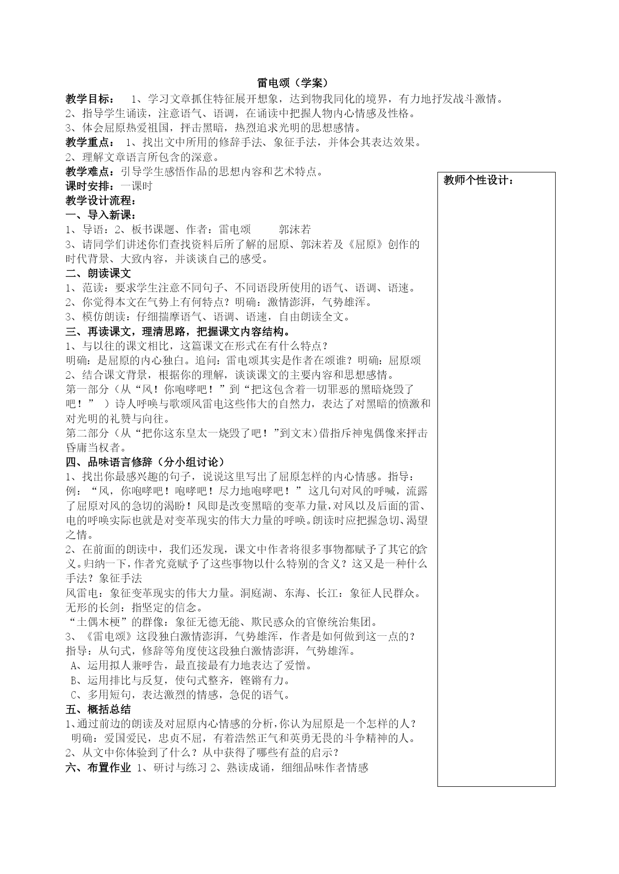雷电颂(学案) 教学目标:1、学习文章抓住特征展开想象,达到物我同化的境界,有力地抒发战斗激情。 2、指导学生诵读,注意语气、语调,在诵读中把握人物内心情感及性格。 3、体会屈原热爱祖国,抨击黑暗,热烈追求光明的思想感情。 教学重点:1、找出文中所用的修辞手法、象征手法,并体会其表达效果。 2、理解文章语言所包含的深意。 教师个性设计:教学难点:引导学生感悟作品的思想内容和艺术特点。 课时安排:一课时 教学设计流程: 一、导入新课: 1、导语:2、板书课题、作者:雷电颂郭沫若 3、请同学们讲述你们查找资料后所了解的屈原、郭沫若及《屈原》创作的 时代背景、大致内容,并谈谈自己的感受。 二、朗读课文 1、范读:要求学生注意不同句子、不同语段所使用的语气、语调、语速。 2、你觉得本文在气势上有何特点?明确:激情澎湃,气势雄浑。 3、模仿朗读:仔细揣摩语气、语调、语速,自由朗读全文。 三、再读课文,理清思路,把握课文内容结构。 1、与以往的课文相比,这篇课文在形式在有什么特点? 明确:是屈原的内心独白。追问:雷电颂其实是作者在颂谁?明确:屈原颂 2、结合课文背景,根据你的理解,谈谈课文的主要内容和思想感情。 第一部分(从“风!你咆哮吧!”到“把这包含着一切罪恶的黑暗烧毁了吧!”)诗人呼唤与歌颂风雷电这些伟大的自然力,表达了对黑暗的愤激和对光明的礼赞与向往。 第二部分(从“把你这东皇太一烧毁了吧!”到文末)借指斥神鬼偶像来抨击昏庸当权者。 四、品味语言修辞(分小组讨论) 1、找出你最感兴趣的句子,说说这里写出了屈原怎样的内心情感。指导: 例:“风,你咆哮吧!咆哮吧!尽力地咆哮吧!”这几句对风的呼喊,流露了屈原对风的急切的渴盼!风即是改变黑暗的变革力量,对风以及后面的雷、电的呼唤实际也就是对变革现实的伟大力量的呼唤。朗读时应把握急切、渴望之情。 2、在前面的朗读中,我们还发现,课文中作者将很多事物都赋予了其它的含义。归纳一下,作者究竟赋予了这些事物以什么特别的含义?这又是一种什么手法?象征手法 风雷电:象征变革现实的伟大力量。洞庭湖、东海、长江:象征人民群众。 无形的长剑:指坚定的信念。 “土偶木梗”的群像:象征无德无能、欺民惑众的官僚统治集团。 3、《雷电颂》这段独白激情澎湃,气势雄浑,作者是如何做到这一点的? 指导:从句式,修辞等角度使这段独白激情澎湃,气势雄浑。 A、运用拟人兼呼告,最直接最有力地表达了爱憎。 B、运用排比与反复,使句式整齐,铿锵有力。 C、多用短句,表达激烈的情感,急促的语气。 五、概括总结 1、通过前边的朗读及对屈原内心情感的分析,你认为屈原是一个怎样的人? 明确:爱国爱民,忠贞不屈,有着浩然正气和英勇无畏的斗争精神的人。 2、从文中你体验到了什么?从中获得了哪些有益的启示? 六、布置作业1、研讨与练习2、熟读成诵,细细品味作者情感