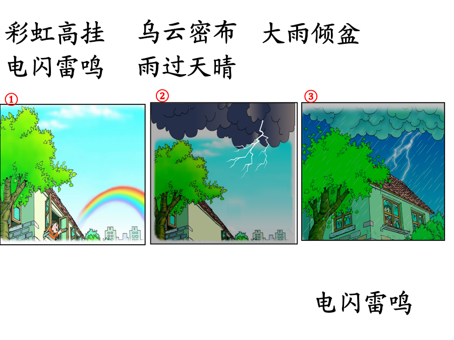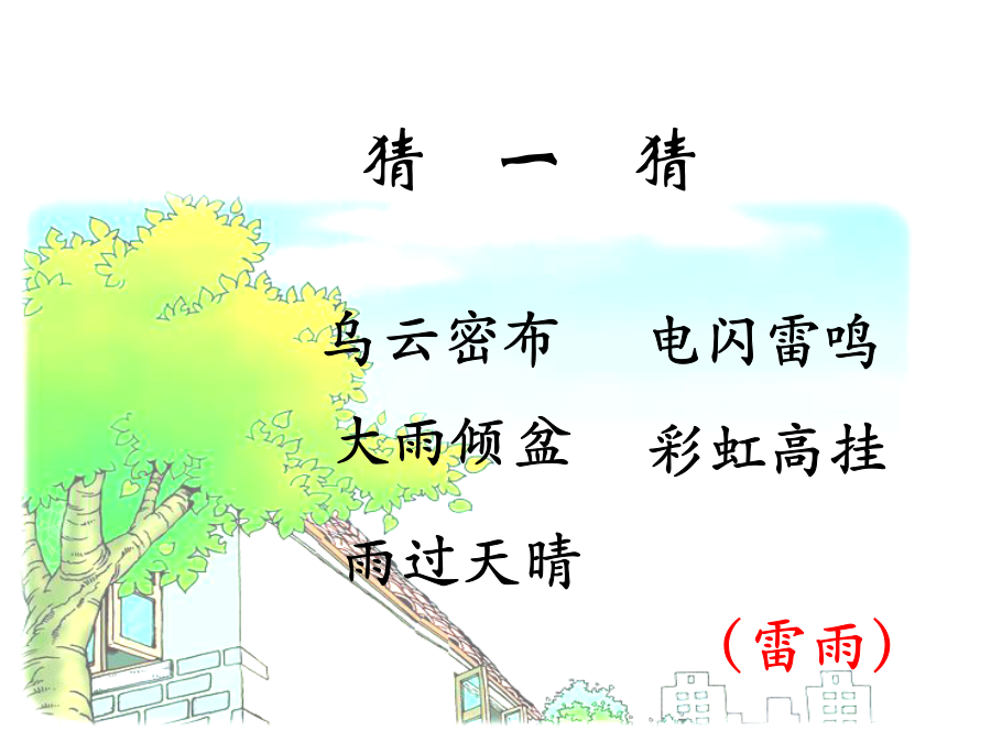 猜一猜猜一猜猜一猜彩虹高挂彩虹高挂 雨过天晴蜘蛛蝉彩虹乱摆迎面扑来 垂下来压下来越来越亮 越来越响 越下越大蜘蛛蝉彩虹雷雨前满天的乌云,黑沉沉地压下来。 树上的叶子一动不动,蝉一声也不叫。满天的乌云,黑沉沉地压下来。 树上的叶子一动不动,蝉一声也不叫。满天的乌云,黑沉沉地压下来。大雨就要来到 悄悄地, 悄悄地, 乌云。 静静地, 静静地, 树叶。 蝉。 呼啦啦, 呼啦啦, 大风。 树枝。 大雨就要来到 悄悄地, 悄悄地, 乌云压下来了。 静静地, 静静地, 树叶不动了。 蝉也不叫了。 呼啦啦, 呼啦啦, 大风吹起来了。 树枝乱摆了。 压压返回树上的叶子一动不动, 蝉一声也不叫。忽然一阵大风,吹得树枝乱摆。垂闪电越来越亮,雷声越来越响。哗,哗,哗,雨下起来了。 雨越下越大。往窗外望去,树哇, 房子啊,都看不清了。 雨越下越大,哗,哗,哗。往窗外望去,树哇,房子啊,都看不清了。