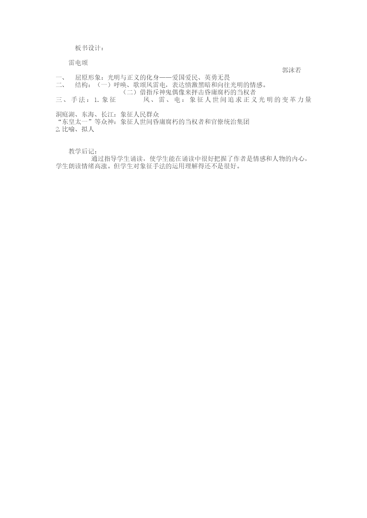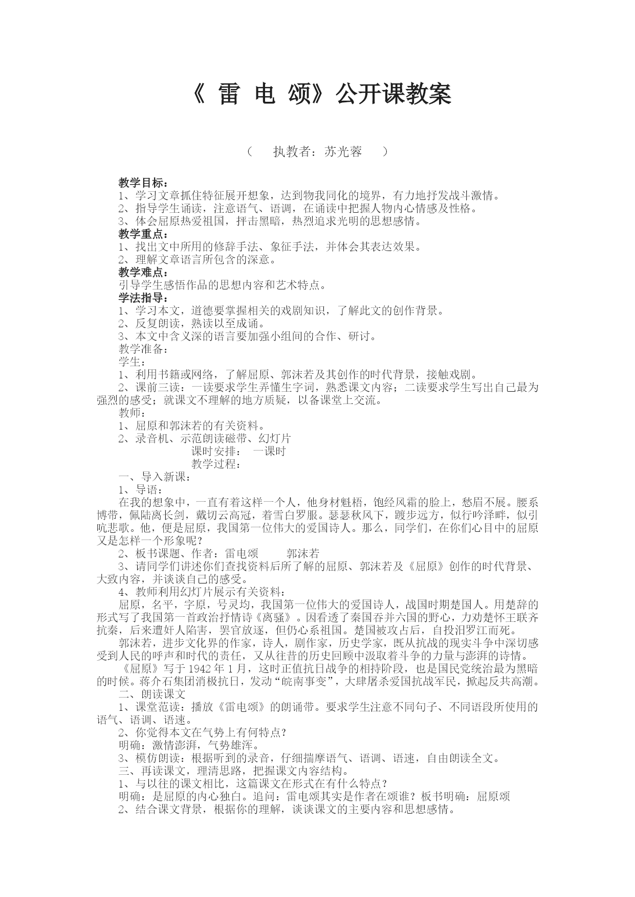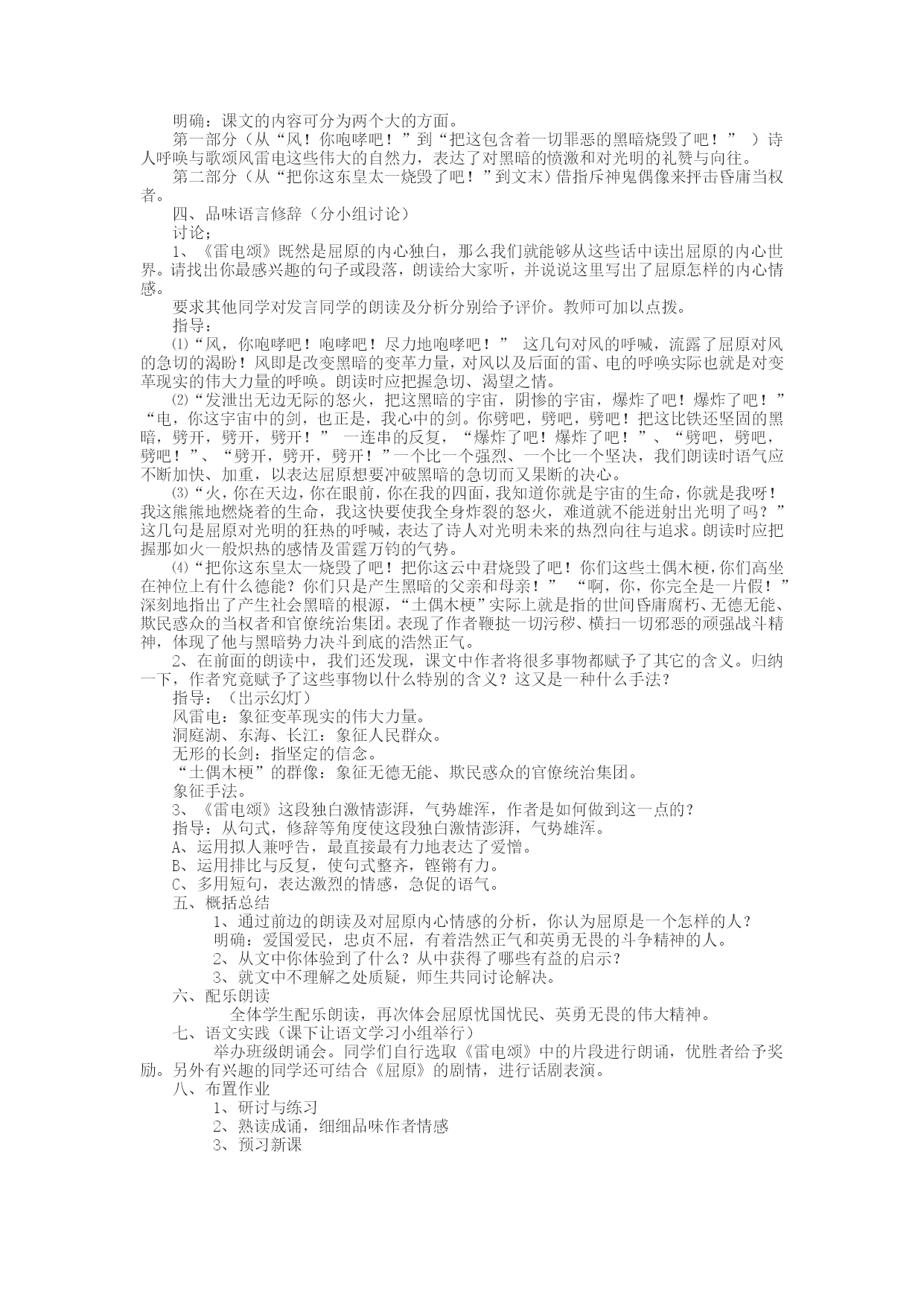 《雷电颂》公开课教案 (执教者:苏光蓉) 教学目标: 1、学习文章抓住特征展开想象,达到物我同化的境界,有力地抒发战斗激情。 2、指导学生诵读,注意语气、语调,在诵读中把握人物内心情感及性格。 3、体会屈原热爱祖国,抨击黑暗,热烈追求光明的思想感情。 教学重点: 1、找出文中所用的修辞手法、象征手法,并体会其表达效果。 2、理解文章语言所包含的深意。 教学难点: 引导学生感悟作品的思想内容和艺术特点。 学法指导: 1、学习本文,道德要掌握相关的戏剧知识,了解此文的创作背景。 2、反复朗读,熟读以至成诵。 3、本文中含义深的语言要加强小组间的合作、研讨。 教学准备: 学生: 1、利用书籍或网络,了解屈原、郭沫若及其创作的时代背景,接触戏剧。 2、课前三读:一读要求学生弄懂生字词,熟悉课文内容;二读要求学生写出自己最为强烈的感受;就课文不理解的地方质疑,以备课堂上交流。 教师: 1、屈原和郭沫若的有关资料。 2、录音机、示范朗读磁带、幻灯片 课时安排:一课时 教学过程: 一、导入新课: 1、导语: 在我的想象中,一直有着这样一个人,他身材魁梧,饱经风霜的脸上,愁眉不展。腰系博带,佩陆离长剑,戴切云高冠,着雪白罗服。瑟瑟秋风下,踱步远方,似行吟泽畔,似引吭悲歌。他,便是屈原,我国第一位伟大的爱国诗人。那么,同学们,在你们心目中的屈原又是怎样一个形象呢? 2、板书课题、作者:雷电颂郭沫若 3、请同学们讲述你们查找资料后所了解的屈原、郭沫若及《屈原》创作的时代背景、大致内容,并谈谈自己的感受。 4、教师利用幻灯片展示有关资料: 屈原,名平,字原,号灵均,我国第一位伟大的爱国诗人,战国时期楚国人。用楚辞的形式写了我国第一首政治抒情诗《离骚》。因看透了秦国吞并六国的野心,力劝楚怀王联齐抗秦,后来遭奸人陷害,罢官放逐,但仍心系祖国。楚国被攻占后,自投汨罗江而死。 郭沫若,进步文化界的作家,诗人,剧作家,历史学家,既从抗战的现实斗争中深切感受到人民的呼声和时代的责任,又从往昔的历史回顾中汲取着斗争的力量与澎湃的诗情。 《屈原》写于1942年1月,这时正值抗日战争的相持阶段,也是国民党统治最为黑暗的时候。蒋介石集团消极抗日,发动“皖南事变”,大肆屠杀爱国抗战军民,掀起反共高潮。 二、朗读课文 1、课堂范读:播放《雷电颂》的朗诵带。要求学生注意不同句子、不同语段所使用的语气、语调、语速。 2、你觉得本文在气势上有何特点? 明确:激情澎湃,气势雄浑。 3、模仿朗读:根据听到的录音,仔细揣摩语气、语调、语速,自由朗读全文。 三、再读课文,理清思路,把握课文内容结构。 1、与以往的课文相比,这篇课文在形式在有什么特点? 明确:是屈原的内心独白。追问:雷电颂其实是作者在颂谁?板书明确:屈原颂 2、结合课文背景,根据你的理解,谈谈课文的主要内容和思想感情。 明确:课文的内容可分为两个大的方面。 第一部分(从“风!你咆哮吧!”到“把这包含着一切罪恶的黑暗烧毁了吧!”)诗人呼唤与歌颂风雷电这些伟大的自然力,表达了对黑暗的愤激和对光明的礼赞与向往。 第二部分(从“把你这东皇太一烧毁了吧!”到文末)借指斥神鬼偶像来抨击昏庸当权者。 四、品味语言修辞(分小组讨论) 讨论; 1、《雷电颂》既然是屈原的内心独白,那么我们就能够从这些话中读出屈原的内心世界。请找出你最感兴趣的句子或段落,朗读给大家听,并说说这里写出了屈原怎样的内心情感。 要求其他同学对发言同学的朗读及分析分别给予评价。教师可加以点拨。 指导: ⑴“风,你咆哮吧!咆哮吧!尽力地咆哮吧!”这几句对风的呼喊,流露了屈原对风的急切的渴盼!风即是改变黑暗的变革力量,对风以及后面的雷、电的呼唤实际也就是对变革现实的伟大力量的呼唤。朗读时应把握急切、渴望之情。 ⑵“发泄出无边无际的怒火,把这黑暗的宇宙,阴惨的宇宙,爆炸了吧!爆炸了吧!”“电,你这宇宙中的剑,也正是,我心中的剑。你劈吧,劈吧,劈吧!把这比铁还坚固的黑暗,劈开,劈开,劈开!”一连串的反复,“爆炸了吧!爆炸了吧!”、“劈吧,劈吧,劈吧!”、“劈开,劈开,劈开!”一个比一个强烈、一个比一个坚决,我们朗读时语气应不断加快、加重,以表达屈原想要冲破黑暗的急切而又果断的决心。 ⑶“火,你在天边,你在眼前,你在我的四面,我知道你就是宇宙的生命,你就是我呀!我这熊熊地燃烧着的生命,我这快要使我全身炸裂的怒火,难道就不能迸射出光明了吗?”这几句是屈原对光明的狂热的呼喊,表达了诗人对光明未来的热烈向往与追求。朗读时应把握那如火一般炽热的感情及雷霆万钧的气势。 ⑷“把你这东皇太一烧毁了吧!把你这云中君烧毁了吧!你们这些土偶木梗,你们高坐在神位上有什么德能?你们只是产生黑暗的父亲和母亲!”“啊,你,你完全是一片假!”深刻地指出了产生社会黑暗的根源,“土偶木梗”实际上就是指的世