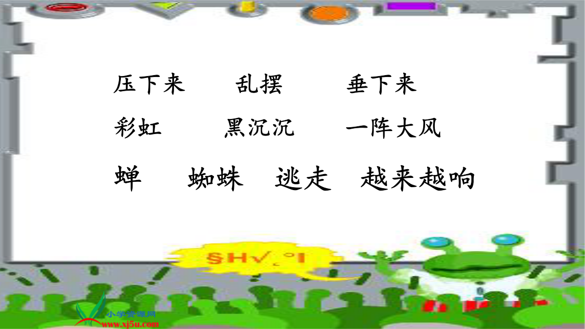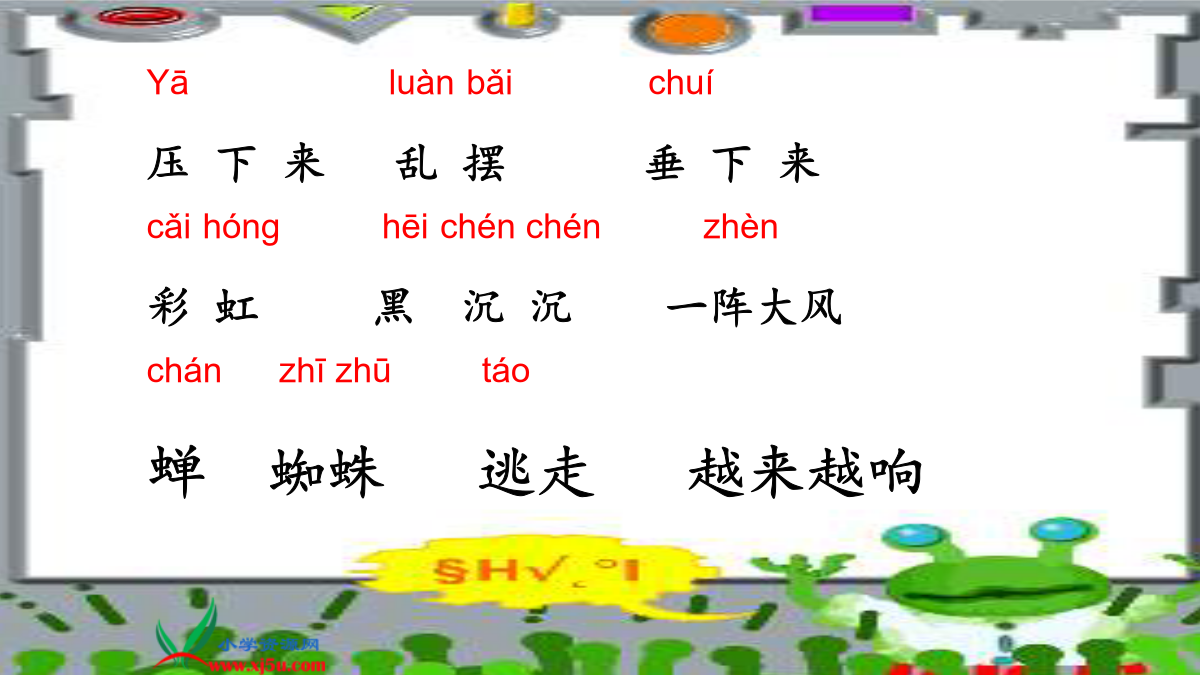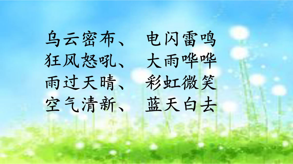 18雷雨压下来乱摆垂下来 彩虹黑沉沉一阵大风 蝉蜘蛛逃走越来越响 满天的乌云,黑沉沉地压下来。树上的叶子一动不动,蝉一声也不叫。 忽然一阵大风,吹得树枝乱摆。一只蜘蛛从网上垂下来,逃走了。 闪电越来越亮,雷声越来越响。 忽然一阵大风,吹得树枝乱摆。忽然一阵大风,。一只蜘蛛从网上垂下来,逃走了。短撇来当头,一横短又平,一竖站中间,二横最长在中线,左一竖右一竖,三横长四横短。。雷雨前