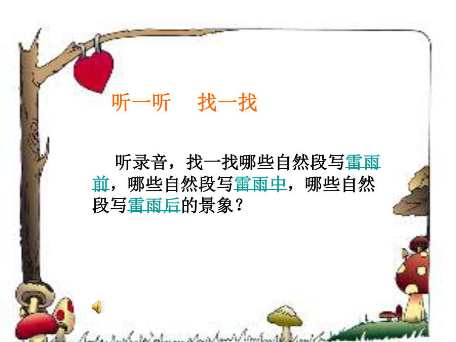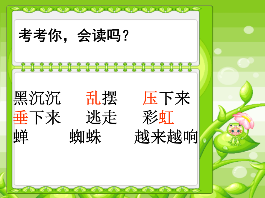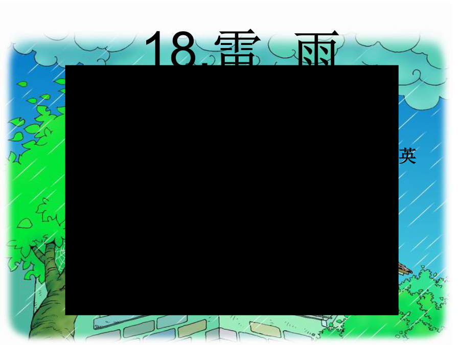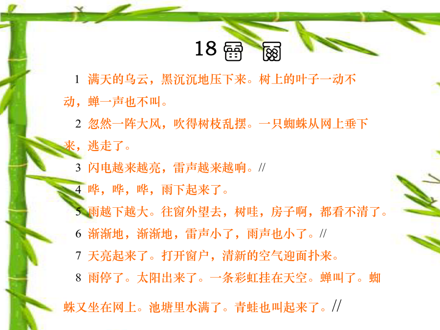 18.雷雨我会拼考考你,会读吗?听一听找一找 听录音,找一找哪些自然段写雷雨前,哪些自然段写雷雨中,哪些自然段写雷雨后的景象?满天的乌云,黑沉沉地压下来。忽然一阵大风,吹得树枝乱摆。一只蜘蛛从网上垂下来,逃走了。闪电越来越亮,雷声越来越响. 哗,哗,哗,雨下起来了。 雨越下越大。往窗外望去,树哇,房子啊,都 看不清了。 渐渐地,渐渐地,雷声小了,雨声也小了。雨停了。太阳出来了。一条彩虹挂在天空。蝉叫了。蜘蛛又坐在网上。池塘里水满了,青蛙也叫起来了。朗读考考你作业: 写一篇关于雷雨的观察日记。