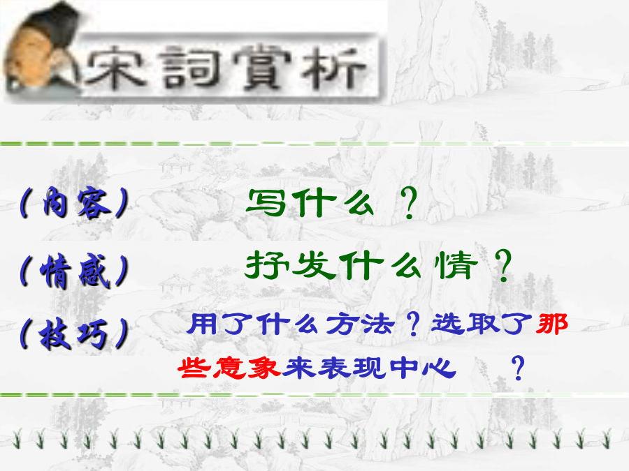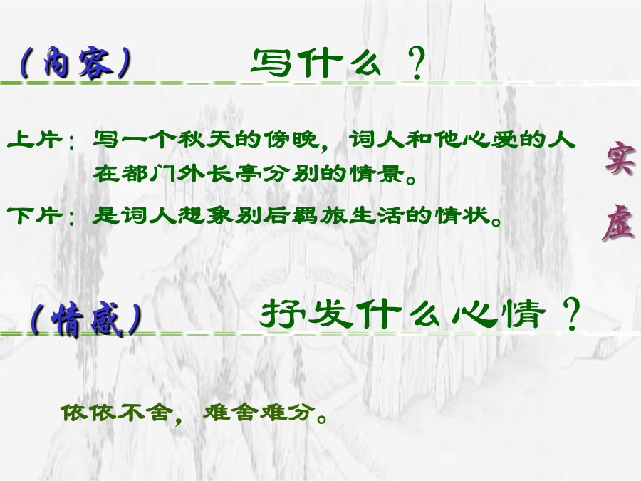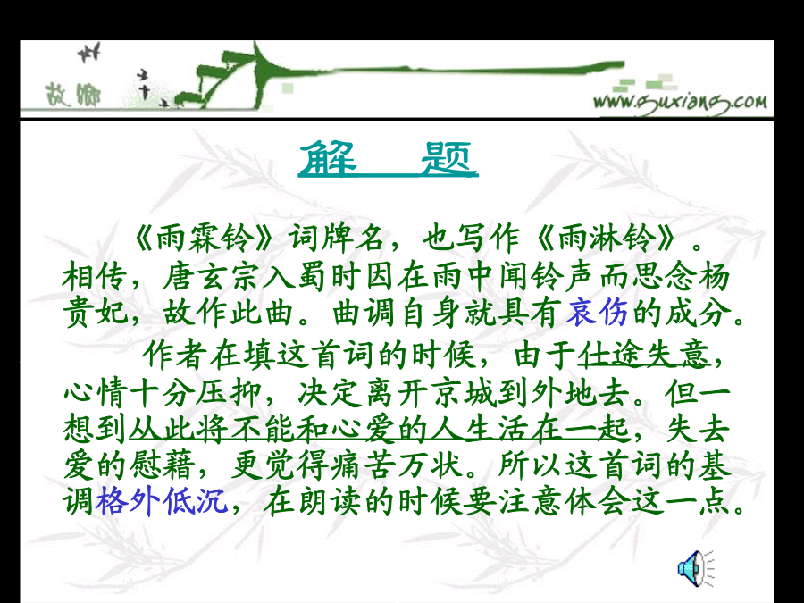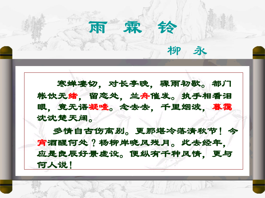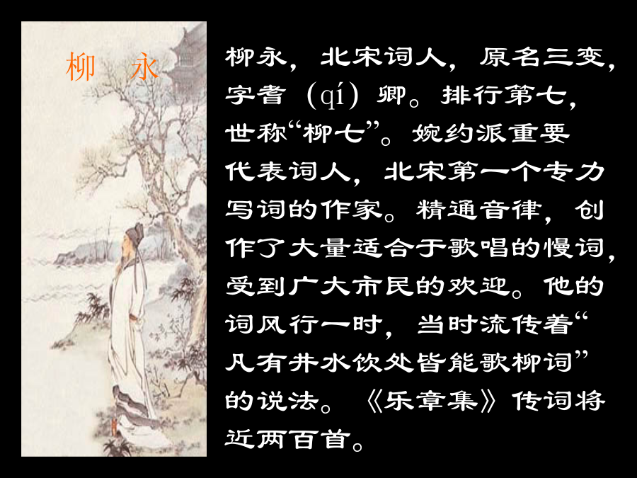 雨霖铃柳永柳永,北宋词人,原名三变, 字耆(qí)卿。排行第七,世称“柳七”。婉约派重要代表词人,北宋第一个专力写词的作家。精通音律,创作了大量适合于歌唱的慢词,受到广大市民的欢迎。他的词风行一时,当时流传着“凡有井水饮处皆能歌柳词”的说法。《乐章集》传词将近两百首。解题写什么?写什么?
