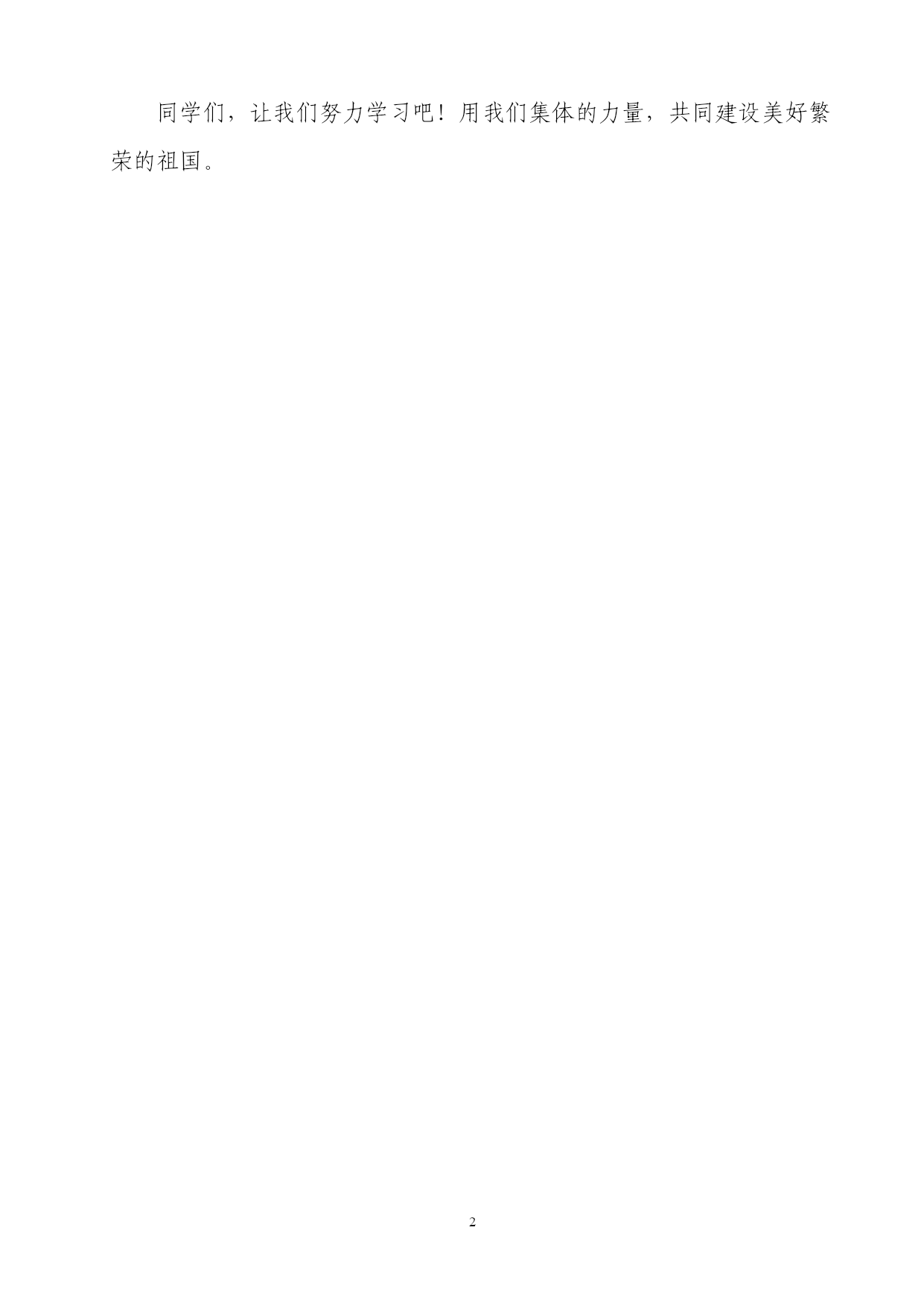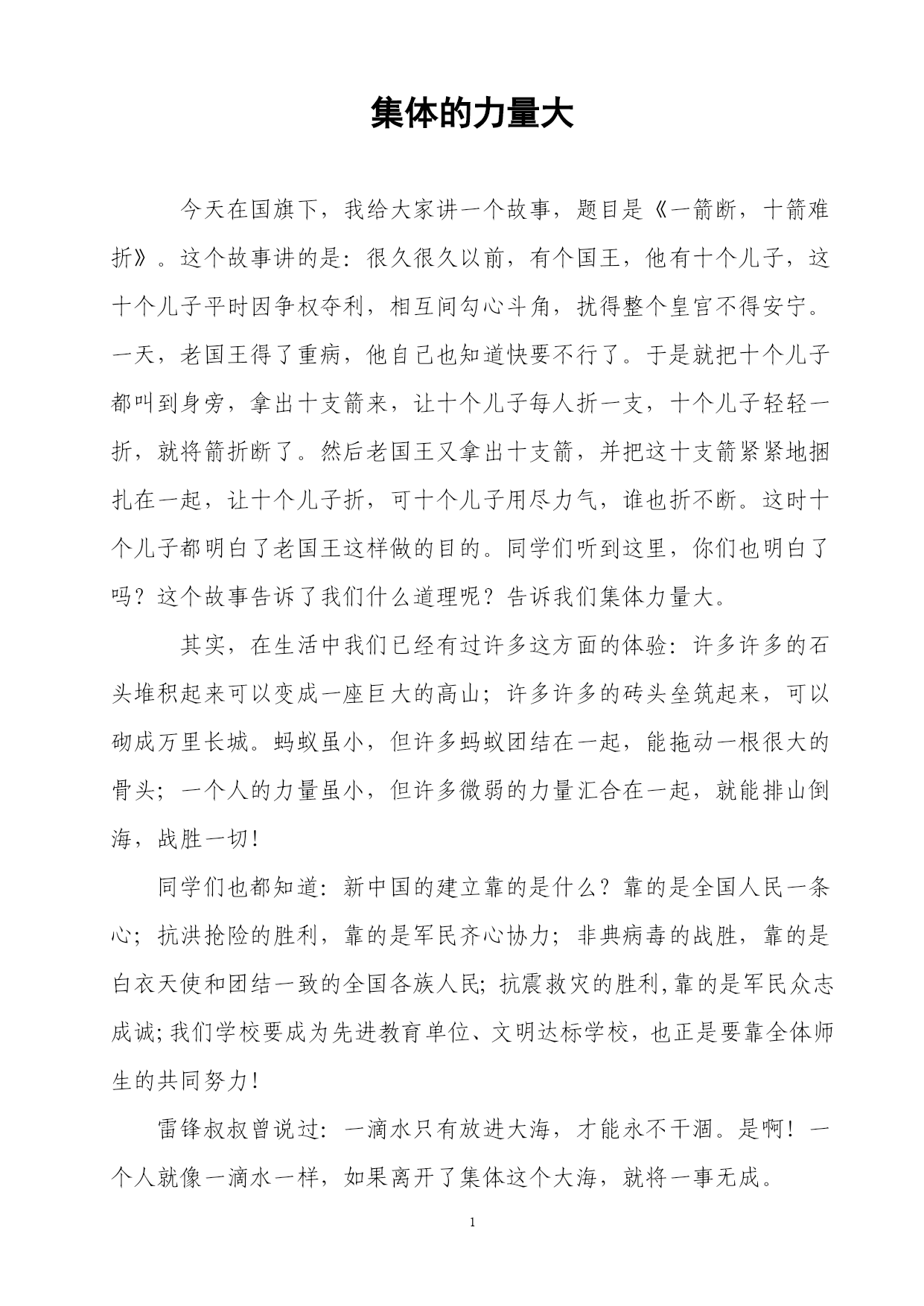 集体的力量大 今天在国旗下,我给大家讲一个故事,题目是《一箭断,十箭难折》。这个故事讲的是:很久很久以前,有个国王,他有十个儿子,这十个儿子平时因争权夺利,相互间勾心斗角,扰得整个皇宫不得安宁。一天,老国王得了重病,他自己也知道快要不行了。于是就把十个儿子都叫到身旁,拿出十支箭来,让十个儿子每人折一支,十个儿子轻轻一折,就将箭折断了。然后老国王又拿出十支箭,并把这十支箭紧紧地捆扎在一起,让十个儿子折,可十个儿子用尽力气,谁也折不断。这时十个儿子都明白了老国王这样做的目的。同学们听到这里,你们也明白了吗?这个故事告诉了我们什么道理呢?告诉我们集体力量大。 其实,在生活中我们已经有过许多这方面的体验:许多许多的石头堆积起来可以变成一座巨大的高山;许多许多的砖头垒筑起来,可以砌成万里长城。蚂蚁虽小,但许多蚂蚁团结在一起,能拖动一根很大的骨头;一个人的力量虽小,但许多微弱的力量汇合在一起,就能排山倒海,战胜一切! 同学们也都知道:新中国的建立靠的是什么?靠的是全国人民一条心;抗洪抢险的胜利,靠的是军民齐心协力;非典病毒的战胜,靠的是白衣天使和团结一致的全国各族人民;抗震救灾的胜利,靠的是军民众志成诚;我们学校要成为先进教育单位、文明达标学校,也正是要靠全体师生的共同努力! 雷锋叔叔曾说过:一滴水只有放进大海,才能永不干涸。是啊!一个人就像一滴水一样,如果离开了集体这个大海,就将一事无成。 同学们,让我们努力学习吧!用我们集体的力量,共同建设美好繁荣的祖国。