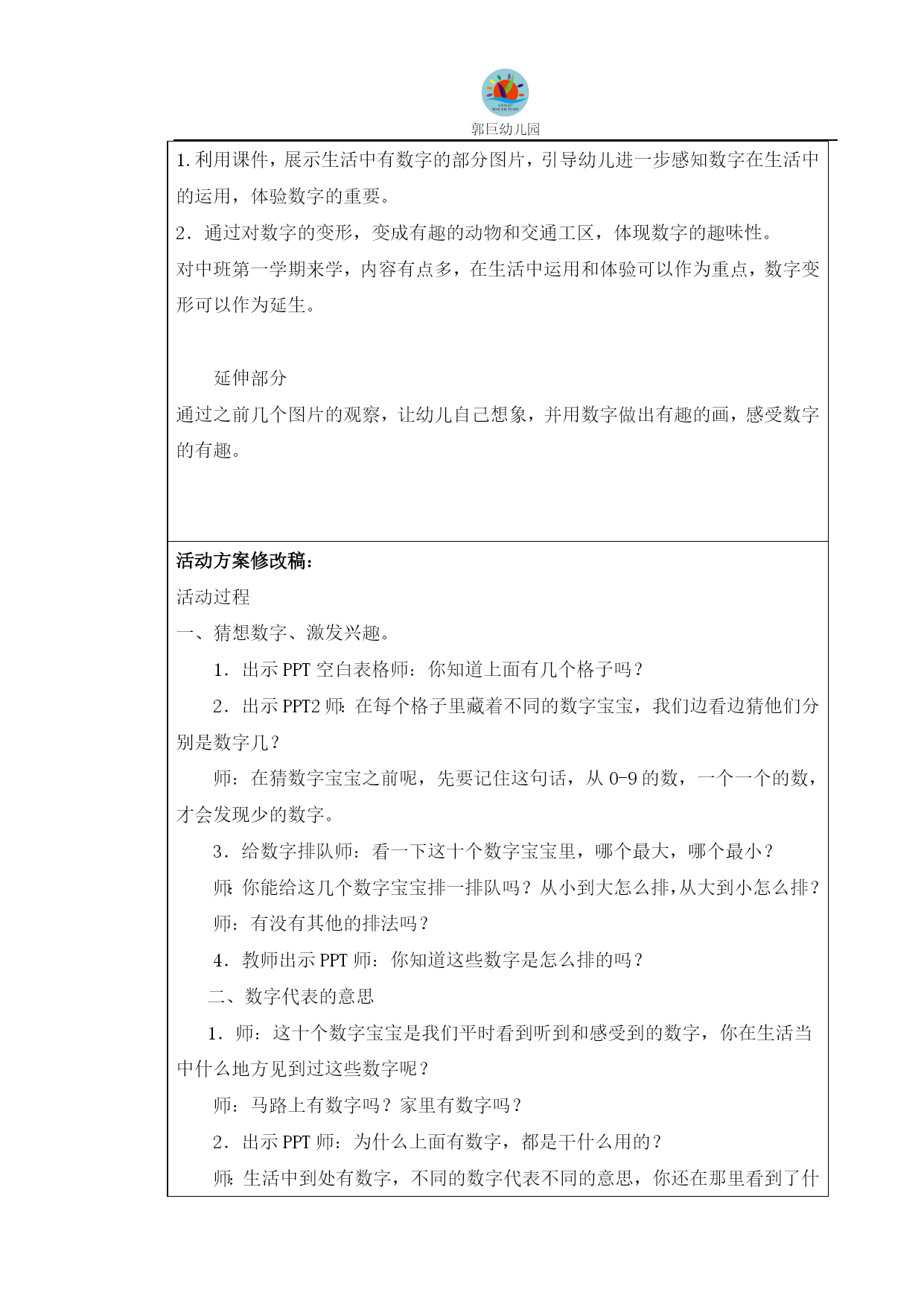 郭巨幼儿园 中班组集体备课《数字宝宝》策划案 一、活动背景 数字无处不在,它们的存在也给我们的生活带来了很多的方便,数字在不同的地方代表着不同的意思,中班幼儿开始喜欢研究数字,在生活中发现的数字也越来越多,但是孩子的经验还是比较零碎,对其了解也只是停留在最初阶段,根据幼儿年龄特点,我以猜数字的游戏导入激发幼儿学习兴趣,引导幼儿在猜猜、找找、说说、玩玩、画画中进一步巩固对数字的认识,了解数字在日常生活中的作用,体验数字的重要和有趣,从而激发幼儿探索数字奥秘的兴趣,培养幼儿积极关注身边事物的情感态度。 二、活动目标 1.以指南为依托,根据本班幼儿特点,对活动内容进行深入研究,并写好本次活动教案。 2.尝试通过教师之间的探讨与交流,取长补短,提高认识,更好的提高教学能力。 三、活动时间 2016年9月 四、活动地点 中一班 五、参加对象 中班全组教师 六、活动过程 1.对本次活动制定教学目标 在指南背景下,分析班级幼儿自身发展情况及年龄特征,讨论并制定目标。 2.对活动的环节进行设计 导入---重点---延伸 3.指南数学领域解读学习 2016年9月 郭巨幼儿园集体备课记录表 活动名称数学活动时间2016年9月中心发言人戴蓓娇地点中一班参加教师(年级组)戴蓓娇、周思超、蒋玲、乐静琦、钮程活动方案初稿: 活动过程 一、猜想数字、激发兴趣。 1.出示PPT空白表格师:你知道上面有几个格子吗? 2.出示PPT2师:在每个格子里藏着不同的数字宝宝,我们边看边猜他们分别是数字几? 师:在猜数字宝宝之前呢,先要记住这句话,从0-9的数,一个一个的数,才会发现少的数字。 3.给数字排队师:看一下这十个数字宝宝里,哪个最大,哪个最小? 师:你能给这几个数字宝宝排一排队吗?从小到大怎么排,从大到小怎么排? 师:有没有其他的排法吗? 4.教师出示PPT师:你知道这些数字是怎么排的吗? 二、数字代表的意思 1.师:这十个数字宝宝是我们平时看到听到和感受到的数字,你在生活当中什么地方见到过这些数字呢? 师:马路上有数字吗?家里有数字吗? 2.出示PPT师:为什么上面有数字,都是干什么用的? 师:生活中到处有数字,不同的数字代表不同的意思,你回去再去找找看,下次告诉我。 三、有趣的数字 1.出示PPT小鸡,师:看,这是什么?数字3怎么了?怎么变?除了数字3还有几? 2.出示图片冰淇淋,师:这又有那些数字宝宝呢,他们怎么了? 3.出示图片魔术师师:这次的图片,老师0-9每个数字宝宝用了一次,你能把它们都找出来吗?记住0-9一个一个的数,你就会发现不见的数字哦。 四、游戏数字、体验有趣 1.师:数字宝宝可以做成那么多好玩的东西,现在要请你们自己动动手,动动脑筋来画一画。 2.出示PPT师:你可以照着老师画画,你也可以自己想,要用到数字宝宝哦。 3.教师评价欣赏。 教师讨论记录: 对教案进行分析 数字无处不在,它们的存在也给我们的生活带来了很多的方便,数字在不同的地方代表着不同的意思。根据幼儿年龄特点,我以猜数字的游戏导入激发幼儿学习兴趣,引导幼儿在猜猜、找找、说说、玩玩、画画中进一步巩固对数字的认识,了解数字在日常生活中的作用,体验数字的重要和有趣,从而激发幼儿探索数字奥秘的兴趣,培养幼儿积极关注身边事物的情感态度。 目标设定分析 1.初步感受生活中的数字体验数字的意义,知道数字无处不在。 2.运用数字进行游戏活动,从中体验活动的乐趣。 3.激发幼儿对数字的兴趣,培养幼儿积极关注身边事物的情感态度。 活动重点:发现生活中的熟悉,知道数字代表的意思,感知数字无处不在。 活动难点:运用数字进行游戏活动,体验游戏的快乐和数字的有趣。 活动准备:多媒体课件、幼儿人手一支笔、一份记录纸 导入环节 设计意图用“猜数字游戏”导入激发幼儿学习兴趣。 同时也复习了量与数的关系。 基本部分 1.利用课件,展示生活中有数字的部分图片,引导幼儿进一步感知数字在生活中的运用,体验数字的重要。 2.通过对数字的变形,变成有趣的动物和交通工区,体现数字的趣味性。 对中班第一学期来学,内容有点多,在生活中运用和体验可以作为重点,数字变形可以作为延生。 延伸部分 通过之前几个图片的观察,让幼儿自己想象,并用数字做出有趣的画,感受数字的有趣。 活动方案修改稿: 活动过程 一、猜想数字、激发兴趣。 1.出示PPT空白表格师:你知道上面有几个格子吗? 2.出示PPT2师:在每个格子里藏着不同的数字宝宝,我们边看边猜他们分别是数字几? 师:在猜数字宝宝之前呢,先要记住这句话,从0-9的数,一个一个的数,才会发现少的数字。 3.给数字排队师:看一下这十个数字宝宝里,哪个最大,哪个最小? 师:你能给这几个数字宝宝排一排队吗?从小到大怎么排,从大到小怎么排? 师:有没有其他的排法吗? 4.教师