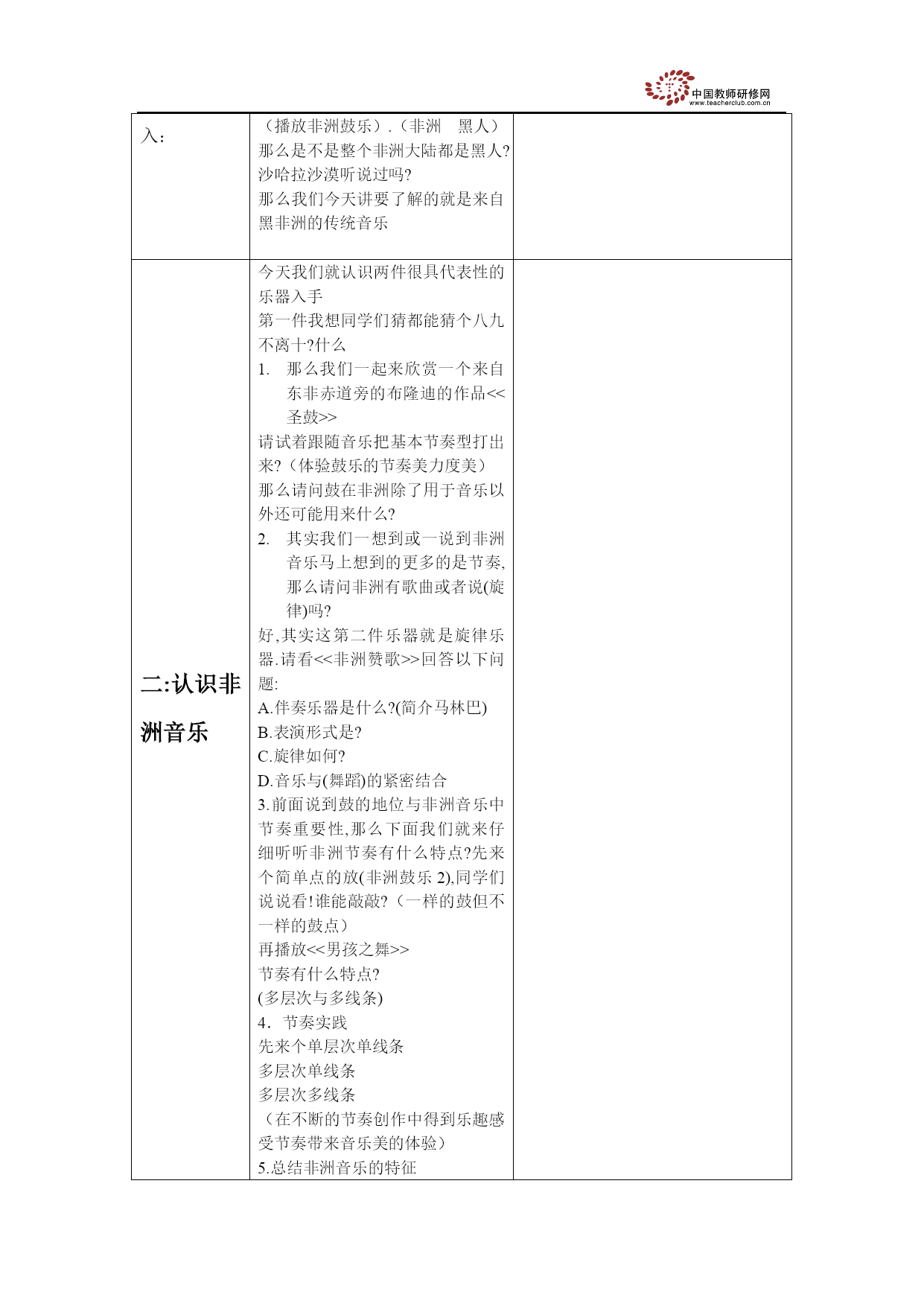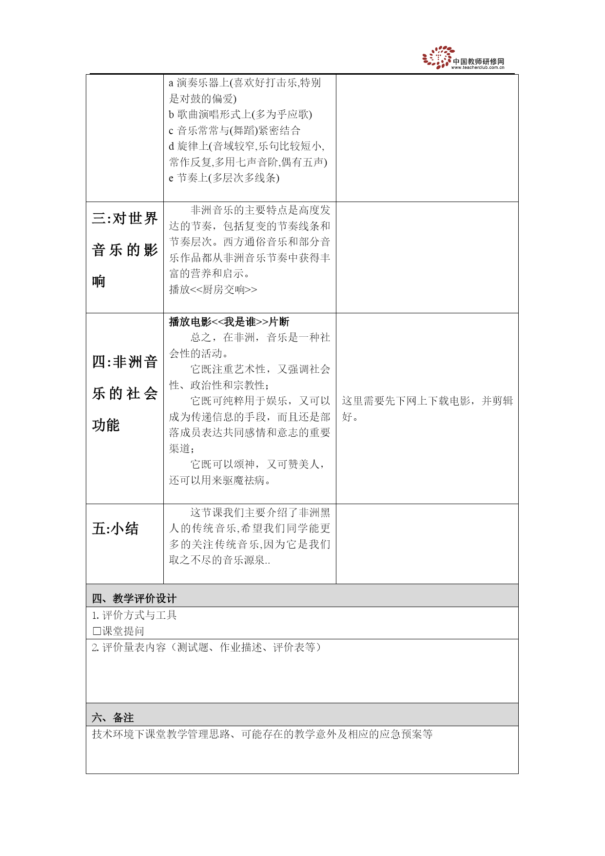 教学设计模板 课题摘要学科音乐学段高中年级高一单元五教材版本人音课程名称非洲音乐一、学习内容分析1.教材分析 《非洲歌舞音乐》选自人教版普通高中课程标准实验教科书《音乐鉴赏》第五单元。这一课所指的非洲音乐是按音乐文化范畴划分的,不是地理概念上的划分,主要是指撒哈拉沙漠以南黑人居住地区的音乐,所以没有把北非阿拉伯地区(如埃及)和南非部分白人的音乐包含在内,因此在教学中可称其为“黑非洲音乐”或“非洲黑人音乐”。本课通过欣赏非洲民间的鼓乐和歌舞音乐,使学生体验非洲民间音乐的风格特征,了解世界音乐,拓宽音乐视野。 2.学情分析 学生经过小学与初中的音乐学习已经具备了基础的音乐理解力与感受力。他们正直青春期,这个年龄段是人生观、价值观形成的重要阶段,社会道德、伦理等观念逐渐形成。这个年龄段的学生情感需求强烈而不稳定,音乐鉴赏课恰恰是一种独特的审美性、情感性的教育,富有感染力的音响会丰富学生内心对美的理解,而音乐作品深层次的内涵与思想性也会随着音乐体验潜移默化影响学生的生活态度。3.教学目标(含重难点) 引导学生感受体验非洲民间音乐的风格特征,并喜欢非洲音乐及在节奏练习中找到乐趣. 了解、掌握非洲民间音乐的风格特征 了解非洲代表性乐器鼓马林巴.二、教学环境选择□简易多媒体教室三、教学过程设计教学环节活动设计信息技术使用说明一、导入: 我们说要培养音乐的耳朵,那么请同学们闭上眼晴,用你的耳朵感受一下,仿佛到了哪里都见到什么?(播放非洲鼓乐).(非洲黑人) 那么是不是整个非洲大陆都是黑人? 沙哈拉沙漠听说过吗? 那么我们今天讲要了解的就是来自黑非洲的传统音乐 需要用到音乐专业播放器FOOBAR 需要先在网上下无损音乐,让同学更有身临其景之感二:认识非洲音乐 今天我们就认识两件很具代表性的乐器入手 第一件我想同学们猜都能猜个八九不离十?什么 那么我们一起来欣赏一个来自东非赤道旁的布隆迪的作品<<圣鼓>> 请试着跟随音乐把基本节奏型打出来?(体验鼓乐的节奏美力度美) 那么请问鼓在非洲除了用于音乐以外还可能用来什么? 其实我们一想到或一说到非洲音乐马上想到的更多的是节奏,那么请问非洲有歌曲或者说(旋律)吗? 好,其实这第二件乐器就是旋律乐器.请看<<非洲赞歌>>回答以下问题: A.伴奏乐器是什么?(简介马林巴) B.表演形式是? C.旋律如何? D.音乐与(舞蹈)的紧密结合 3.前面说到鼓的地位与非洲音乐中节奏重要性,那么下面我们就来仔细听听非洲节奏有什么特点?先来个简单点的放(非洲鼓乐2),同学们说说看!谁能敲敲?(一样的鼓但不一样的鼓点) 再播放<<男孩之舞>> 节奏有什么特点? (多层次与多线条) 4.节奏实践 先来个单层次单线条 多层次单线条 多层次多线条 (在不断的节奏创作中得到乐趣感受节奏带来音乐美的体验) 5.总结非洲音乐的特征 a演奏乐器上(喜欢好打击乐,特别是对鼓的偏爱) b歌曲演唱形式上(多为乎应歌) c音乐常常与(舞蹈)紧密结合 d旋律上(音域较窄,乐句比较短小,常作反复,多用七声音阶,偶有五声) e节奏上(多层次多线条) 三:对世界音乐的影响 非洲音乐的主要特点是高度发达的节奏,包括复变的节奏线条和节奏层次。西方通俗音乐和部分音乐作品都从非洲音乐节奏中获得丰富的营养和启示。 播放<<厨房交响>> 四:非洲音乐的社会功能 播放电影<<我是谁>>片断 总之,在非洲,音乐是一种社会性的活动。 它既注重艺术性,又强调社会性、政治性和宗教性; 它既可纯粹用于娱乐,又可以成为传递信息的手段,而且还是部落成员表达共同感情和意志的重要渠道; 它既可以颂神,又可赞美人,还可以用来驱魔祛病。 这里需要先下网上下载电影,并剪辑好。五:小结 这节课我们主要介绍了非洲黑人的传统音乐,希望我们同学能更多的关注传统音乐,因为它是我们取之不尽的音乐源泉.. 四、教学评价设计1.评价方式与工具 □课堂提问2.评价量表内容(测试题、作业描述、评价表等) 六、备注技术环境下课堂教学管理思路、可能存在的教学意外及相应的应急预案等 备注:本模板仅供参考,参训教师可根据实际情况,自行修改创新。