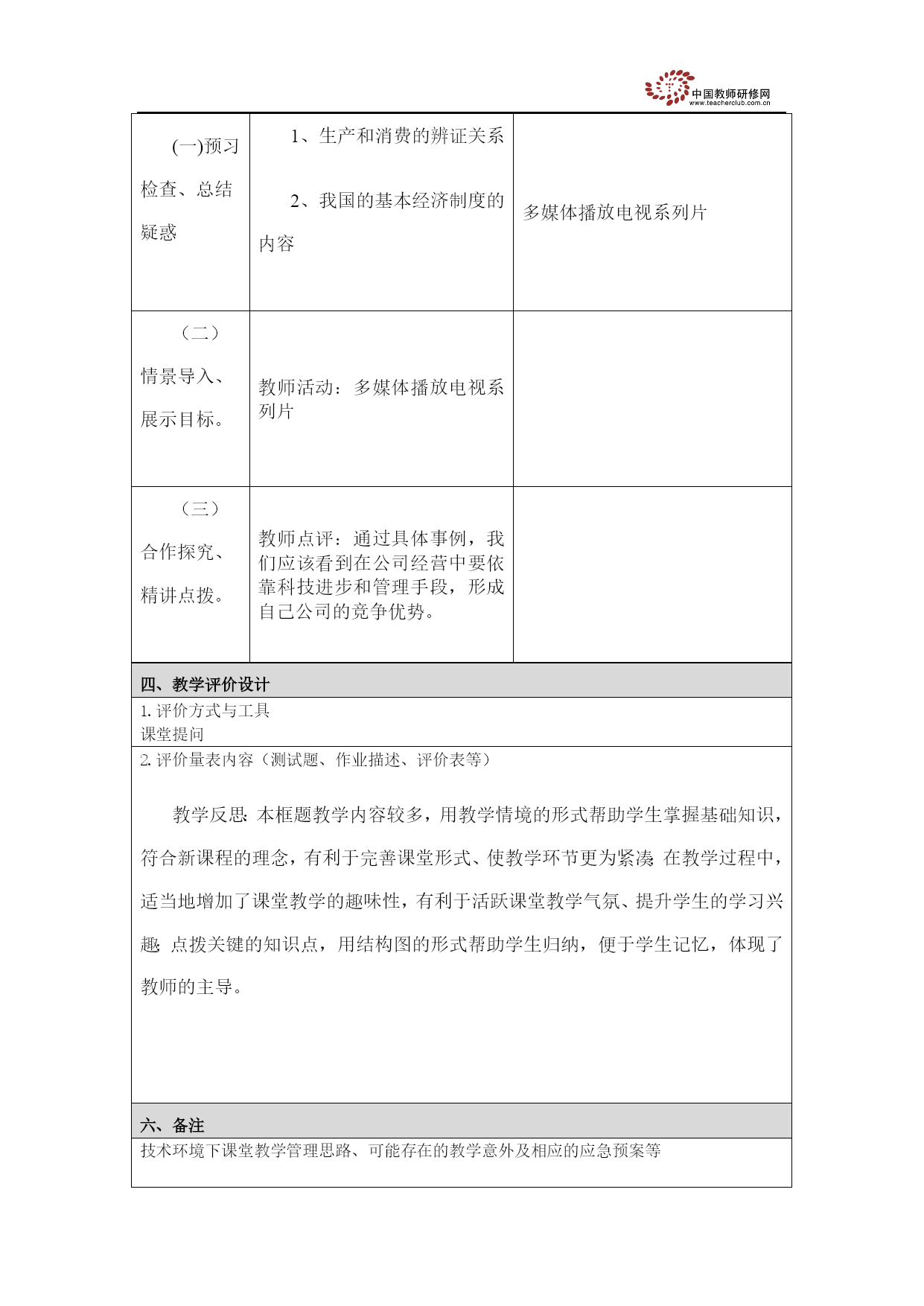 必修1经济生活《企业的经营》教案 课题摘要学科高中政治学段高中年级高一单元第二单元教材版本人教课程名称企业的经营一、学习内容分析1.教材分析企业的经营;【课标内容】;识别公司的不同类型,描述公司的经营表现与发展状态;【教学目标】;(一)知识目标;1、知道企业的含义、作用和所有制类型;;2、了解公司的含义、社会责任、法律特征和组织机构;3、比较有限责任公司和股份有限公司;;4、把握公司经营成功的主要因素;;5、了解市场竞争中企业的兼并、破产现象及其意义; 2.学情分析 教学目标(含重难点) 1、公司制企业 2、公司的经营 3、正确认识企业的兼并和破产 二、教学环境选择简易多媒体教室三、教学过程设计教学环节活动设计信息技术使用说明(一)预习检查、总结疑惑 1、生产和消费的辨证关系 2、我国的基本经济制度的内容 多媒体播放电视系列片(二)情景导入、展示目标。 教师活动:多媒体播放电视系列片(三)合作探究、精讲点拨。 教师点评:通过具体事例,我们应该看到在公司经营中要依靠科技进步和管理手段,形成自己公司的竞争优势。四、教学评价设计1.评价方式与工具 课堂提问2.评价量表内容(测试题、作业描述、评价表等) 教学反思:本框题教学内容较多,用教学情境的形式帮助学生掌握基础知识,符合新课程的理念,有利于完善课堂形式、使教学环节更为紧凑;在教学过程中,适当地增加了课堂教学的趣味性,有利于活跃课堂教学气氛、提升学生的学习兴趣;点拨关键的知识点,用结构图的形式帮助学生归纳,便于学生记忆,体现了教师的主导。 六、备注技术环境下课堂教学管理思路、可能存在的教学意外及相应的应急预案等