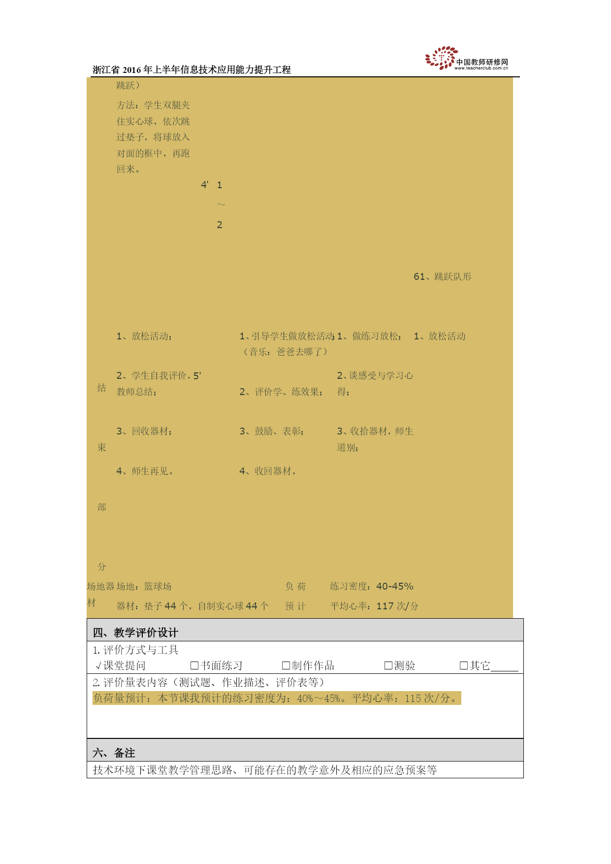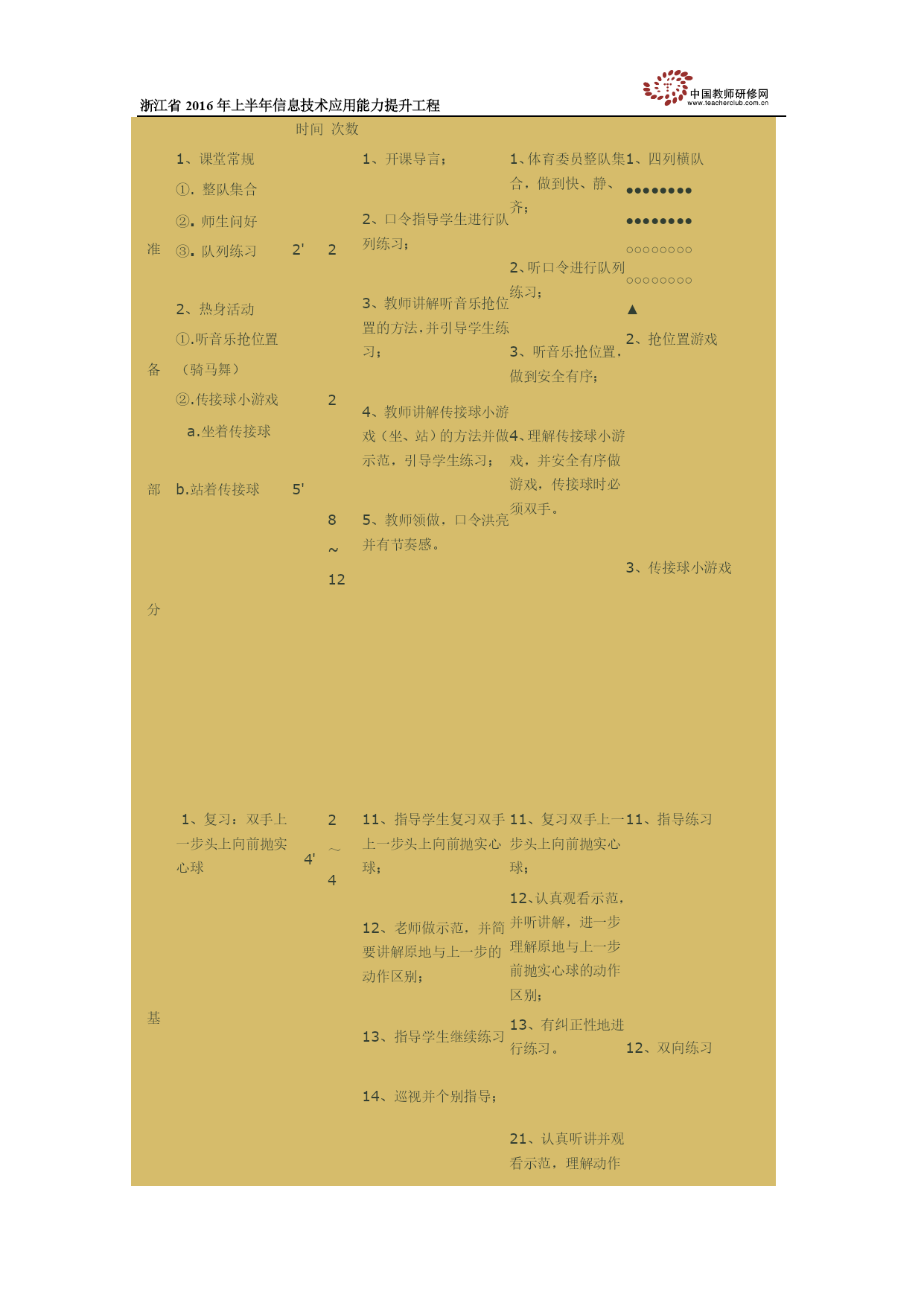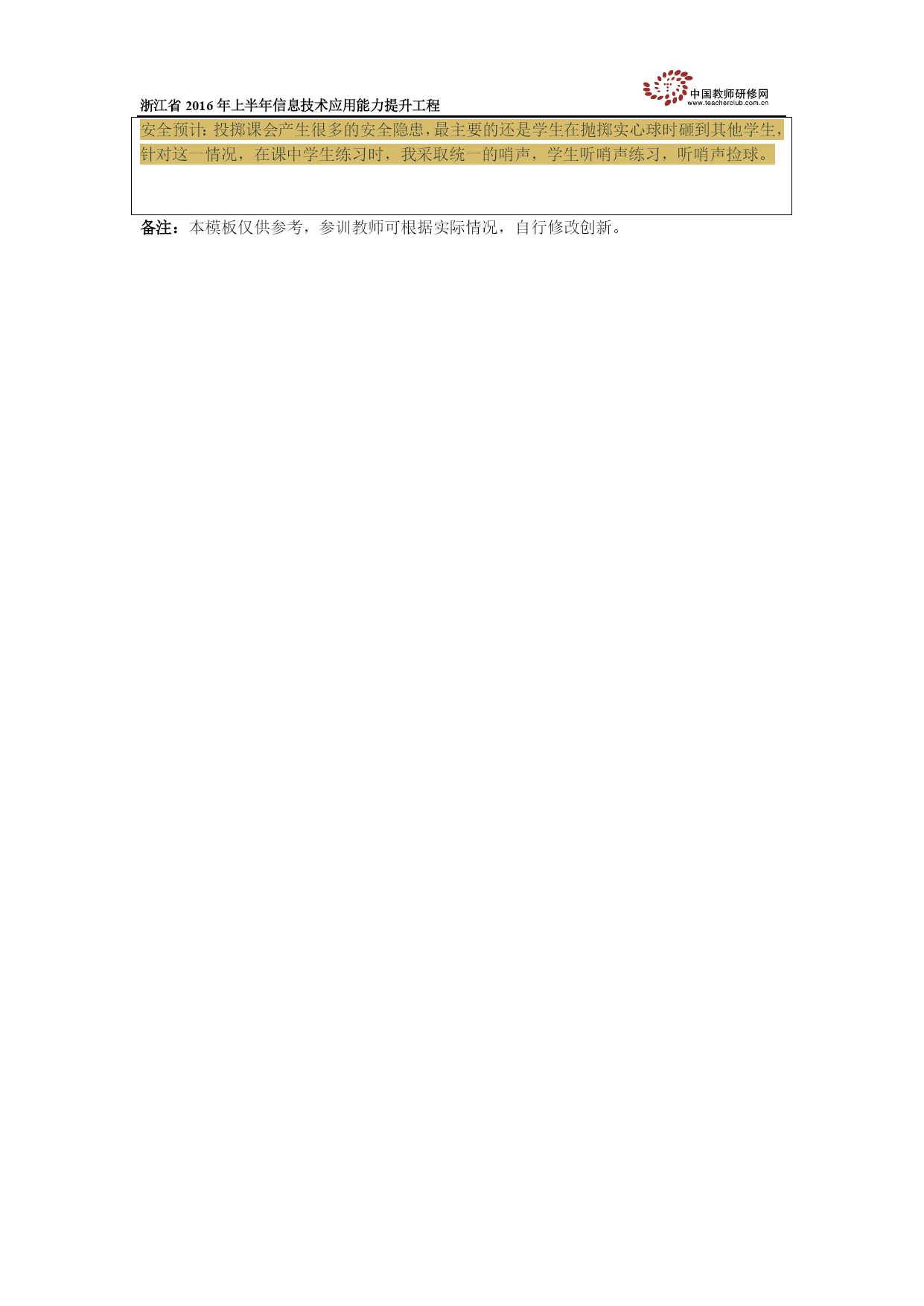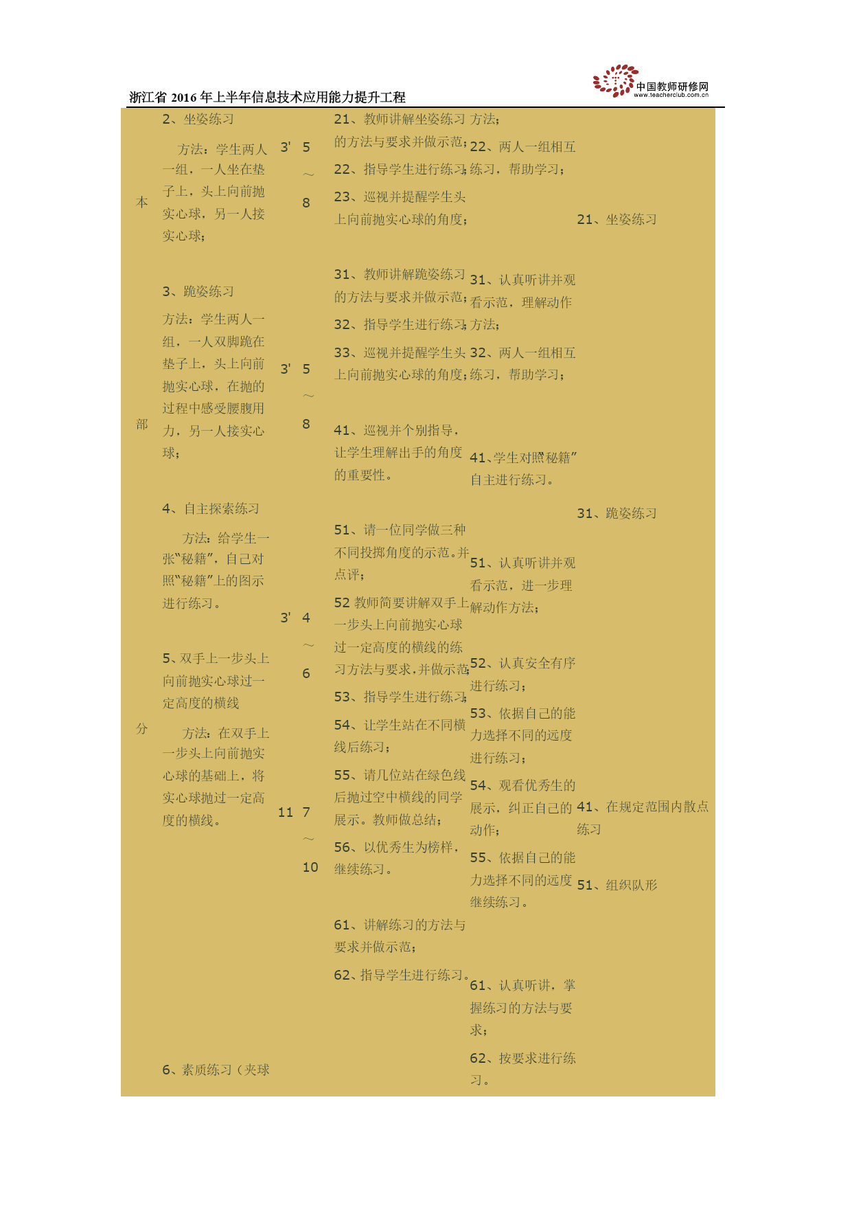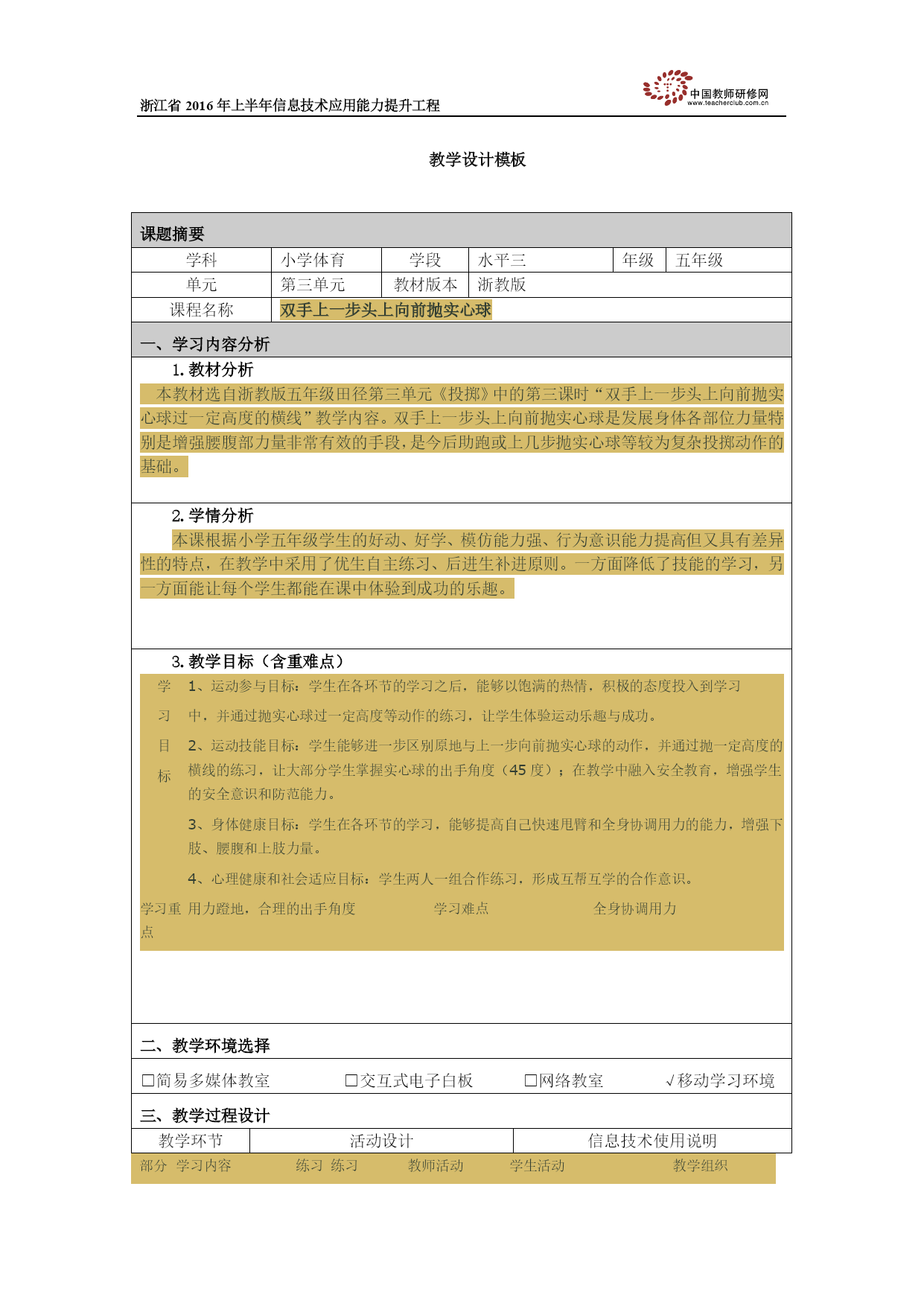 浙江省2016年上半年信息技术应用能力提升工程 教学设计模板 课题摘要学科小学体育学段水平三年级五年级单元第三单元教材版本浙教版课程名称双手上一步头上向前抛实心球一、学习内容分析1.教材分析 本教材选自浙教版五年级田径第三单元《投掷》中的第三课时“双手上一步头上向前抛实心球过一定高度的横线”教学内容。双手上一步头上向前抛实心球是发展身体各部位力量特别是增强腰腹部力量非常有效的手段,是今后助跑或上几步抛实心球等较为复杂投掷动作的基础。 2.学情分析 本课根据小学五年级学生的好动、好学、模仿能力强、行为意识能力提高但又具有差异性的特点,在教学中采用了优生自主练习、后进生补进原则。一方面降低了技能的学习,另一方面能让每个学生都能在课中体验到成功的乐趣。 3.教学目标(含重难点) 学 习 目 标1、运动参与目标:学生在各环节的学习之后,能够以饱满的热情,积极的态度投入到学习 中,并通过抛实心球过一定高度等动作的练习,让学生体验运动乐趣与成功。 2、运动技能目标:学生能够进一步区别原地与上一步向前抛实心球的动作,并通过抛一定高度的横线的练习,让大部分学生掌握实心球的出手角度(45度);在教学中融入安全教育,增强学生的安全意识和防范能力。 3、身体健康目标:学生在各环节的学习,能够提高自己快速甩臂和全身协调用力的能力,增强下肢、腰腹和上肢力量。 4、心理健康和社会适应目标:学生两人一组合作练习,形成互帮互学的合作意识。学习重点用力蹬地,合理的出手角度学习难点全身协调用力 二、教学环境选择□简易多媒体教室□交互式电子白板□网络教室√移动学习环境三、教学过程设计教学环节活动设计信息技术使用说明部分学习内容练习 时间练习 次数教师活动学生活动教学组织 准 备 部 分1、课堂常规 ①.整队集合 ②.师生问好 ③.队列练习 2、热身活动 ①.听音乐抢位置 (骑马舞) ②.传接球小游戏 a.坐着传接球 b.站着传接球 2' 5' 2 2 8 ~ 12 1、开课导言; 2、口令指导学生进行队列练习; 3、教师讲解听音乐抢位置的方法,并引导学生练习; 4、教师讲解传接球小游戏(坐、站)的方法并做示范,引导学生练习; 5、教师领做,口令洪亮并有节奏感。 1、体育委员整队集合,做到快、静、齐; 2、听口令进行队列练习; 3、听音乐抢位置,做到安全有序; 4、理解传接球小游戏,并安全有序做游戏,传接球时必须双手。 1、四列横队 ●●●●●●●● ●●●●●●●● ○○○○○○○○ ○○○○○○○○ ▲ 2、抢位置游戏 3、传接球小游戏 基 本 部 分 1、复习:双手上一步头上向前抛实心球 2、坐姿练习 方法:学生两人一组,一人坐在垫子上,头上向前抛实心球,另一人接实心球; 3、跪姿练习 方法:学生两人一组,一人双脚跪在垫子上,头上向前抛实心球,在抛的过程中感受腰腹用力,另一人接实心球; 4、自主探索练习 方法:给学生一张“秘籍”,自己对照“秘籍”上的图示进行练习。 5、双手上一步头上向前抛实心球过一定高度的横线 方法:在双手上一步头上向前抛实心球的基础上,将实心球抛过一定高度的横线。 6、素质练习(夹球跳跃) 方法:学生双腿夹住实心球,依次跳过垫子,将球放入对面的框中,再跑回来。 4' 3' 3' 3' 11 4' 2 ~ 4 5 ~ 8 5 ~ 8 4 ~ 6 7 ~ 10 1 ~ 2 11、指导学生复习双手上一步头上向前抛实心球; 12、老师做示范,并简要讲解原地与上一步的动作区别; 13、指导学生继续练习 14、巡视并个别指导; 21、教师讲解坐姿练习的方法与要求并做示范; 22、指导学生进行练习; 23、巡视并提醒学生头上向前抛实心球的角度; 31、教师讲解跪姿练习的方法与要求并做示范; 32、指导学生进行练习; 33、巡视并提醒学生头上向前抛实心球的角度; 41、巡视并个别指导,让学生理解出手的角度的重要性。 51、请一位同学做三种不同投掷角度的示范。并点评; 52教师简要讲解双手上一步头上向前抛实心球过一定高度的横线的练习方法与要求,并做示范; 53、指导学生进行练习; 54、让学生站在不同横线后练习; 55、请几位站在绿色线后抛过空中横线的同学展示。教师做总结; 56、以优秀生为榜样,继续练习。 6