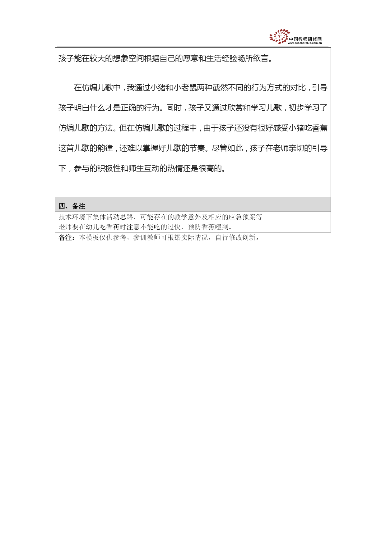 幼儿园教学案例模板 幼儿园名称福娃幼儿园班级中班活动名称《吃香蕉》执教时间2017.3.22一、活动准备1.小猪、小老鼠吃香蕉的图片各一张;实物香蕉一个;纸篓一个。 2.活动目标; 1.在有趣的活动中,学会‘“乖、扔、鼠”的正确发音。 2、培养良好的公共卫生习惯。二、活动过程活动环节活动设计信息技术使用说明吃水果老师说;请你跟我吃xx,刚才我们把香蕉吃完了,香蕉皮扔在哪里呢?出示香蕉,小猪和小老鼠刚才也吃了香蕉,我们来看看它们是怎么样吃香蕉的 学习儿歌。出示图一)图片上有谁?它在干什么?、小猪把香蕉皮扔到哪里去了?你是怎么看出来的?(认识垃圾筒标记)我们把小猪吃香蕉的样子编成了一首儿歌。幼儿学念儿歌,老师注意帮助幼儿正音(乖、扔)。(出示图二)小老鼠和乖小猪吃香蕉的方法一样吗?它做得对吗?为什么?(幼儿泛讲) 教师:对,把香蕉皮扔在地上很不安全,也不卫生三、活动反思在教学活动中,我围绕教学目标,充分利用孩子的各种感官,通过多种活动形式,让孩子在有趣的活动中初步学习仿编儿歌,同时,也培养了孩子良好的公共卫生习惯。在活动中,我注重运用开放式的提问来强化孩子的感知,如“你最喜欢吃什么水果?”“你是怎么看出来的?”“还有什么东西也可以扔进箱”等等,孩子能在较大的想象空间根据自己的愿意和生活经验畅所欲言。 在仿编儿歌中,我通过小猪和小老鼠两种截然不同的行为方式的对比,引导孩子明白什么才是正确的行为。同时,孩子又通过欣赏和学习儿歌,初步学习了仿编儿歌的方法。但在仿编儿歌的过程中,由于孩子还没有很好感受小猪吃香蕉这首儿歌的韵律,还难以掌握好儿歌的节奏。尽管如此,孩子在老师亲切的引导下,参与的积极性和师生互动的热情还是很高的。 四、备注技术环境下集体活动思路、可能存在的教学意外及相应的应急预案等 老师要在幼儿吃香蕉时注意不能吃的过快,预防香蕉噎到。备注:本模板仅供参考,参训教师可根据实际情况,自行修改创新。
