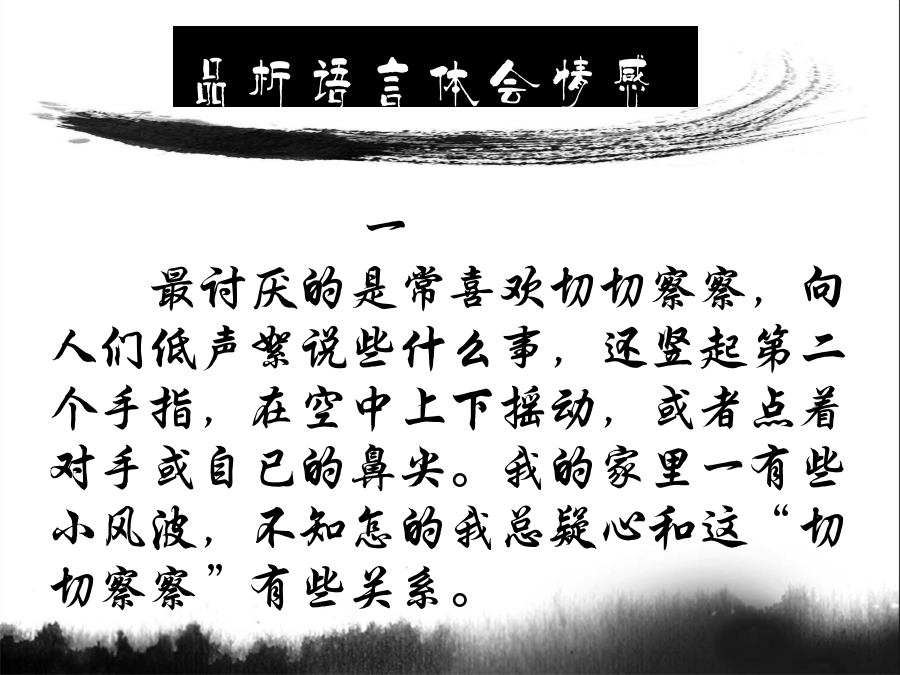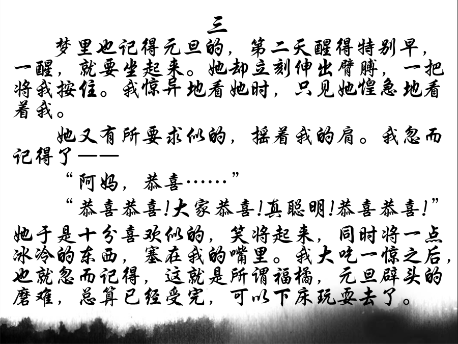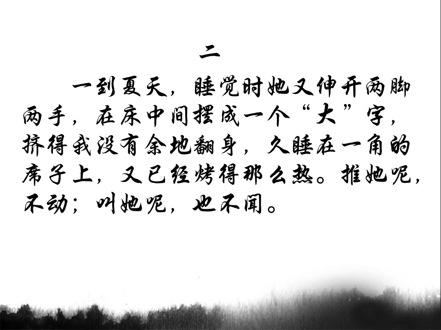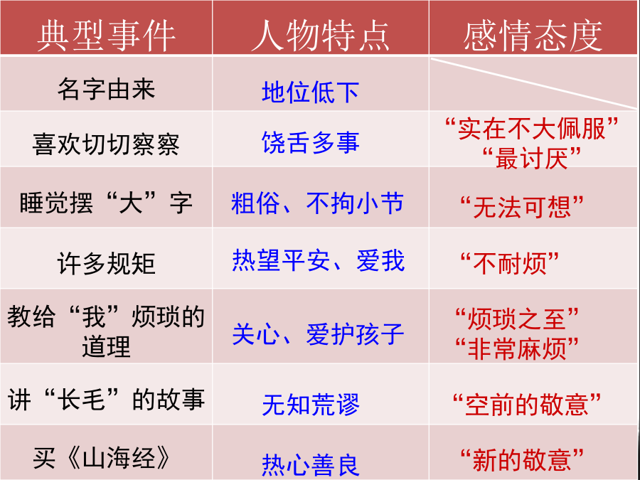 典型事件一最讨厌的是常喜欢切切察察,向人们低声絮说些什么事,还竖起第二个手指,在空中上下摇动,或者点着对手或自己的鼻尖。我的家里一有些小风波,不知怎的我总疑心和这“切切察察”有些关系。一到夏天,睡觉时她又伸开两脚两手,在床中间成一个“”字,挤得我没有余地翻身,久睡在一角的席子上,又已经烤得那么热。推她呢,不动;叫她呢,也不闻。梦里也记得元旦的,第二天醒得特别早,一醒,就要坐起来。她却立刻伸出臂膊,一把将我按住。我地看她时,只见她地看着我。 她又有所要求似的,摇着我的肩。我忽而记得了—— “阿妈,恭喜……” “恭喜恭喜!大家恭喜!真聪明!恭喜恭喜!” 她于是十分喜欢似的,笑将起来,同时将一点冰冷的东西,塞在我的嘴里。我大吃一惊之后,也就忽而记得,这就是所谓福橘,元旦辟头的磨难,总算已经受完,可以下床玩耍去了。我一向以为她满肚子是麻烦的礼节罢了,却不料她还有这样伟大的神力。从此对于她就有了特别的,似乎实在深不可测;夜间的伸开手脚,占领全床,那当然是情有可原的了,倒应该我退让。这又使我发生新的了,别人不肯做,或不能做的事,她却能够做成功。她确有伟大的神力。谋害隐鼠的怨恨,从此完全消灭了。我的保姆,长妈妈即阿长,辞了这人世,大概也有了三十年了罢。我终于不知道她的姓名,她的经历;仅知道有一个过继的儿子,她大约是青年守寡的孤孀。 仁厚黑暗的地母呵,愿在你怀里永安她的魂灵!典型事件我对阿长的感情变化过程 “朝花”为什么要“夕拾”? 带露折花,色香自然要好得多,但是我不能够。 ——《朝花夕拾》小引寻找身边的“长妈妈” 读懂身边的爱