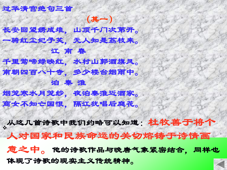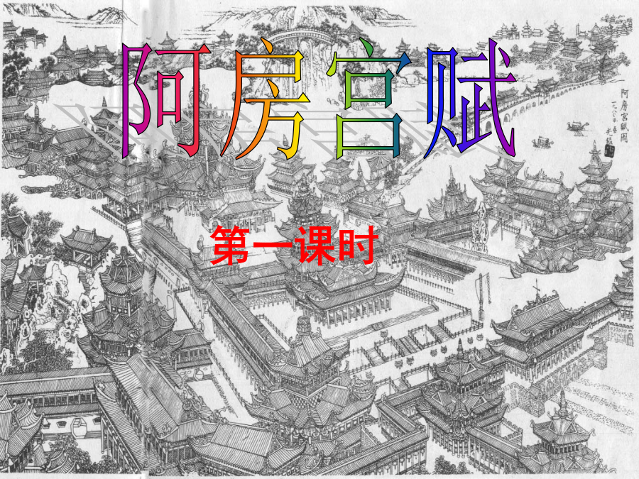 过华清宫绝句三首 (其一) 长安回望绣成堆,山顶千门次第开。 一骑红尘妃子笑,无人知是荔枝来。 江南春 千里莺啼绿映红,水村山郭酒旗风。 南朝四百八十寺,多少楼台烟雨中。 泊秦淮 烟笼寒水月笼纱,夜泊秦淮近酒家。 商女不知亡国恨,隔江犹唱后庭花。 阿房宫赋阿房宫图(一)解题 “阿房宫”的“阿房”旧读“ēpáng”,阿房是地名或山名,遗址在今西安的西南。 这篇文章的体裁是“赋”。“赋”作为一种文体有一个演变的过程。赋体以楚辞为滥觞,至荀况始有定名。它出现于战国后期,到了汉代才形成确定的体制,这是赋的渊源。赋体的流变大致经历了骚赋、汉赋、骈赋、律赋、文赋各个阶段。 关于赋的特点《文心雕龙-诠赋》说:“赋者,铺也;铺采chī文,体物写志也。”体物写志,指赋的内容;铺采chī文指赋的貌。 赋形式上: 1)用词:辞藻华丽。 2)修辞:渲染夸张,多用比喻、排比、对偶等3)讲究声韵的美(文赋), 句式多变,骈散结合, 押韵自由,韵脚灵活多变 形成一种自由而又谨严、流动而又凝滞的文体,既适合散文式的铺陈事理,又能保存一定的诗意。内容上:咏物说理,通过山水、风物、鸟兽、等来表现作者的思想感情,结尾议论,寄托讽喻(二)解说作者:杜牧不但是晚唐时期杰出的诗人,在“赋”和古文方面也都堪称大家,在诗歌方面人称他为“小杜”,以区别于“老杜”,又把他与李商隐并称为“小李杜”。他对赋这种文体也有着卓越的贡献,唐宋古文运动兴起,一些文人用古文的写作方法作赋,使之由骈俪趋向散文化,称为“文赋”,以区别于六朝的“骈赋”和唐代用来科考取士的“律赋”。杜牧的《阿房宫赋》就是这样的作品,历代被人们视为“文赋”的初期典范之作。(三)整体感知四、学习第一段:(1)重点实词 北构而西折构:动词,架木做屋引申为建筑 不霁何虹霁:雨后天晴。词类活用 1、四海一:“一”数词→动词统一 2、骊山北构而西折 “骊山”名词→状语从骊山 “北”“西”名词→状语向北向西 3、廊腰缦回 “腰”名词作动词犹如人的腰部, “缦”名词→状语像缦带一样4、蜂房水窝 名词→动词像蜂房像水窝 5、未云何龙,不霁何虹“云”“龙”“虹”,名词 →动词出现云彩出现龙出现虹 6、歌台暖响 “响”动词→名词歌声占地广 建筑物之高在这一节中,作者由远及近,由外及内逐一介绍了阿房宫之奇观,叙述中时有大胆的夸张、贴切生动之比喻,如“长桥卧波”,“复道行空”,用笔经济,形象生动。叙述中也间有动态描写,像定“二川”,写歌舞,状声摹形,引人入胜。再加上大量对偶句式的运用,使文句音节铿锵,并有音韵之美。 第二课时 (一)分析第二段:学生质疑、教师指点 3、辇来于秦 辇:名词作状语,用辇车 4、燕赵之收藏,韩魏之经营,齐楚之精英 5、鼎铛玉石,金块珠砾 鼎、玉、金、珠,是名词用着状语。铛、石、块、砾,是名词用着动词。段意理解 1)宫人的生活情境 早上梳妆 生活寂寞2、段意理解 这一段作者用了大量的排比,比喻,铺写了秦王的骄奢淫靡,滥用民力,致使农民起义,一举灭秦。“叫、举、炬”三介动词,促促相连,生动地表现了农民起义风起云涌、摧枯拉朽之势,火山爆发之烈,迅猛异常,不可压抑。“可怜焦土’与上面的壮丽描绘形成鲜明的对比,显得收束有力,概括了秦的迅速灭亡。(三)研读第四段 段意理解 这一段作者发表议论,指出六国灭亡秦朝覆灭,其根本原因在于本同自己而非秦国和天下人。作者运用了假设论证,说明爱护百姓可以拒敌固国,万世而为君,民心向背决定国家存亡。 作者讽谏时弊,希望统治者以秦灭亡为借鉴。(四)讨论 关于秦灭亡的议论,本文与《过秦论》有哪些相似之处?它们的立论角度又有何不同? 相似:1、都有肯定了秦朝的强大,都强调秦朝灭亡是毁于自己,都有说明了秦朝灭亡的迅速,指出秦朝灭亡的原因是不施仁政。 2、都受到赋的影响,甚至本身就是赋。立论不同: 1、《过秦论》以先后对比的角度说明“仁义不施而攻守之势异也”的道理;《阿房宫赋》以“秦爱纷奢”的角度指出了秦朝灭亡的原因。 2、《过》以秦的兴盛反衬它的灭亡;《阿》以对阿房宫寓言式的描写,表明秦朝必然灭亡的结局, 3、《过》作为政论文重在说理,《阿》作为一篇赋重在讽喻现实。布置作业 完成课后练习和本课练习册2、结合课后练习一,从总体上把握全文