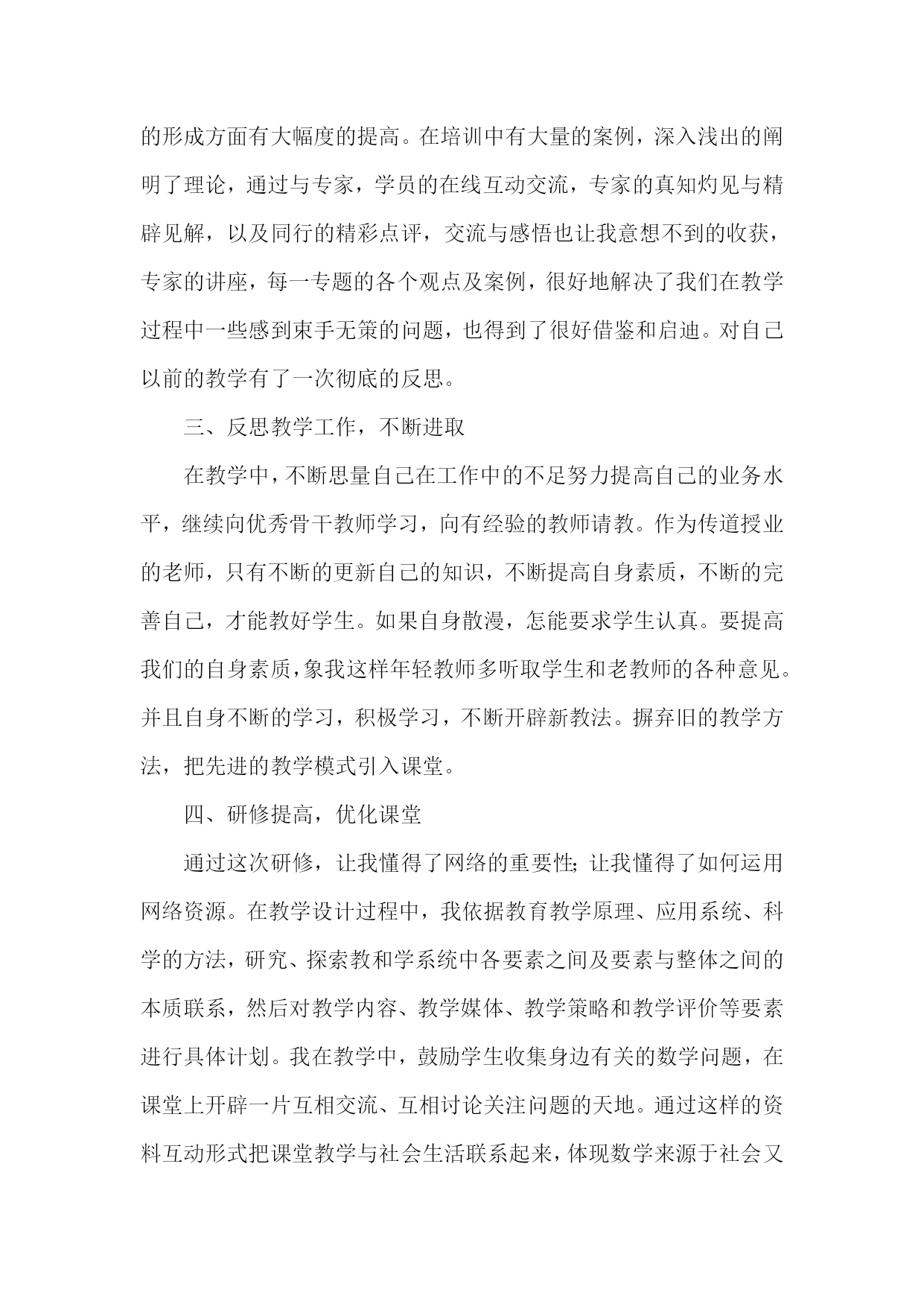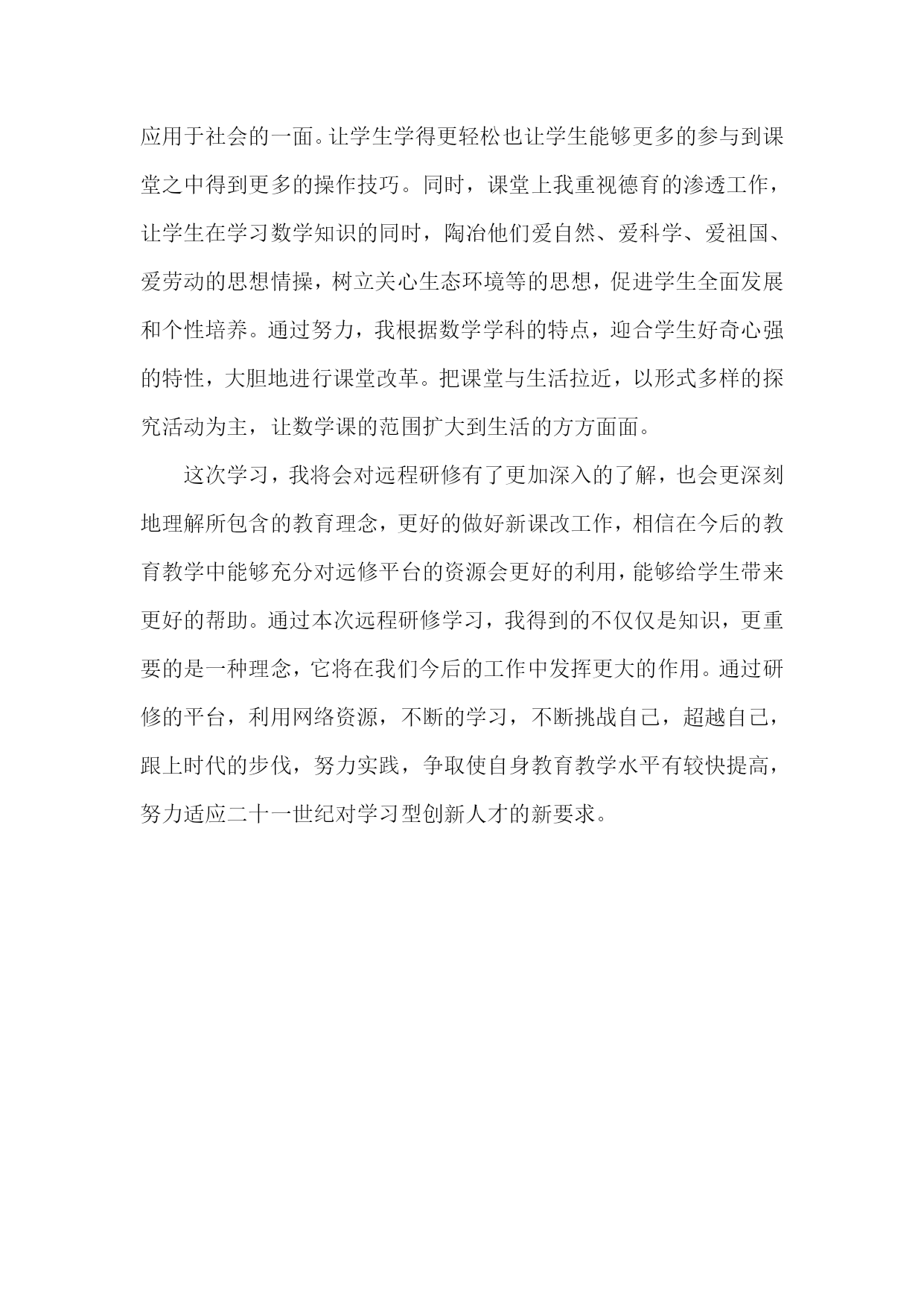 小学数学“国培”个人研修成果 危金涛 三个月的网上培训即将结束。通过参加国培培训,我认真观看专家的每一个视频和学习材料。在学习过程中,我感受到了国培的深意。国培为我们农村教师提供了足不出户就能“充电”的好机会,引领激励着我们全体教师转变教育理念,改变教学方式,带着收获,带着感悟,以积极的工作热情投入到教学中去,以学生为本,为促进全体学生的发展而努力。通过远程研修自己的基本素质,和业务综合能力都得到了全面的提高,对于今后的发展起到了积极的促进作用。现在就把我个人网络研修学习活动主要收获总结如下: 一、转变思想,更新观念 我积极投身研修的学习当中,切实做到了三个“自觉”:自觉参加上级组织的学习培训,自觉参加讨论,自觉上交作业。通过研修,使我明确了现代教育的本质,明确课改对于教师提出了什么样的素质要求。我通过深入学习,并明确了作为一名教师必须不断的提高自己,充实自己,具有丰富的知识含量,扎实的教学基本功,否则就要被时代所淘汰,增强了自身学习的紧迫性,危机感和责任感,树立了“以学生发展为本”的教育思想,不断进行教学观念的更新,教学行为和学生的学习方式也有了根本性的改变。 二、积极研修,深刻感悟 在这期间,通过研修学习,学了不少知识,为我营造了一个广阔的学习天地,使我掌握了先进的教育理念知识和方法。我觉得在理论的形成方面有大幅度的提高。在培训中有大量的案例,深入浅出的阐明了理论,通过与专家,学员的在线互动交流,专家的真知灼见与精辟见解,以及同行的精彩点评,交流与感悟也让我意想不到的收获,专家的讲座,每一专题的各个观点及案例,很好地解决了我们在教学过程中一些感到束手无策的问题,也得到了很好借鉴和启迪。对自己以前的教学有了一次彻底的反思。 三、反思教学工作,不断进取 在教学中,不断思量自己在工作中的不足努力提高自己的业务水平,继续向优秀骨干教师学习,向有经验的教师请教。作为传道授业的老师,只有不断的更新自己的知识,不断提高自身素质,不断的完善自己,才能教好学生。如果自身散漫,怎能要求学生认真。要提高我们的自身素质,象我这样年轻教师多听取学生和老教师的各种意见。并且自身不断的学习,积极学习,不断开辟新教法。摒弃旧的教学方法,把先进的教学模式引入课堂。 四、研修提高,优化课堂 通过这次研修,让我懂得了网络的重要性;让我懂得了如何运用网络资源。在教学设计过程中,我依据教育教学原理、应用系统、科学的方法,研究、探索教和学系统中各要素之间及要素与整体之间的本质联系,然后对教学内容、教学媒体、教学策略和教学评价等要素进行具体计划。我在教学中,鼓励学生收集身边有关的数学问题,在课堂上开辟一片互相交流、互相讨论关注问题的天地。通过这样的资料互动形式把课堂教学与社会生活联系起来,体现数学来源于社会又应用于社会的一面。让学生学得更轻松也让学生能够更多的参与到课堂之中得到更多的操作技巧。同时,课堂上我重视德育的渗透工作,让学生在学习数学知识的同时,陶冶他们爱自然、爱科学、爱祖国、爱劳动的思想情操,树立关心生态环境等的思想,促进学生全面发展和个性培养。通过努力,我根据数学学科的特点,迎合学生好奇心强的特性,大胆地进行课堂改革。把课堂与生活拉近,以形式多样的探究活动为主,让数学课的范围扩大到生活的方方面面。 这次学习,我将会对远程研修有了更加深入的了解,也会更深刻地理解所包含的教育理念,更好的做好新课改工作,相信在今后的教育教学中能够充分对远修平台的资源会更好的利用,能够给学生带来更好的帮助。通过本次远程研修学习,我得到的不仅仅是知识,更重要的是一种理念,它将在我们今后的工作中发挥更大的作用。通过研修的平台,利用网络资源,不断的学习,不断挑战自己,超越自己,跟上时代的步伐,努力实践,争取使自身教育教学水平有较快提高,努力适应二十一世纪对学习型创新人才的新要求。