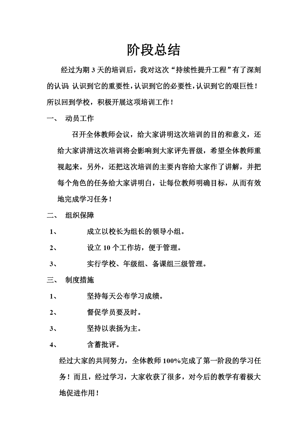 阶段总结 经过为期3天的培训后,我对这次“持续性提升工程”有了深刻的认识:认识到它的重要性,认识到它的必要性,认识到它的艰巨性!所以回到学校,积极开展这项培训工作! 动员工作 召开全体教师会议,给大家讲明这次培训的目的和意义,还给大家讲清这次培训将会影响到大家评先晋级,希望全体教师重视起来。另外,还把这次培训的主要内容给大家作了讲解,并把每个角色的任务给大家讲明白,让每位教师明确目标,从而有效地完成学习任务! 组织保障 成立以校长为组长的领导小组。 设立10个工作坊,便于管理。 实行学校、年级组、备课组三级管理。 制度措施 坚持每天公布学习成绩。 督促学员要及时。 坚持以表扬为主。 含蓄批评。 经过大家的共同努力,全体教师100%完成了第一阶段的学习任务!而且,经过学习,大家收获了很多,对今后的教学有着极大地促进作用!