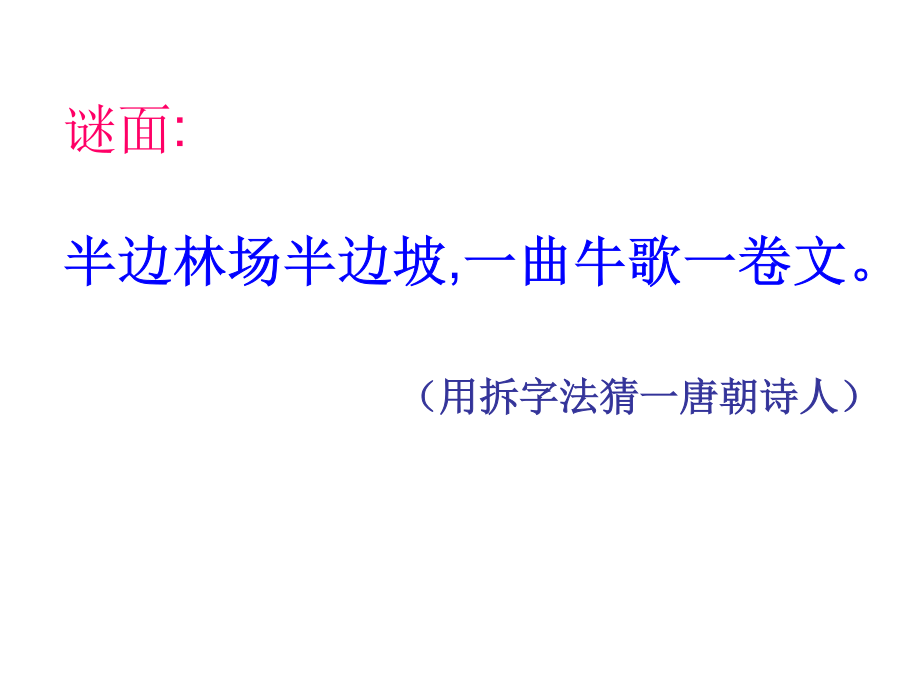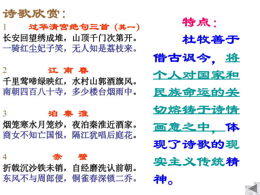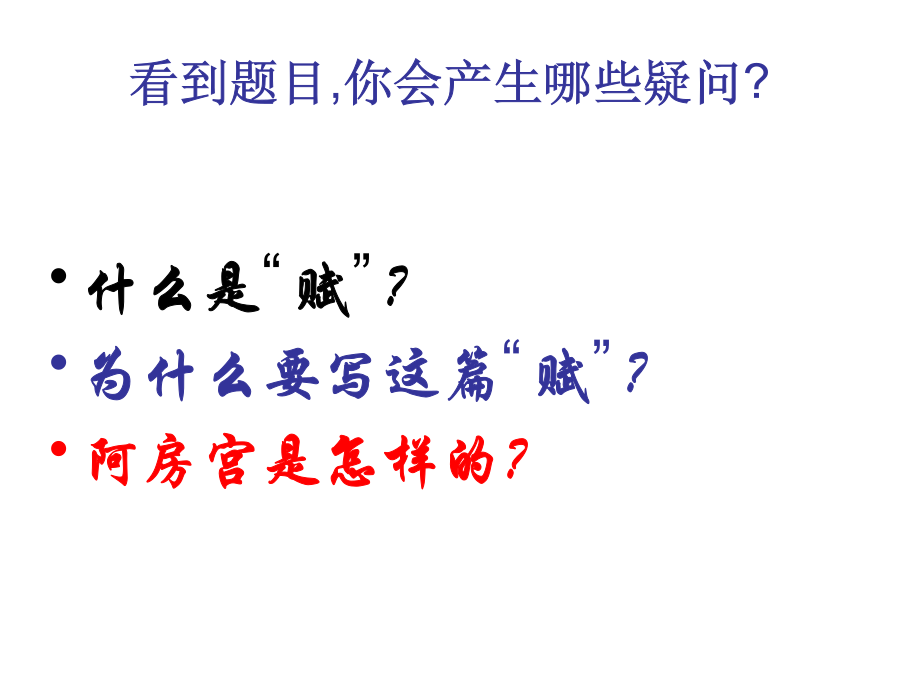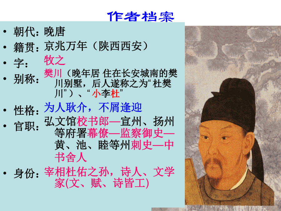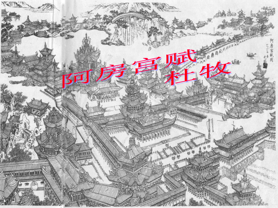 谜面:半边林场半边坡,一曲牛歌一卷文。(用拆字法猜一唐朝诗人)作者档案诗歌欣赏: 1过华清宫绝句三首(其一) 长安回望绣成堆,山顶千门次第开。 一骑红尘妃子笑,无人知是荔枝来。 2江南春 千里莺啼绿映红,水村山郭酒旗风。 南朝四百八十寺,多少楼台烟雨中。 3泊秦淮 烟笼寒水月笼纱,夜泊秦淮近酒家。 商女不知亡国恨,隔江犹唱后庭花。 4赤壁 折戟沉沙铁未销,自经磨洗认前朝。 东风不与周郎便,铜雀春深锁二乔。阿房宫赋 杜牧看到题目,你会产生哪些疑问?赋:一种文体。 赋体以楚辞为滥觞(起源),至荀况始有定名。它出现于战国后期,到了汉代才形成确定的体制,这是赋的渊源。 赋体的流变大致经历了(屈原为代表)骚赋、(汉)辞赋、(魏晋)骈赋、(唐)律赋、(宋)文赋各个阶段。(《阿房宫赋》历来被人们视为“文赋”的初期典范之作。) 1、在艺术表现形式上: 2、在语言上: 3、在句式上: 4、在内容上: 为什么要写这篇“赋”?阿房宫读一读:整体感知骄奢淫逸之一:宫殿雄伟壮观了解阿房宫:第一段(1)翻译:阿房概貌接着,我们随着缓缓流淌的渭水、樊川二河,由远而近,由外而内走进这壮丽的阿房宫吧。阿房宫的壮丽、规模体现在什么建筑上呢?五步一楼,十步一阁; 廊腰缦回,檐牙高啄; 各抱地势,钩心斗角。 盘盘焉,囷囷焉, 蜂房水涡,矗不知其几千万落。焉长桥卧波,未云何龙? 复道行空,不霁何虹? 渭水和樊川,缓缓地流淌,流进了宫墙。 五步一座高楼,十步一座亭阁; 宫殿的走廊回环曲折,屋檐高高地像鸟嘴一样翘起。各自随着地势的不同(而建)。参差分布,彼此回环掩抱,飞檐交错连接。盘盘旋旋,曲曲折折,像蜂房像水涡,矗立着不知道几千万座。 长桥横卧波面,(但)没有出现云彩怎么会有蛟龙飞腾?(楼阁之间的)通道横跨半空,没有雨过天晴怎么会出现彩虹。高低冥迷,不知西东。分辨不清 歌台暖响,春光融融; 舞殿冷袖,风雨凄凄。 一日之内,一宫之间,而气候不齐。第一段(3)翻译:阿房歌舞在这一段中,作者由远及近,由外及内逐一介绍了阿房宫之奇观,叙述中时有贴切生动之比喻,如“长桥卧波”,“复道行空”,用笔经济,形象生动。叙述中也间有动态描写,像“二川”,写歌舞,状声摹形,引人入胜。再加上大量排比、对偶句式的运用,使文句音节铿锵,并有音韵之美。 古今异义 四海一 骊山北构而西折 廊腰缦回 蜂房水窝 未云何龙,不霁何虹 骄奢淫逸之二:美人众多(第二段第一层))第二段翻译这一层作者写了宫人的来历,写宫人的生活情境,以及宫人的悲惨命运来反映秦王的生活奢侈,荒淫。 第二段(第二层):珍宝众多这是用了互文的修辞格----本应合在一起说的词,因对偶、押韵或字数的限制,临时拆开来使用,但理解时又应合在一块儿。这句话可译为“燕、赵、齐、楚、韩、魏六国统治者的无数的金玉珍宝”。鼎铛玉石,金块珠砾 鼎、玉,是名词做动语。 把宝鼎当作……,把美玉当作……, 把金块当作……,把珍珠当作……。 嗟乎!一人之心,千万人之心也。秦爱纷奢,人亦念其家。奈何取之尽锱铢,用之如泥沙?使负栋之柱,多于南亩之农夫;架梁之椽,多于机上之工女;钉头磷磷,多于庾之粟粒;瓦缝参差,多于周身之帛缕;直栏横槛,多于九土之城郭;管弦呕哑,多于市人之言语。使天下之人,不敢言而敢怒。独夫之心,日益骄固。戍卒叫,函谷举,楚人一炬,可怜焦土!取举一第三段翻译这一段作者用了大量的排比,比喻,铺写了秦王的骄奢淫靡,滥用民力,致使农民起义,一举灭秦。“叫、举、炬”三个动词,促促相连,生动地表现了起义风起云涌、摧枯拉朽之势,如火山爆发之烈,迅猛异常,不可压抑。“可怜焦土’与上面的壮丽描绘形成鲜明的对比,显得收束有力,概括了秦的迅速灭亡。之灭六国者,六国也,非秦也。 族秦者,秦也,非天下也。 嗟乎!使六国各爱其人,则足以拒秦。 使秦复爱六国之人,则递三世可至万世而为君,谁得而族灭也?族第四段翻译思考:杜牧认为秦灭亡的根本原因是什么?回顾课文再理思路杜牧《阿房宫赋》 ——灭六国者六国也,非秦也; 族秦者秦也,非天下也。安徽阜阳花费3000万元建造的政府办公楼重庆市忠县黄金镇政府办公楼旗帜飘扬广东省河源市东源县徐洞村办公楼濮阳县委县政府综合办公大楼 这座办公大楼落成已有两年多,超出预算两倍, 至今仍欠200多万元的工程款未付。山东省龙口市(县级)政府办公楼江津市几江街道办事处办公大楼 被网友称为“国内第一豪华街道办事处”郑州市惠济区政府办公区内人工湖郑州市惠济区政府会议室国徽高瞻华灯金碧人民网评无棣县府超豪华办公楼不挂牌 近来,不少无棣百姓反映,眼下找无棣县政府机构办事“两眼一抹黑”。原来的无棣县政府机构乔迁新址后,挂牌地方(旧址)无人办公,办公地方(新址)却不挂牌。不知情的老百姓在新旧地点间疲于穿梭、往往南辕北辙、