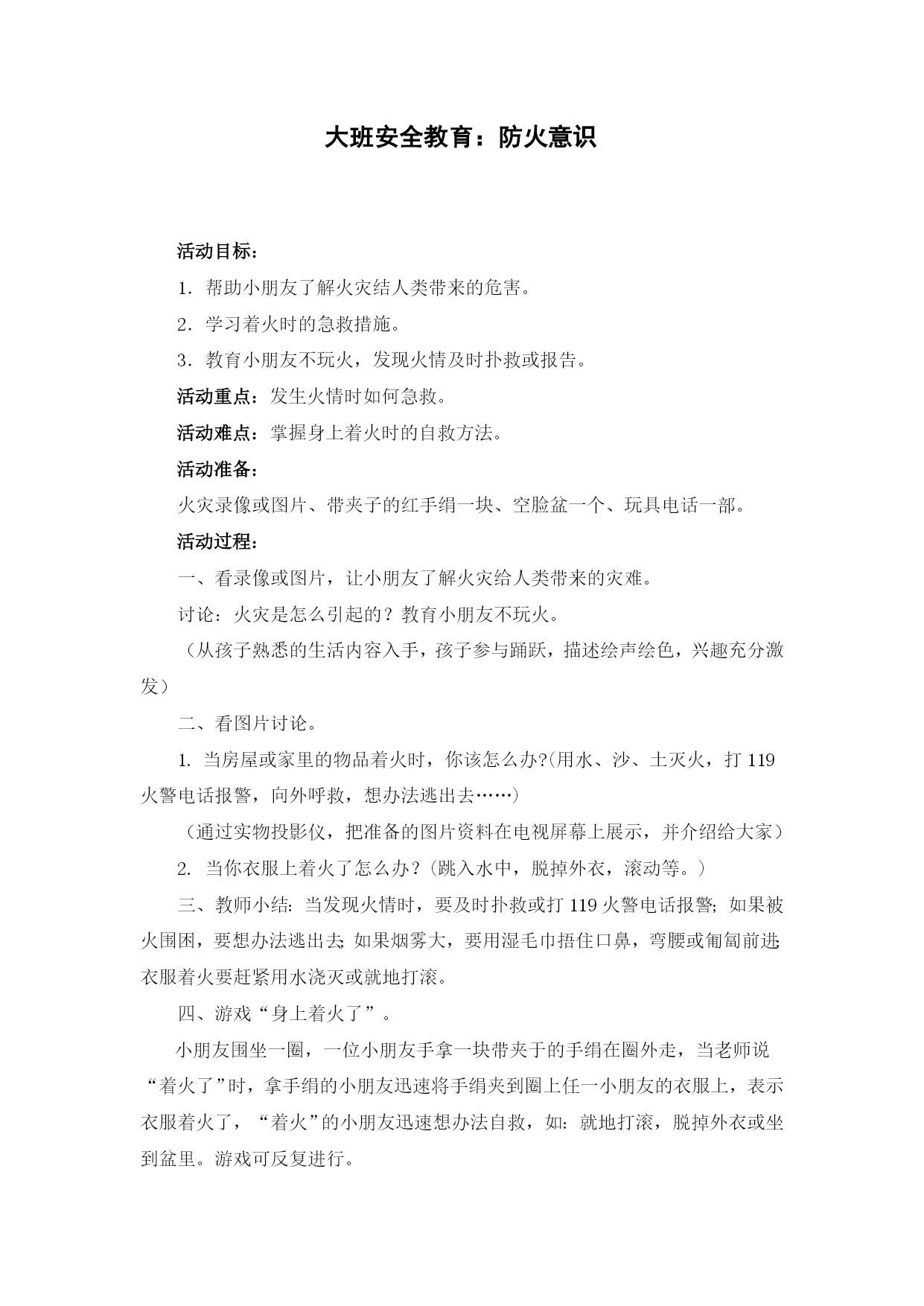 大班安全教育:防火意识 活动目标: 1.帮助小朋友了解火灾结人类带来的危害。 2.学习着火时的急救措施。 3.教育小朋友不玩火,发现火情及时扑救或报告。 活动重点:发生火情时如何急救。 活动难点:掌握身上着火时的自救方法。 活动准备: 火灾录像或图片、带夹子的红手绢一块、空脸盆一个、玩具电话一部。 活动过程: 一、看录像或图片,让小朋友了解火灾给人类带来的灾难。 讨论:火灾是怎么引起的?教育小朋友不玩火。 (从孩子熟悉的生活内容入手,孩子参与踊跃,描述绘声绘色,兴趣充分激发) 二、看图片讨论。 1.当房屋或家里的物品着火时,你该怎么办?(用水、沙、土灭火,打119火警电话报警,向外呼救,想办法逃出去……) (通过实物投影仪,把准备的图片资料在电视屏幕上展示,并介绍给大家) 2.当你衣服上着火了怎么办?(跳入水中,脱掉外衣,滚动等。) 三、教师小结:当发现火情时,要及时扑救或打119火警电话报警;如果被火围困,要想办法逃出去;如果烟雾大,要用湿毛巾捂住口鼻,弯腰或匍匐前进;衣服着火要赶紧用水浇灭或就地打滚。 四、游戏“身上着火了”。 小朋友围坐一圈,一位小朋友手拿一块带夹于的手绢在圈外走,当老师说“着火了”时,拿手绢的小朋友迅速将手绢夹到圈上任一小朋友的衣服上,表示衣服着火了,“着火”的小朋友迅速想办法自救,如:就地打滚,脱掉外衣或坐到盆里。游戏可反复进行。