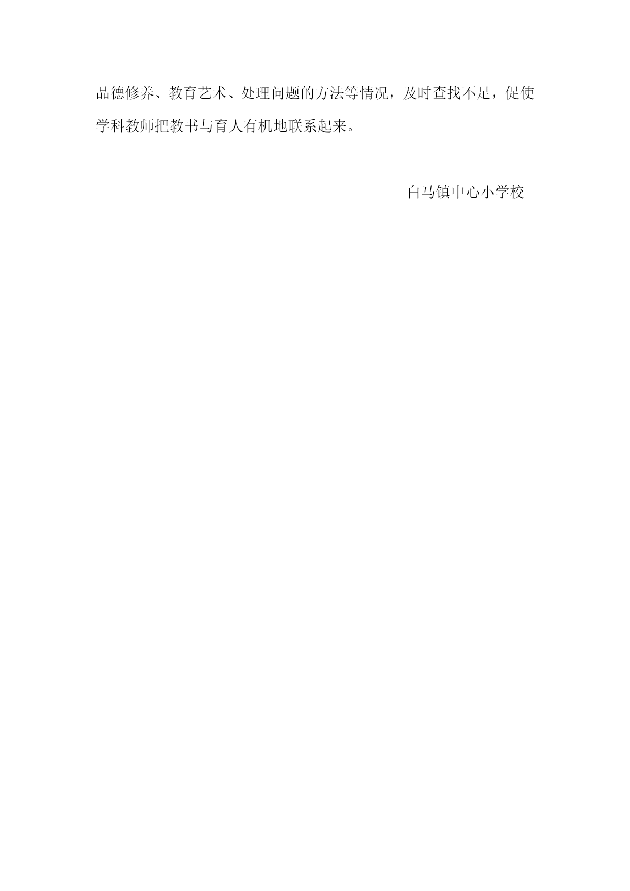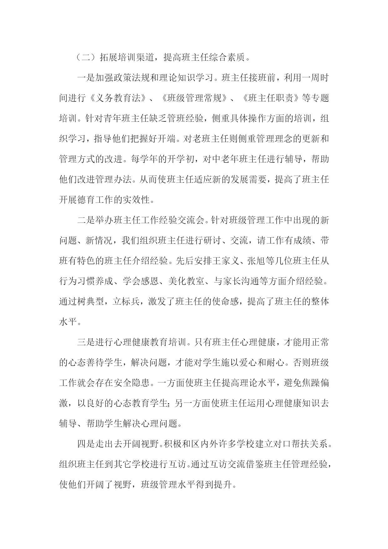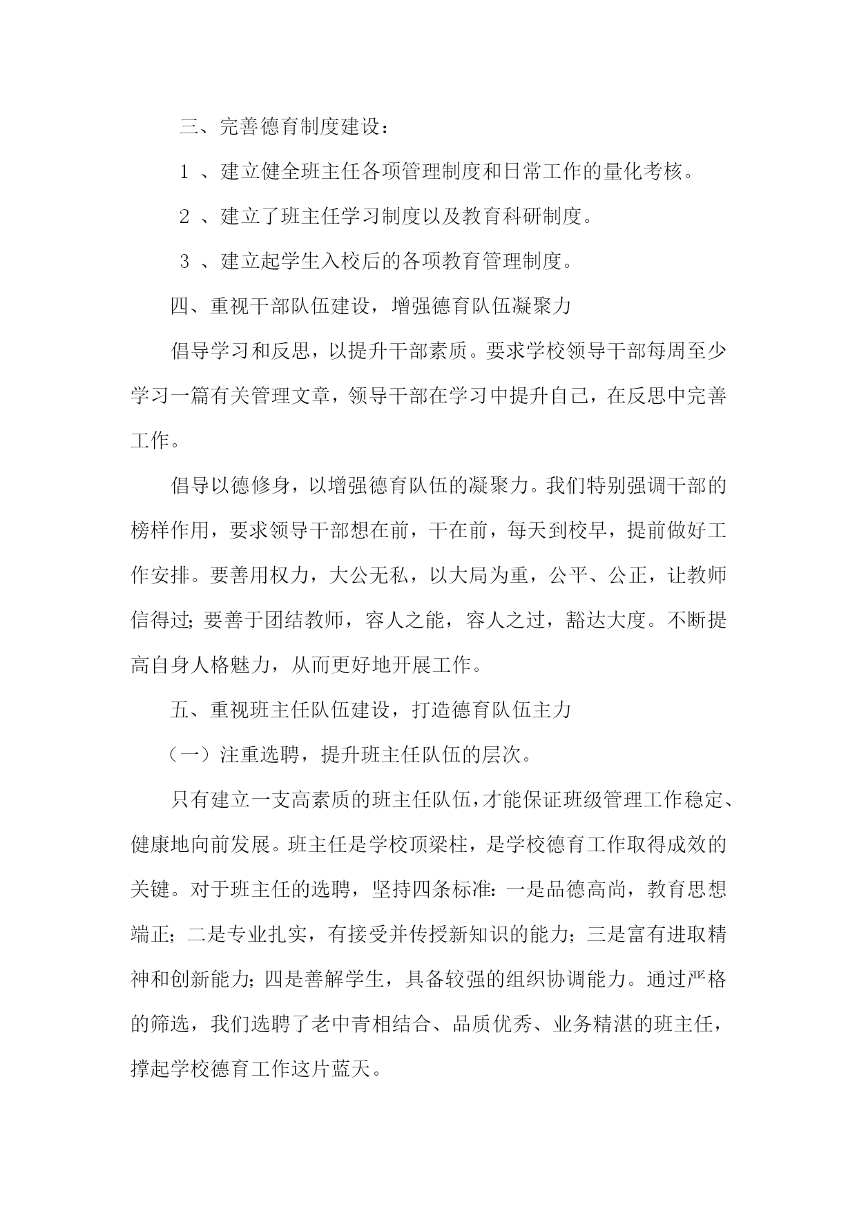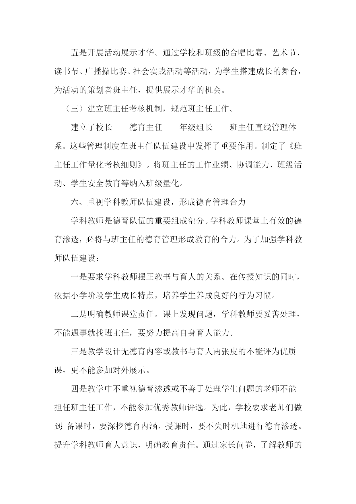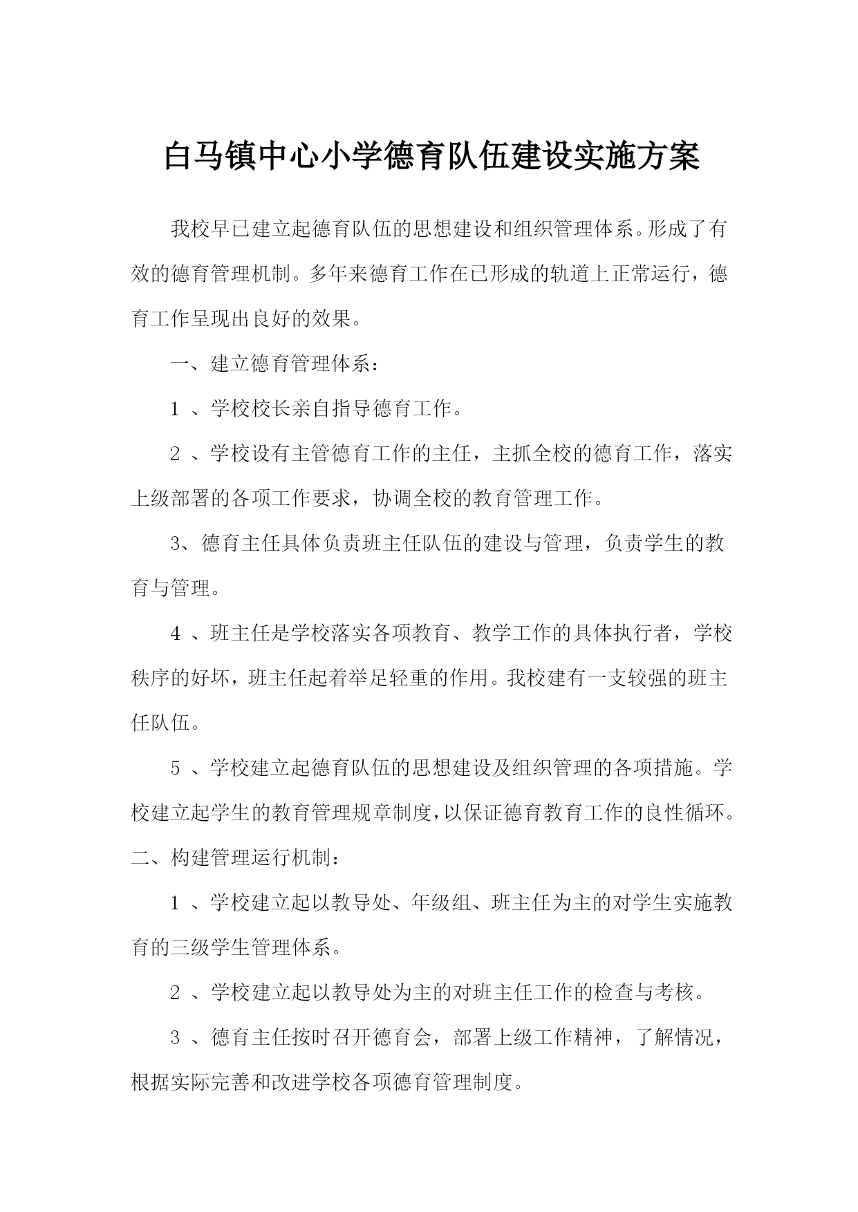 白马镇中心小学德育队伍建设实施方案 我校早已建立起德育队伍的思想建设和组织管理体系。形成了有效的德育管理机制。多年来德育工作在已形成的轨道上正常运行,德育工作呈现出良好的效果。 一、建立德育管理体系: 1、学校校长亲自指导德育工作。 2、学校设有主管德育工作的主任,主抓全校的德育工作,落实上级部署的各项工作要求,协调全校的教育管理工作。 3、德育主任具体负责班主任队伍的建设与管理,负责学生的教育与管理。 4、班主任是学校落实各项教育、教学工作的具体执行者,学校秩序的好坏,班主任起着举足轻重的作用。我校建有一支较强的班主任队伍。 5、学校建立起德育队伍的思想建设及组织管理的各项措施。学校建立起学生的教育管理规章制度,以保证德育教育工作的良性循环。 二、构建管理运行机制: 1、学校建立起以教导处、年级组、班主任为主的对学生实施教育的三级学生管理体系。 2、学校建立起以教导处为主的对班主任工作的检查与考核。 3、德育主任按时召开德育会,部署上级工作精神,了解情况,根据实际完善和改进学校各项德育管理制度。 三、完善德育制度建设: 1、建立健全班主任各项管理制度和日常工作的量化考核。 2、建立了班主任学习制度以及教育科研制度。 3、建立起学生入校后的各项教育管理制度。 四、重视干部队伍建设,增强德育队伍凝聚力 倡导学习和反思,以提升干部素质。要求学校领导干部每周至少学习一篇有关管理文章,领导干部在学习中提升自己,在反思中完善工作。 倡导以德修身,以增强德育队伍的凝聚力。我们特别强调干部的榜样作用,要求领导干部想在前,干在前,每天到校早,提前做好工作安排。要善用权力,大公无私,以大局为重,公平、公正,让教师信得过;要善于团结教师,容人之能,容人之过,豁达大度。不断提高自身人格魅力,从而更好地开展工作。 五、重视班主任队伍建设,打造德育队伍主力 (一)注重选聘,提升班主任队伍的层次。 只有建立一支高素质的班主任队伍,才能保证班级管理工作稳定、健康地向前发展。班主任是学校顶梁柱,是学校德育工作取得成效的关键。对于班主任的选聘,坚持四条标准:一是品德高尚,教育思想端正;二是专业扎实,有接受并传授新知识的能力;三是富有进取精神和创新能力;四是善解学生,具备较强的组织协调能力。通过严格的筛选,我们选聘了老中青相结合、品质优秀、业务精湛的班主任,撑起学校德育工作这片蓝天。 (二)拓展培训渠道,提高班主任综合素质。 一是加强政策法规和理论知识学习。班主任接班前,利用一周时间进行《义务教育法》、《班级管理常规》、《班主任职责》等专题培训。针对青年班主任缺乏管班经验,侧重具体操作方面的培训,组织学习,指导他们把握好开端。对老班主任则侧重管理理念的更新和管理方式的改进。每学年的开学初,对中老年班主任进行辅导,帮助他们改进管理办法。从而使班主任适应新的发展需要,提高了班主任开展德育工作的实效性。 二是举办班主任工作经验交流会。针对班级管理工作中出现的新问题、新情况,我们组织班主任进行研讨、交流,请工作有成绩、带班有特色的班主任介绍经验。先后安排王家义、张旭等几位班主任从行为习惯养成、学会感恩、美化教室、与家长沟通等方面介绍经验。通过树典型,立标兵,激发了班主任的使命感,提高了班主任的整体水平。 三是进行心理健康教育培训。只有班主任心理健康,才能用正常的心态善待学生,解决问题,才能对学生施以爱心和耐心。否则班级工作就会存在安全隐患。一方面使班主任提高理论水平,避免焦躁偏激,以良好的心态教育学生;另一方面使班主任运用心理健康知识去辅导、帮助学生解决心理问题。 四是走出去开阔视野。积极和区内外许多学校建立对口帮扶关系。组织班主任到其它学校进行互访。通过互访交流借鉴班主任管理经验,使他们开阔了视野,班级管理水平得到提升。 五是开展活动展示才华。通过学校和班级的合唱比赛、艺术节、读书节、广播操比赛、社会实践活动等活动,为学生搭建成长的舞台,为活动的策划者班主任,提供展示才华的机会。 (三)建立班主任考核机制,规范班主任工作。 建立了校长——德育主任——年级组长——班主任直线管理体系。这些管理制度在班主任队伍建设中发挥了重要作用。制定了《班主任工作量化考核细则》。将班主任的工作业绩、协调能力、班级活动、学生安全教育等纳入班级量化。 六、重视学科教师队伍建设,形成德育管理合力 学科教师是德育队伍的重要组成部分。学科教师课堂上有效的德育渗透,必将与班主任的德育管理形成教育的合力。为了加强学科教师队伍建设: 一是要求学科教师摆正教书与育人的关系。在传授知识的同时,依据小学阶段学生成长特点,培养学生养成良好的行为习惯。 二是明确教师课堂责任。课上发现问题,学科教师要妥善处理,不能遇事就找班主任,要努力提高自身育人能力。 三是教学设计无德育内容或教书与育人两张皮的不能评为优质课,更