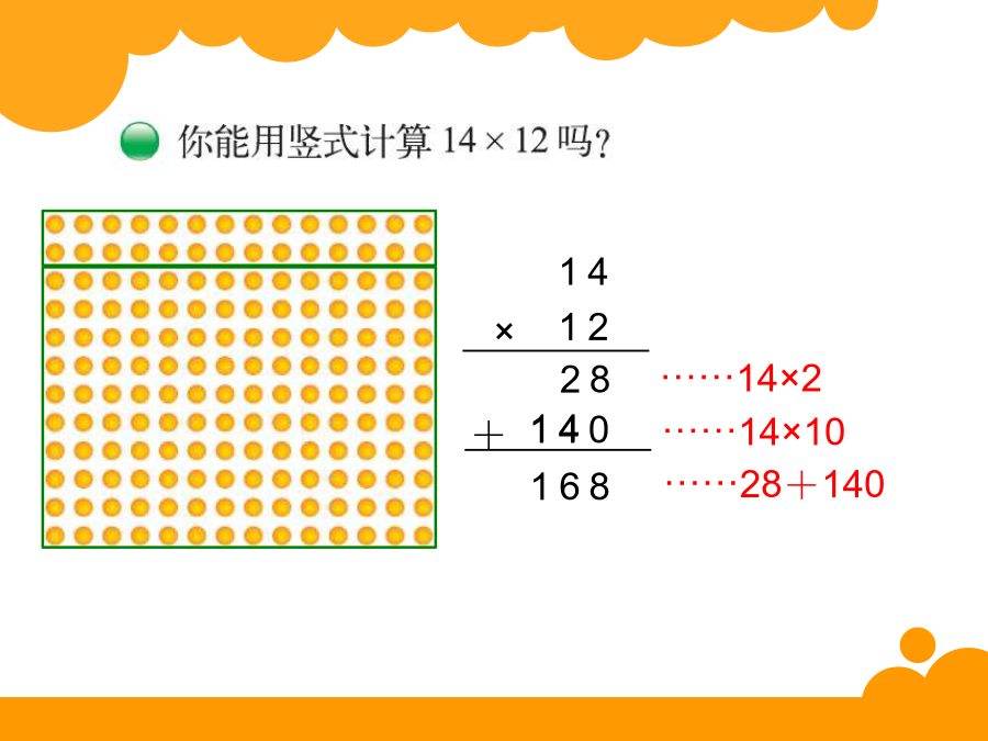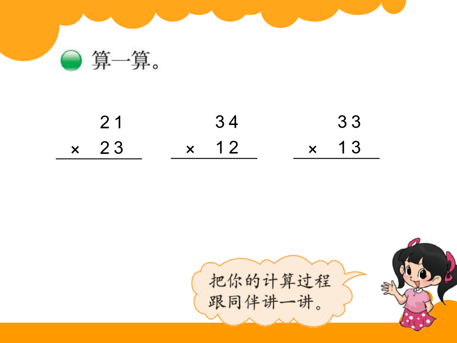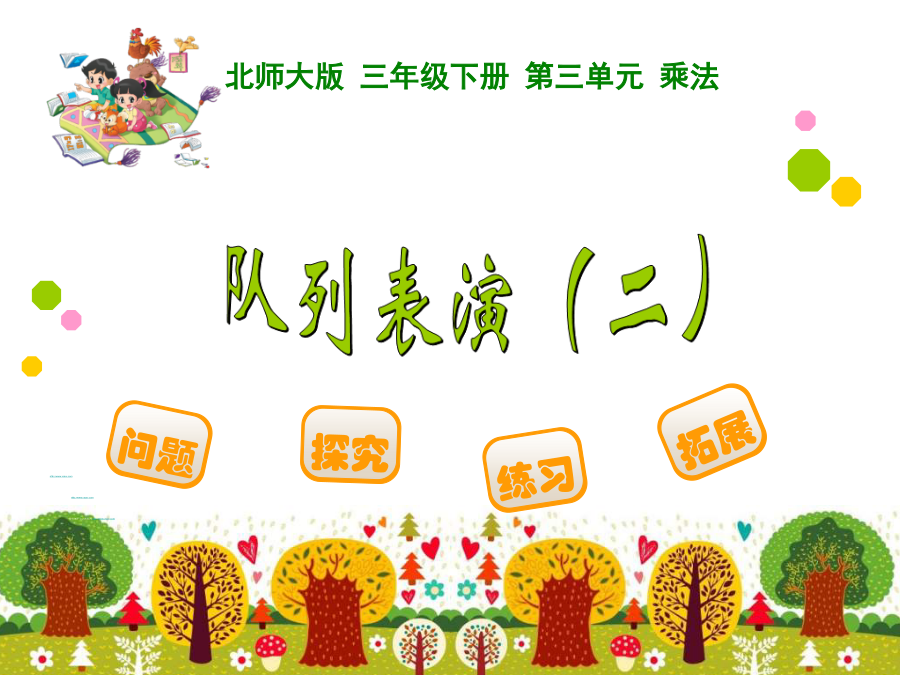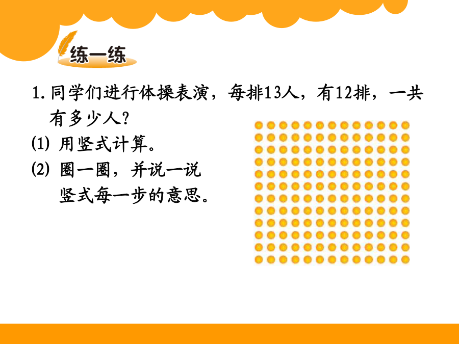 北师大版三年级下册第三单元乘法1.同学们进行体操表演,每排13人,有12排,一共 有多少人? ⑴用竖式计算。 ⑵圈一圈,并说一说 竖式每一步的意思。2.3.数一数,算一算。4.世界杯足球赛有32支球队参加,每队23名运动员。 一共有多少名运动员?5.“少先队林”里现在有多少棵树?