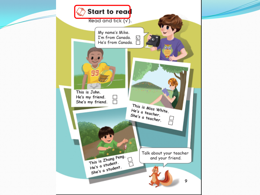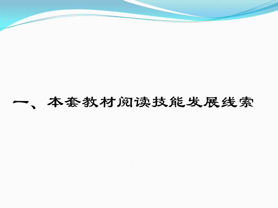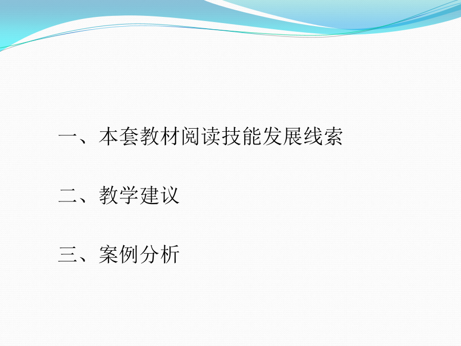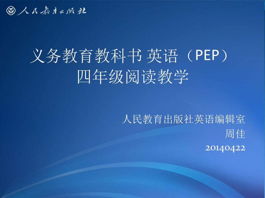 义务教育教科书英语(PEP)四年级阅读教学一、本套教材阅读技能发展线索 二、教学建议 三、案例分析一、本套教材阅读技能发展线索教学目标:能读懂组句或短文;要求在有意义的语境中抄写单元的话题词汇;复习巩固单元核心句型,要求能够听、说、认读。课程标准中关于阅读技能教学的描述从教学目标倒推教学环节 合理设计读前-读中-读后 考虑任务的真实交际意义教学目标三下UNIT2Thisismyfamily. Thisismyfamily. Thisismymother. Thisismyfamily. Thisismymother. Thisismyfather.Thisismyfamily. Thisismymother. Thisismyfather. Thisismygrandfather. Thisismyfamily. Thisismymother. Thisismyfather. Thisismygrandfather. Thisismygrandmother. Lookatthepictures.Howmanypeoplecanyousee?Whoarethey? Readandmatch.订正答案Actitout.Talkaboutyourfamily.作业(选择一项)四上UNIT6四年级阅读板块要求变化Unit6Readandwrite教学目标: 认读目标:核心词(职业单词)、____isa____.______is_____. 信息理解目标:图、文 写的目标:He/She,职业词汇,个性化 Thisismyfamily.Mymotherisateacher.Sheisveryfriendly. Myfatherisabasketballplayer.Heistallandstrong. Myuncleisacook.Myauntisanurse. Iamastudent.Ihavenojob.√Doasurvey.教学环节设计小结 1.认读目标的实现: 读前——复习 读中——教师讲述故事、提问、故意出错 2.信息获取: 读中:划出职业词汇 读后:读图说出对应词汇,对照划出的单词完成连线;调查获取更多信息 3.写:写给谁?设计有意义的书写活动。四上Unit3观看示范课Afterwatching谢谢!