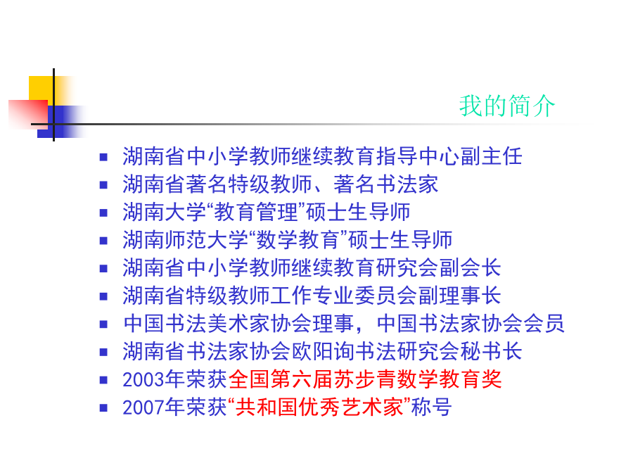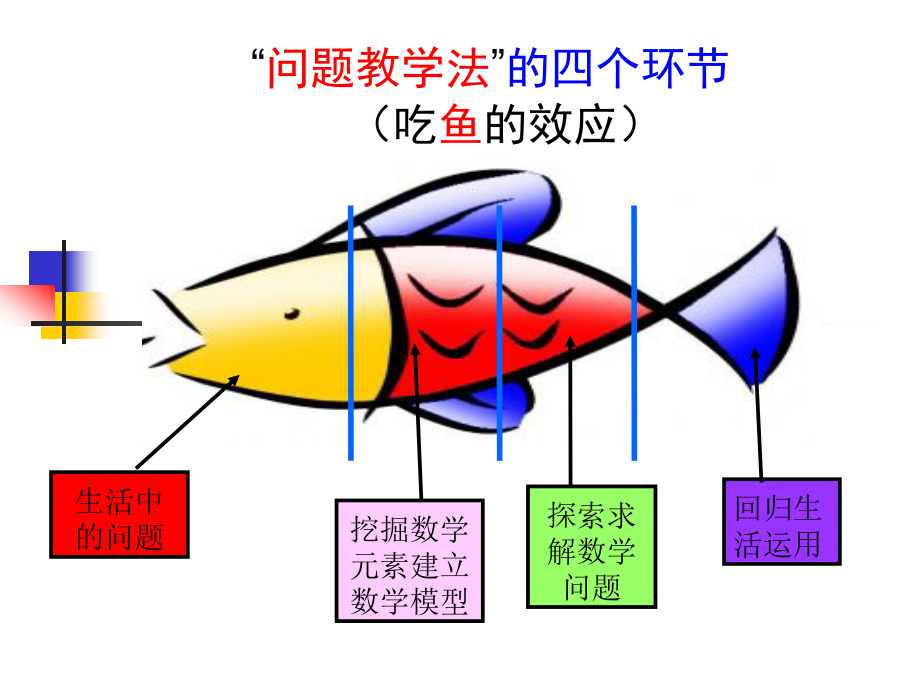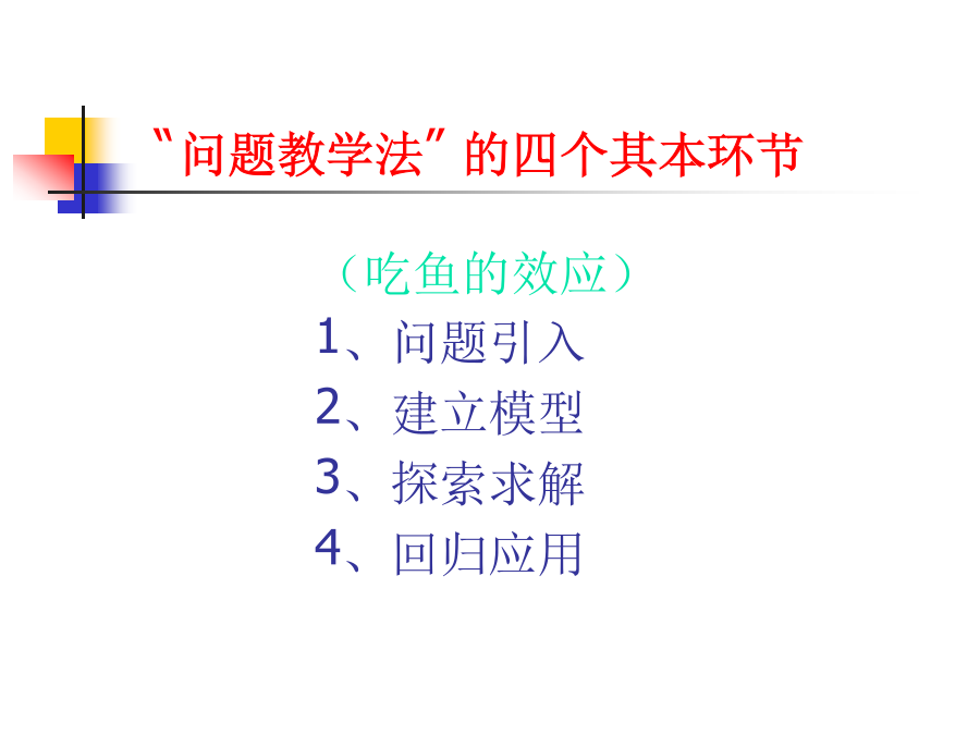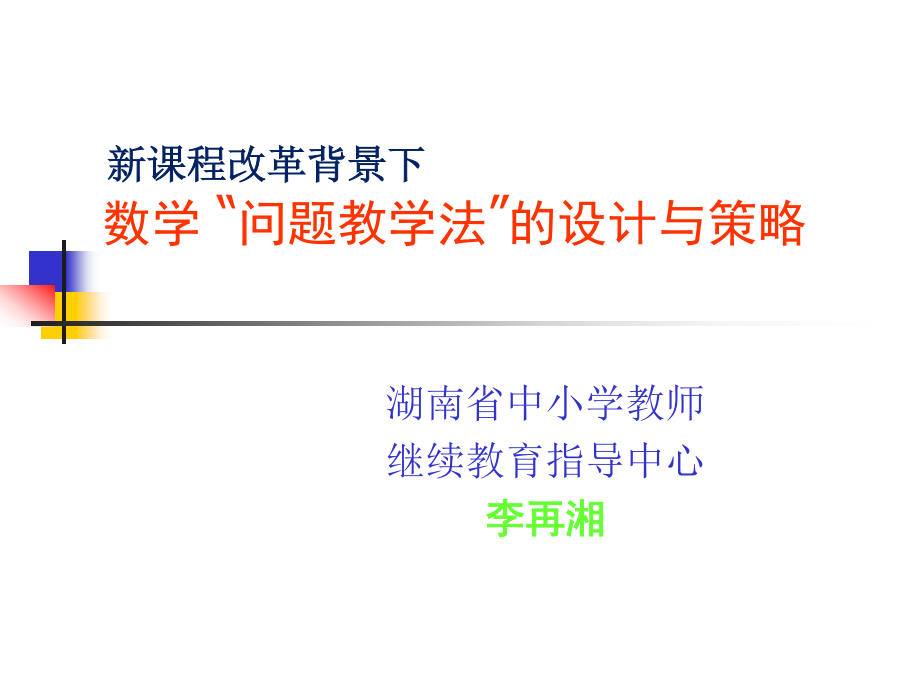 新课程改革背景下数学“问题教学法”的设计与策略我的简介我的交流联系方式“问题教学法”的四个其本环节生活中的问题1.突出体现“问题教学法”的几大特征2.体现新课程的新理念3.突出体现几大教学原则第一部分 评价一堂好课的基本 要素和标准 一、教学理念二、教学目标①教材取舍详略得当; ②把握教材重点、突破难点; ③创造性地对教材进行加工,既注重“双基”训练,又注重学习潜能开发。 四、教学过程: ①根据需要将多种教学方法进行优化组合; ②现代教育技术的运用恰当而有效; ③注重学生学习方法和学习习惯的培养。 ①教学态度认真负责; ②教学基本功扎实; ③有较高的教学理论素养并用于指导教学实践; ④课堂教学表达富有激情且具有较好的教学机智。 七、教学效果: ①课堂教学在某一方面有创新,而且提高了教学效益; ②形成自己独特的教学风格。 第二部分一、课堂教学的四个其本环节生活中的问题二、教学设计要实现”四备“备手段:课堂教学CAI多媒体课件制作的原则三、课堂教学的关注点三、课堂教学的关注点三、课堂教学的关注点三、课堂教学的关注点三、课堂教学的关注点三、课堂教学的关注点三、课堂教学的关注点三、课堂教学的关注点四、课堂教学的终极目标