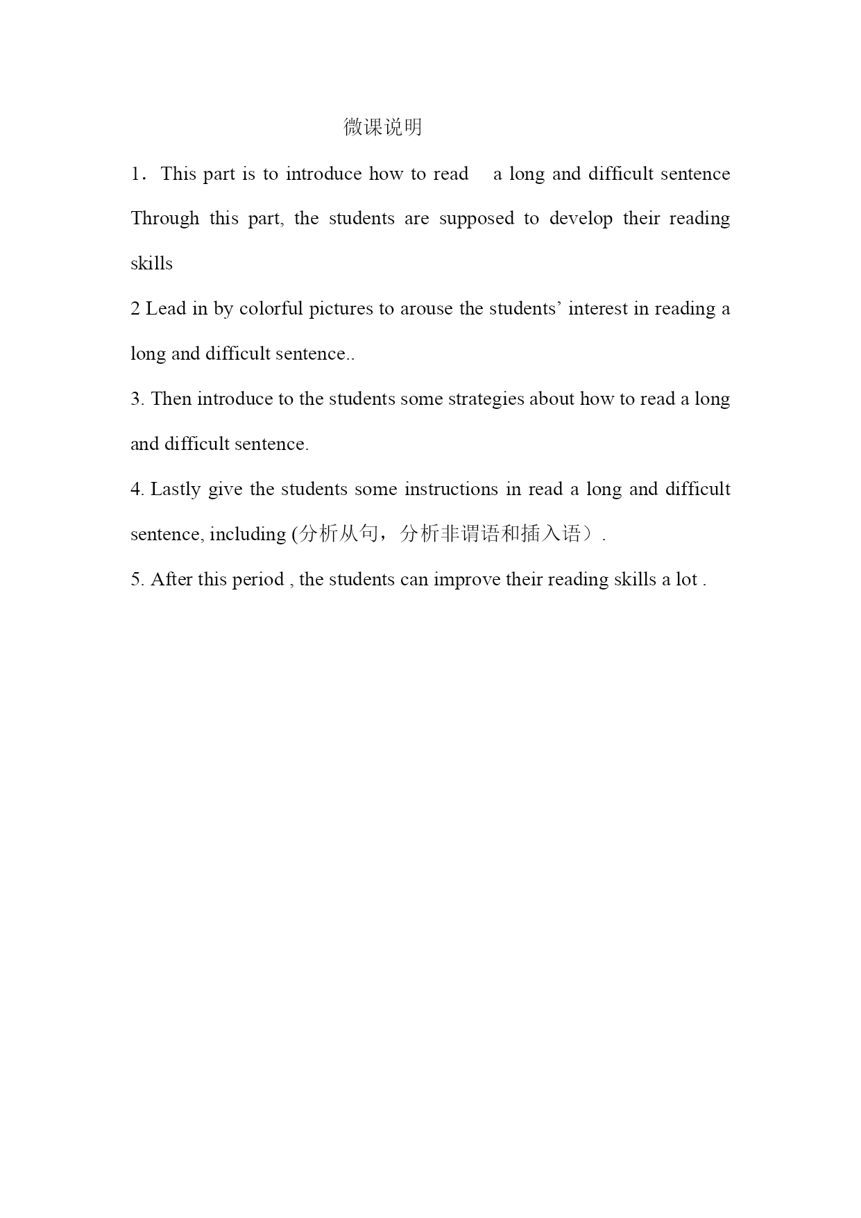 微课说明 ThispartistointroducehowtoreadalonganddifficultsentenceThroughthispart,thestudentsaresupposedtodeveloptheirreadingskills 2Leadinbycolorfulpicturestoarousethestudents’interestinreadingalonganddifficultsentence.. Thenintroducetothestudentssomestrategiesabouthowtoreadalonganddifficultsentence. Lastlygivethestudentssomeinstructionsinreadalonganddifficultsentence,including(分析从句,分析非谓语和插入语). 5.Afterthisperiod,thestudentscanimprovetheirreadingskillsalot.