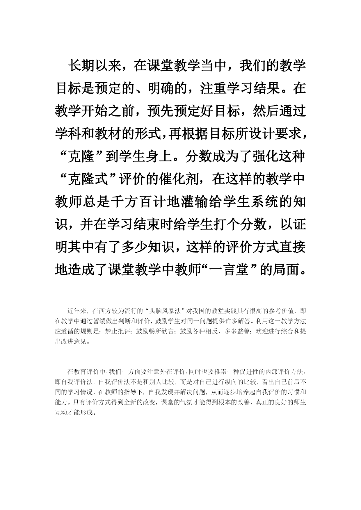 长期以来,在课堂教学当中,我们的教学目标是预定的、明确的,注重学习结果。在教学开始之前,预先预定好目标,然后通过学科和教材的形式,再根据目标所设计要求,“克隆”到学生身上。分数成为了强化这种“克隆式”评价的催化剂,在这样的教学中教师总是千方百计地灌输给学生系统的知识,并在学习结束时给学生打个分数,以证明其中有了多少知识,这样的评价方式直接地造成了课堂教学中教师“一言堂”的局面。 近年来,在西方较为流行的“头脑风暴法”对我国的教堂实践具有很高的参考价值,即在教学中通过暂缓做出判断和评价,鼓励学生对同一问题提供许多解答。利用这一教学方法应遵循的规则是:禁止批评;鼓励畅所欲言;鼓励各种相反,多多益善;欢迎进行综合和提出改进意见。 在教育评价中,我们一方面要注意外在评价,同时也要推崇一种促进性的内部评价方法,即自我评价法。自我评价法不是和别人比较,而是对自己进行纵向的比较,看出自己前后不同的学习情况,在教师的指导下,自我发现并解决问题,从而逐步培养起自我评价的习惯和能力。只有评价方式得到全新的改变,课堂的气氛才能得到根本的改善,真正的良好的师生互动才能形成。