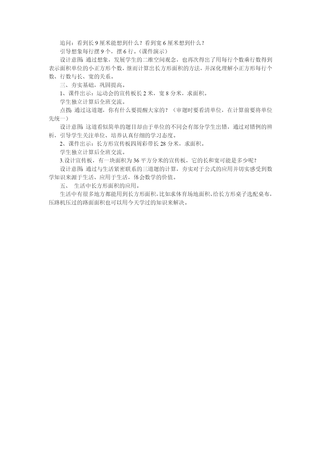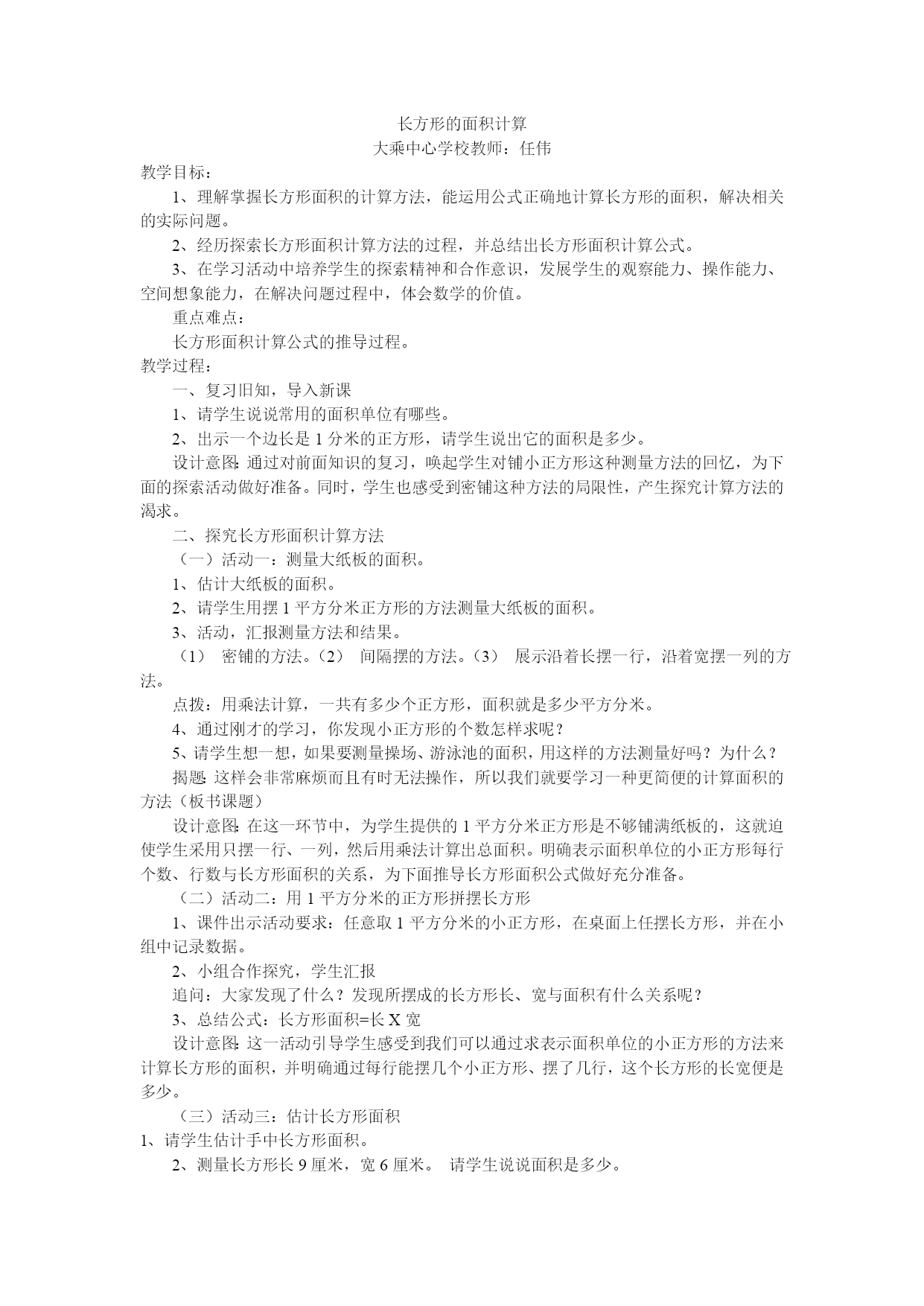 长方形的面积计算 大乘中心学校教师:任伟 教学目标: 1、理解掌握长方形面积的计算方法,能运用公式正确地计算长方形的面积,解决相关的实际问题。 2、经历探索长方形面积计算方法的过程,并总结出长方形面积计算公式。 3、在学习活动中培养学生的探索精神和合作意识,发展学生的观察能力、操作能力、空间想象能力,在解决问题过程中,体会数学的价值。 重点难点: 长方形面积计算公式的推导过程。 教学过程: 一、复习旧知,导入新课 1、请学生说说常用的面积单位有哪些。 2、出示一个边长是1分米的正方形,请学生说出它的面积是多少。 设计意图:通过对前面知识的复习,唤起学生对铺小正方形这种测量方法的回忆,为下面的探索活动做好准备。同时,学生也感受到密铺这种方法的局限性,产生探究计算方法的渴求。 二、探究长方形面积计算方法 (一)活动一:测量大纸板的面积。 1、估计大纸板的面积。 2、请学生用摆1平方分米正方形的方法测量大纸板的面积。 3、活动,汇报测量方法和结果。 (1)密铺的方法。(2)间隔摆的方法。(3)展示沿着长摆一行,沿着宽摆一列的方法。 点拨:用乘法计算,一共有多少个正方形,面积就是多少平方分米。 4、通过刚才的学习,你发现小正方形的个数怎样求呢? 5、请学生想一想,如果要测量操场、游泳池的面积,用这样的方法测量好吗?为什么? 揭题:这样会非常麻烦而且有时无法操作,所以我们就要学习一种更简便的计算面积的方法(板书课题) 设计意图:在这一环节中,为学生提供的1平方分米正方形是不够铺满纸板的,这就迫使学生采用只摆一行、一列,然后用乘法计算出总面积。明确表示面积单位的小正方形每行个数、行数与长方形面积的关系,为下面推导长方形面积公式做好充分准备。 (二)活动二:用1平方分米的正方形拼摆长方形 1、课件出示活动要求:任意取1平方分米的小正方形,在桌面上任摆长方形,并在小组中记录数据。 2、小组合作探究,学生汇报 追问:大家发现了什么?发现所摆成的长方形长、宽与面积有什么关系呢? 3、总结公式:长方形面积=长X宽 设计意图:这一活动引导学生感受到我们可以通过求表示面积单位的小正方形的方法来计算长方形的面积,并明确通过每行能摆几个小正方形、摆了几行,这个长方形的长宽便是多少。 (三)活动三:估计长方形面积 1、请学生估计手中长方形面积。 2、测量长方形长9厘米,宽6厘米。请学生说说面积是多少。 追问:看到长9厘米能想到什么?看到宽6厘米想到什么? 引导想象每行摆9个,摆6行。(课件演示) 设计意图:通过想象,发展学生的二维空间观念,也再次得出了用每行个数乘行数得到表示面积单位的小正方形个数,继而计算出长方形面积的方法,并深化理解小正方形每行个数、行数与长、宽的关系。 三、夯实基础,巩固提高。 1、课件出示:运动会的宣传板长2米,宽8分米,求面积。 学生独立计算后全班交流。 点拨:通过这道题,你有什么要提醒大家的?(审题时要看清单位,在计算前要将单位先统一) 设计意图:这道看似简单的题目却由于单位的不同会有部分学生出错,通过对错例的辨析,引导学生关注单位、培养认真仔细的学习态度。 2、课件出示:长方形宣传板四周彩带长28分米,求面积。 学生独立计算后全班交流。 3.设计宣传板,有一块面积为36平方分米的宣传板,它的长和宽可能是多少呢? 设计意图:通过与生活紧密联系的三道题的计算,夯实对于公式的应用并切实感受到数学知识来源于生活、应用于生活,体会数学的价值。 五、生活中长方形面积的应用。 生活中有很多地方都能用到长方形面积,比如求体育场地面积、给长方形桌子选配桌布,压路机压过的路面面积也可以用今天学过的知识来解决。