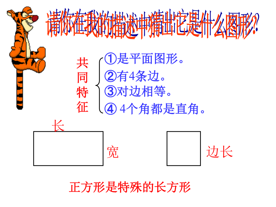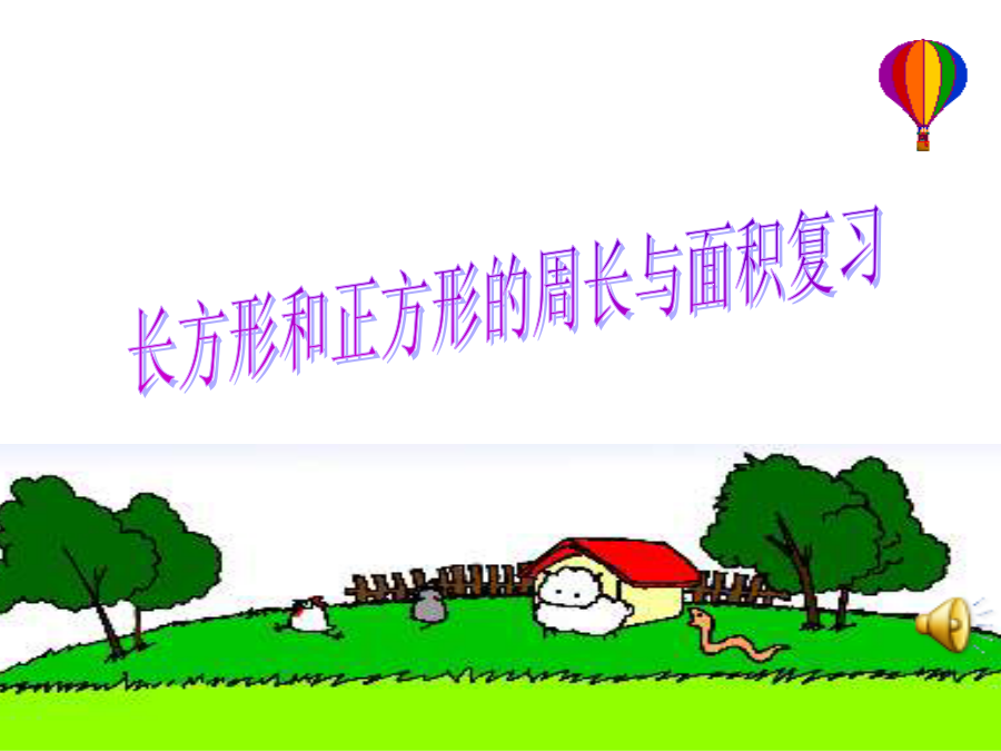 请你在我的描述中猜出它是什么图形?猜一猜周长一条线,面积一大片。学 习 的 内 容1、什么是周长?长方形和正方形周长的计算:第一关(1)小明家的客厅面积有18() (2)小红身高155() (3)一本故事书的封面约有300() (4)黑板的长约是36() (5)一张报纸的面积大约是35() (6)学校操场面积大约是2600() (7)一棵大树高约10()1、一张桌子的桌面长85厘米,宽40厘米,它的面积是多少平方厘米?周长是多少厘米?2、一个正方形的边长是8厘米,求它的周长和面积。算出下表各个图形的周长和面积3、一个长方形彩纸,长是7分米,宽比长短3分米,这张纸的面积是多少?3、一个长方形彩纸,长是7分米,宽比长短3分米,这张纸的面积是多少?4、一个长方形花坛的长是20米,宽是10分米。这个花坛的面积是多少?(2)一个长方形的长是15米,是宽的3倍, 这个长方形的周长是多少米?1、判断。(对的打“√”,错的打“×”)第二关(2)用4个同样大小的长方形拼成下面两幅图。 图A与图B的周长相等吗?为什么?1、张大伯家用篱笆围上两个羊圈,都近视正方形,如下图所示。 ①第一个篱笆长48米,羊圈占地面积是多少平方米? ②第二个篱笆长48米,这个羊圈占地面积是多少平方米?周长相等的长方形和正方形,正方形的面积最大。第三关跳跳虎想靠墙用篱笆围一个花圃,怎样围用的篱笆最少?